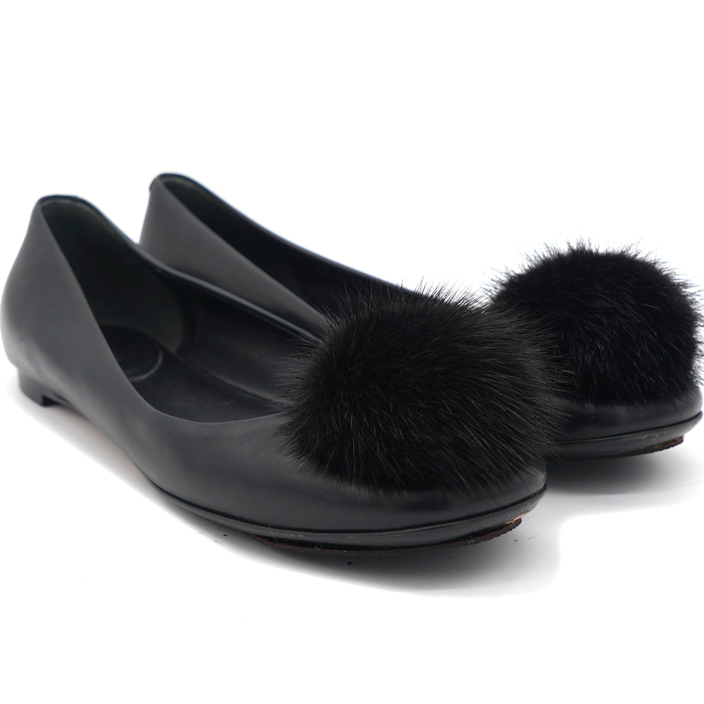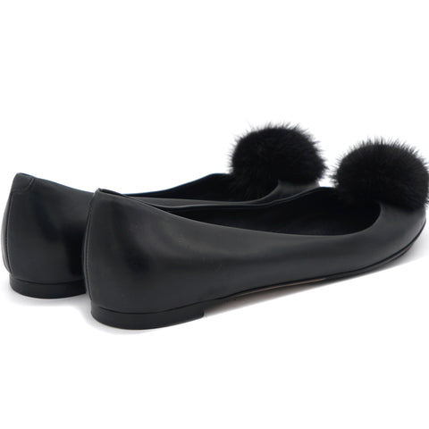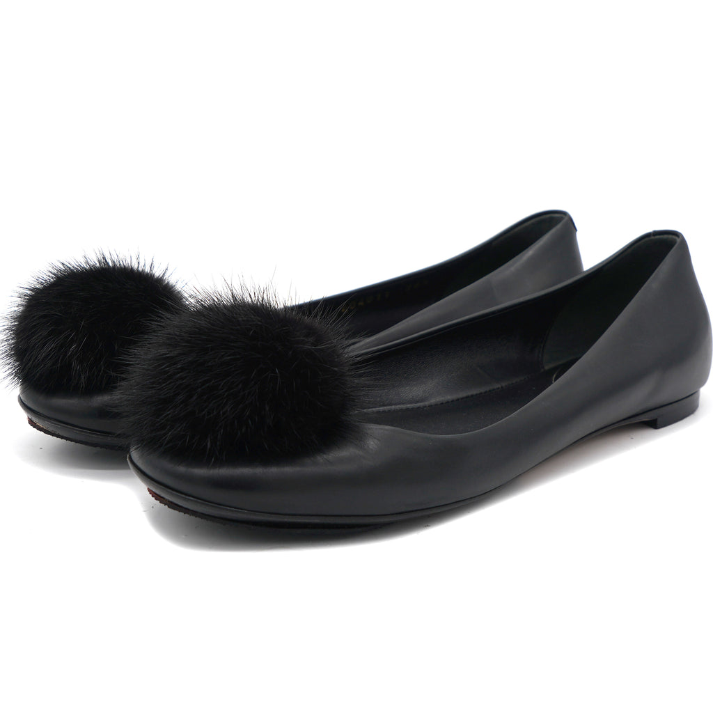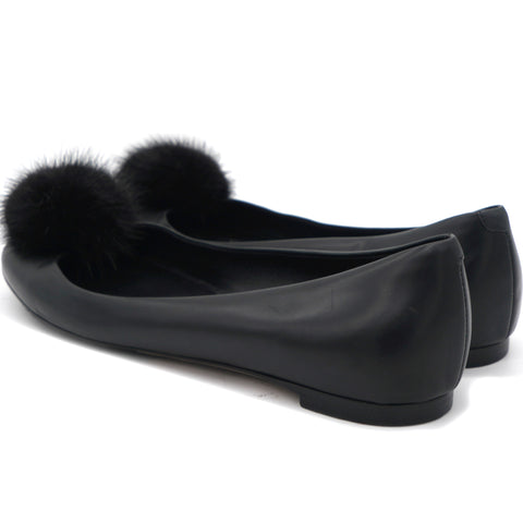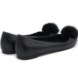 Black Calfskin Leather Pom Pom Ballet Flats Size 36.5