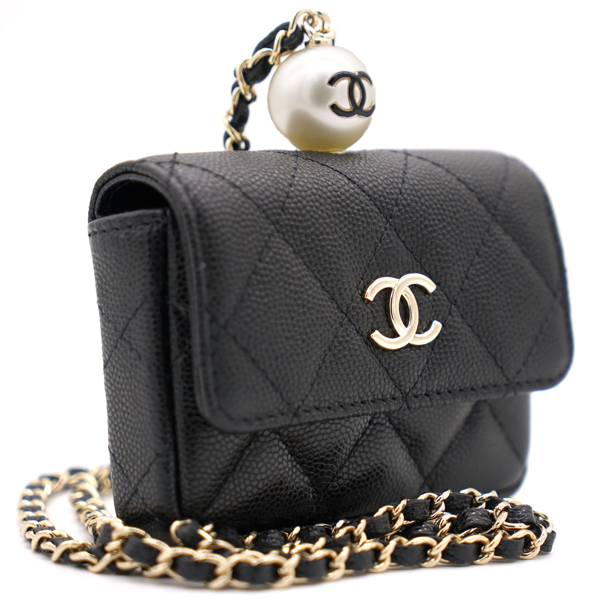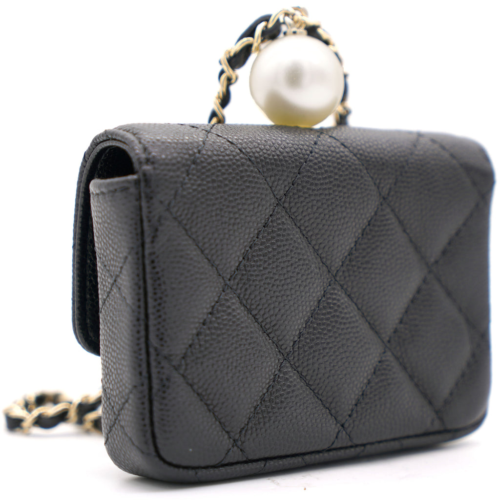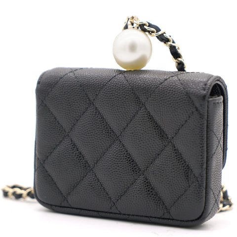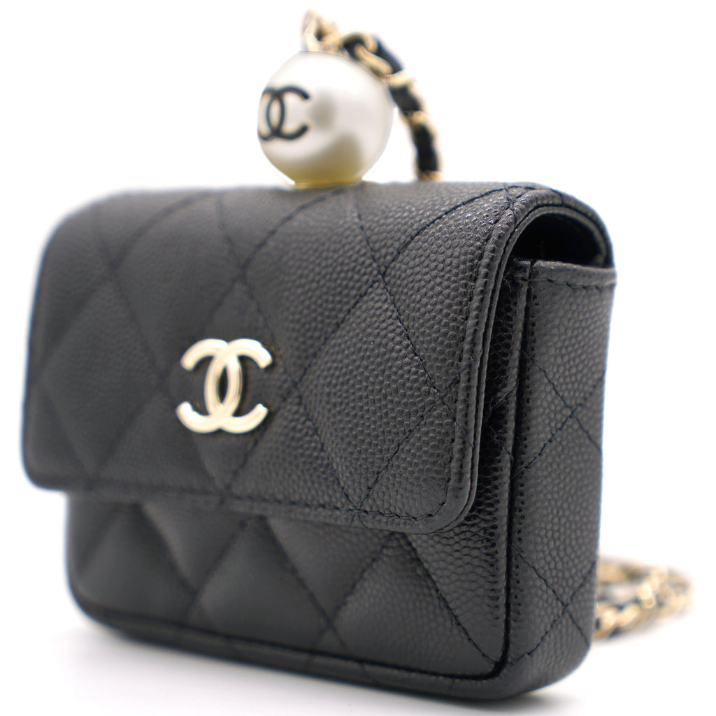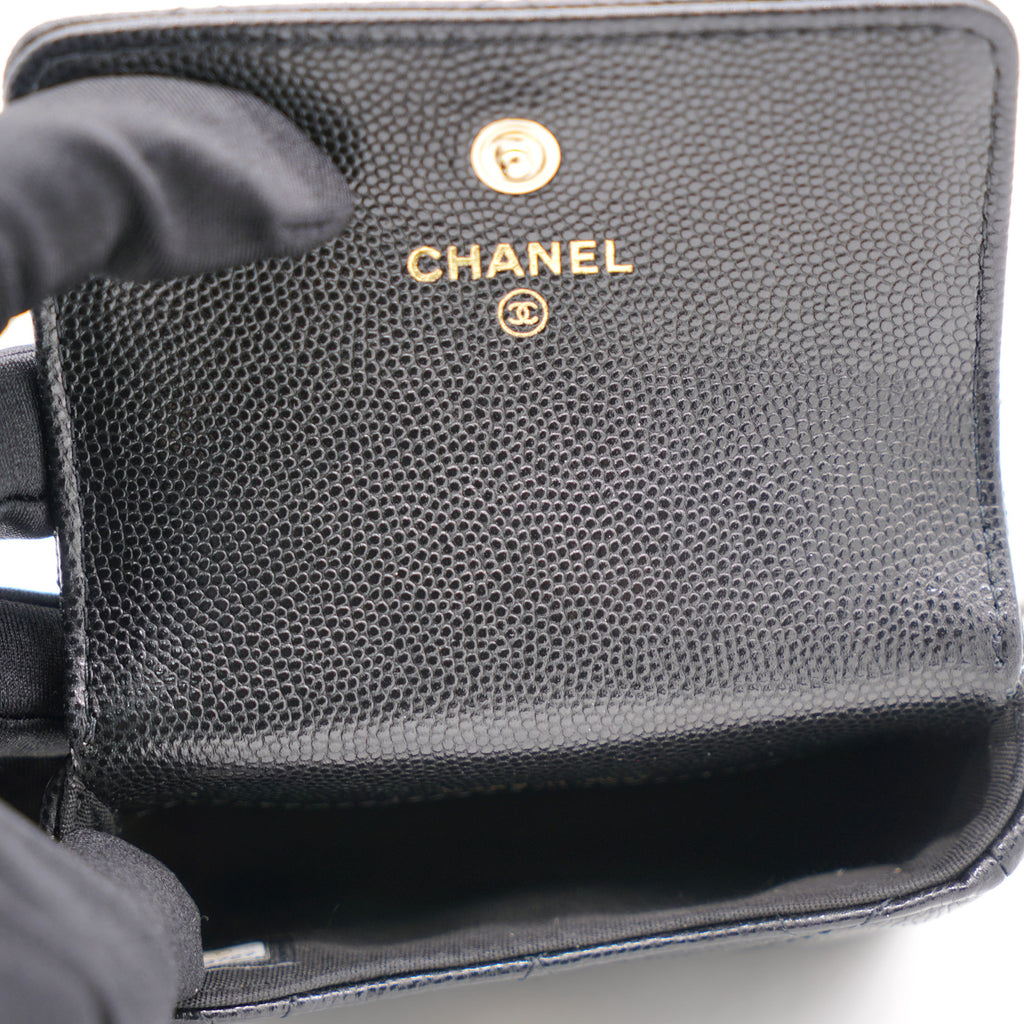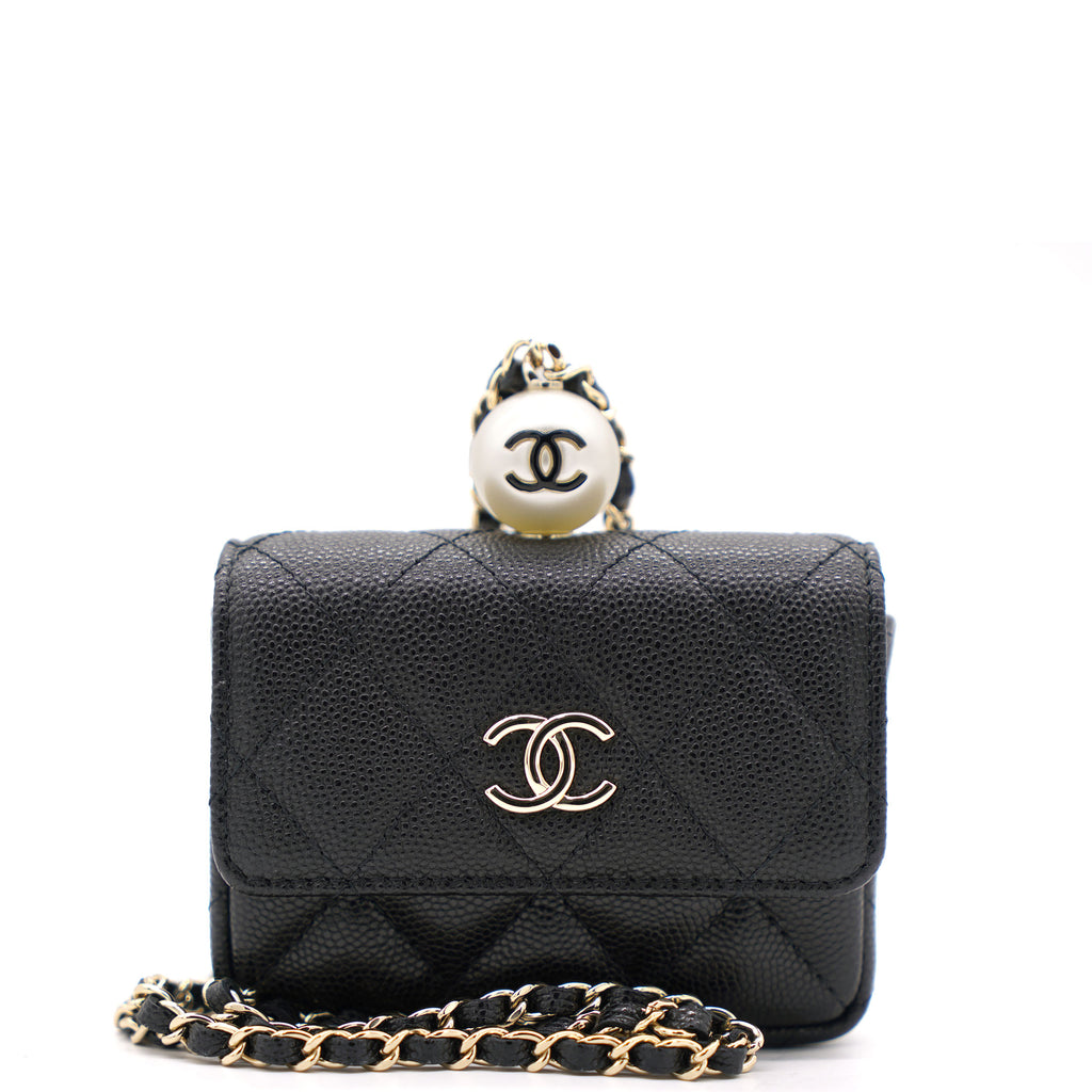 | This cardholder from Chanel is absolutely gorgeous to look at! Crafted from caviar leather in black, it features the signature quilts, the signature CC logo on the front flap, beautiful pearl with CC logo and an intertwined chain link for you to parade it in style. Organize your essentials in accordion style with this beautiful creation. |
