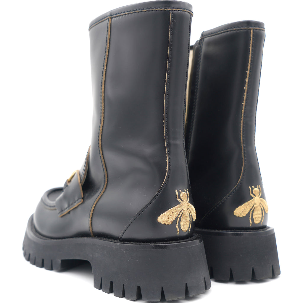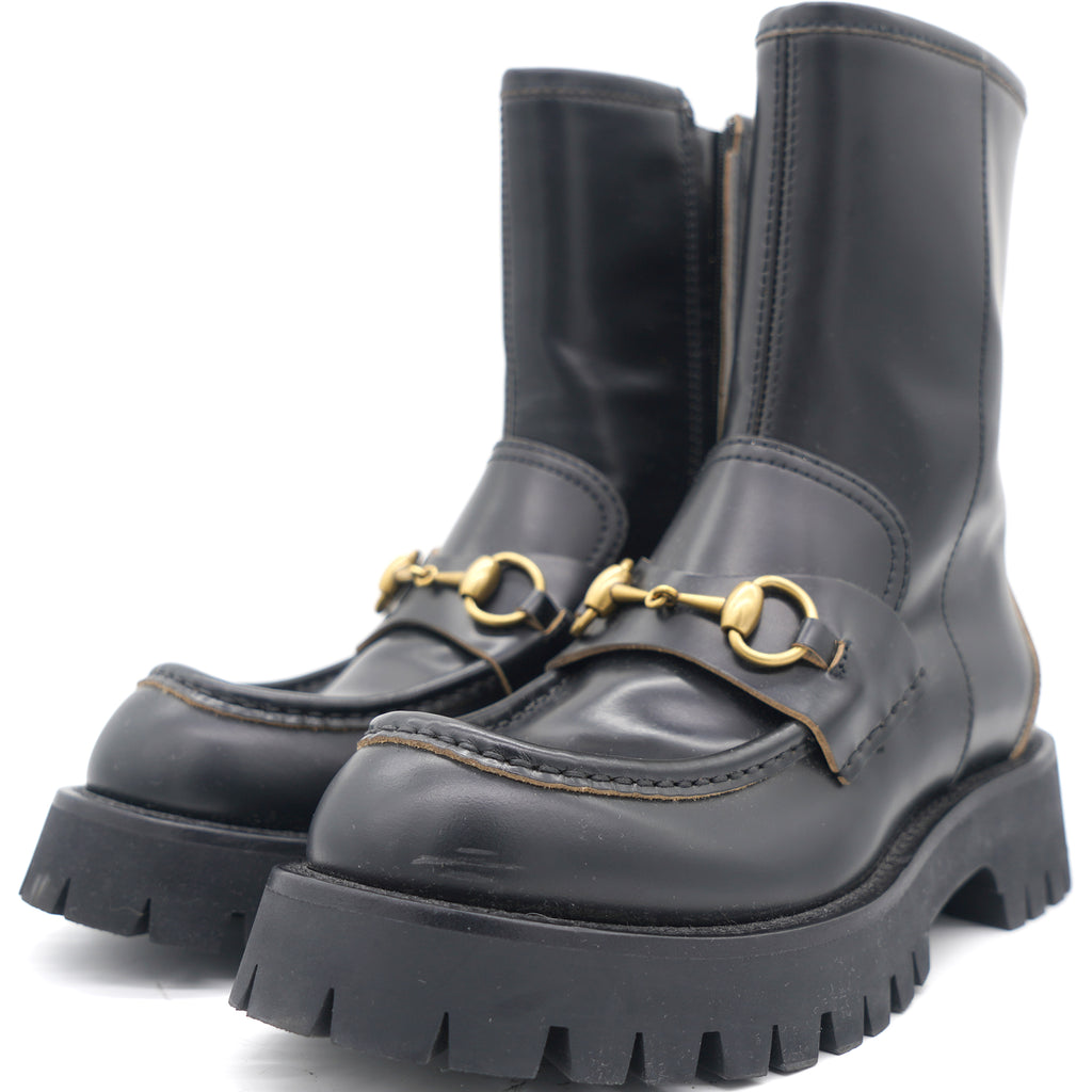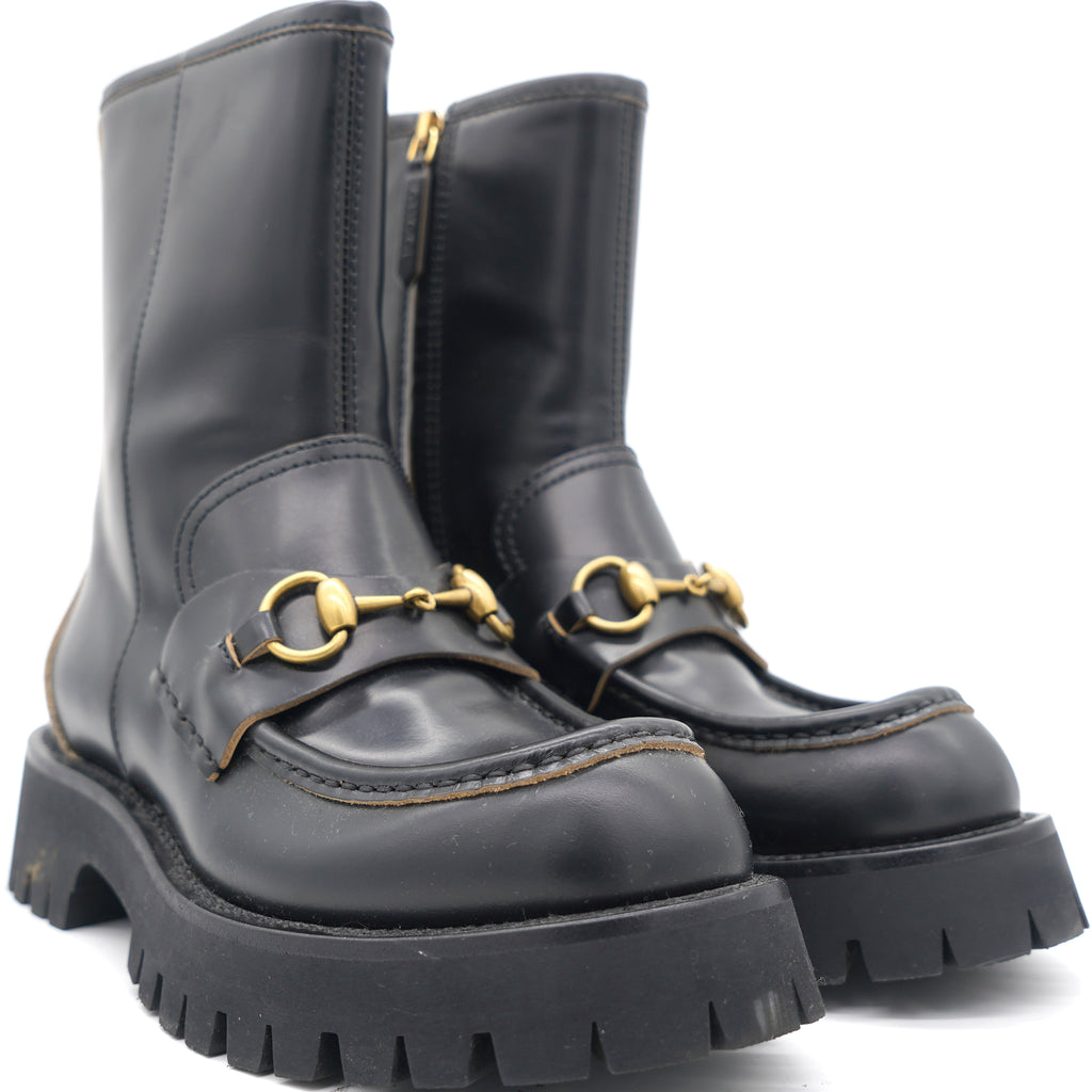 | Add a touch of military style with these ankle boots from Gucci. Crafted from leather, they feature round toes and horse bit buckles at vamps. The shaft is zipped for ease in wearing and the insoles are lined with leather. |