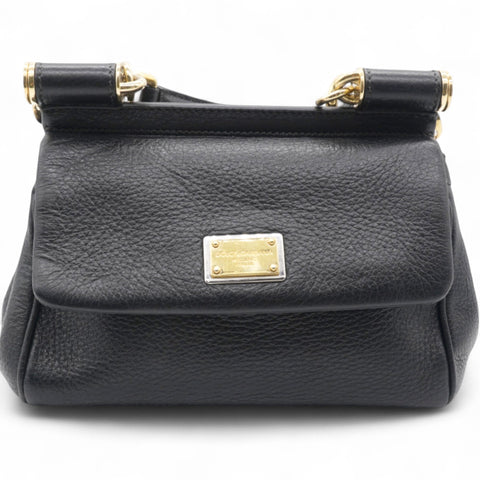 | This luxe Mini Miss Sicily Bag by Dolce and Gabbana is perfect to wear on both daytime and evening occasions. Crafted from smooth grained leather, it is accented with a polished gold Dolce and Gabbana plate, a shoulder strap, back zip pocket and a single handle. The interior is lined with leopard print canvas and features a zip pocket and a patch pocket. |