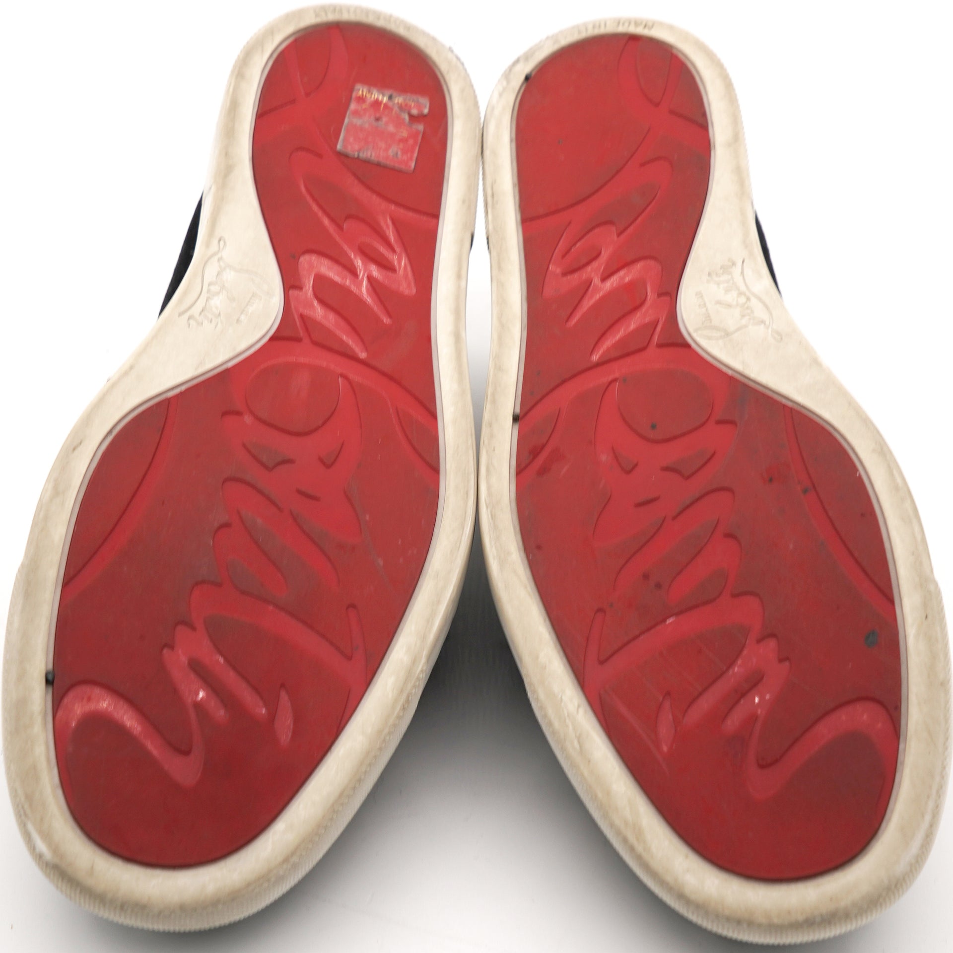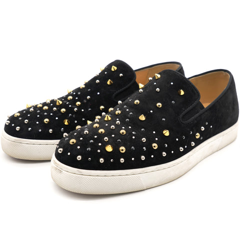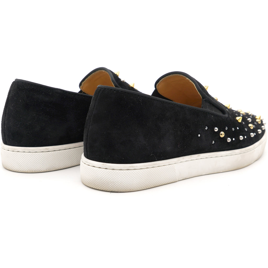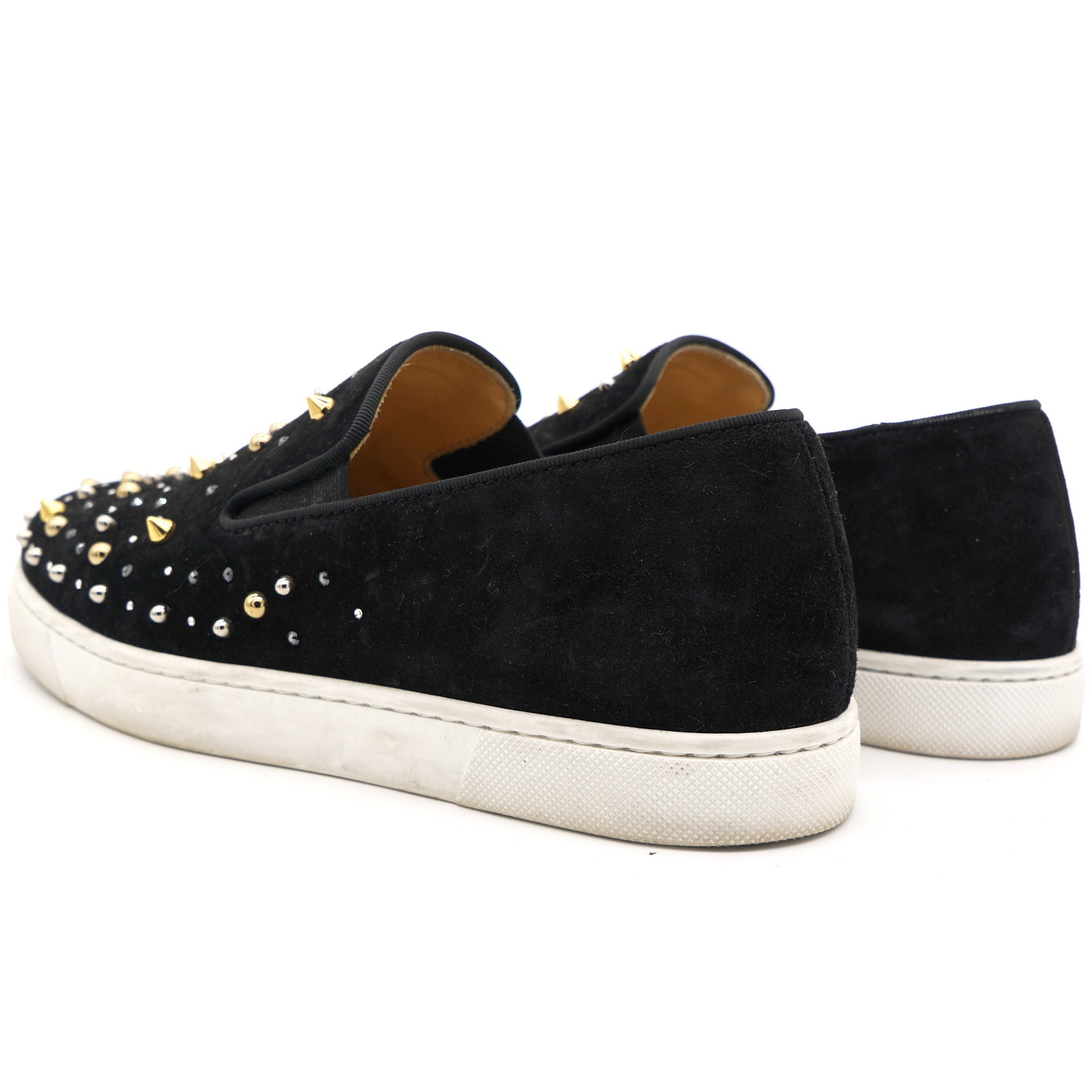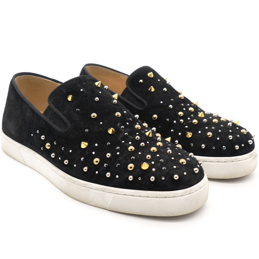 | Make an amazing style statement in these slip-on sneakers from Christian Louboutin. They have been crafted from black suede and styled with round toes. They are adorned with multiple spike embellishments on the exterior and come equipped with comfortable leather-lined insoles and the signature red-lacquered soles. |