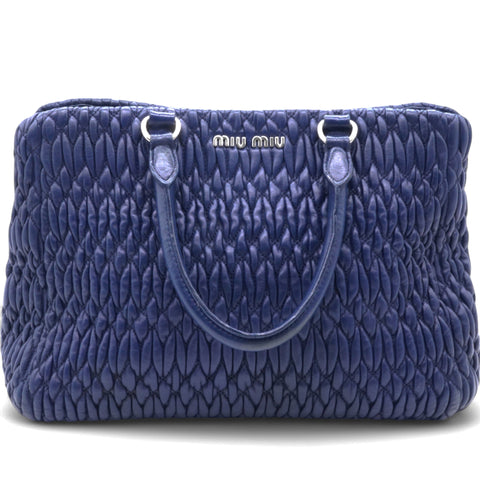 | This chic and feminine handbag is from Miu Miu. The bag is crafted from leather in their signature Matelasse pattern and features a snap button that opens up to a satin-lined interior sized to fit your daily essentials. The bag is equipped with two top handles for you to parade it. Flaunt this beauty wherever you go and you'll surely receive admiring glances. |