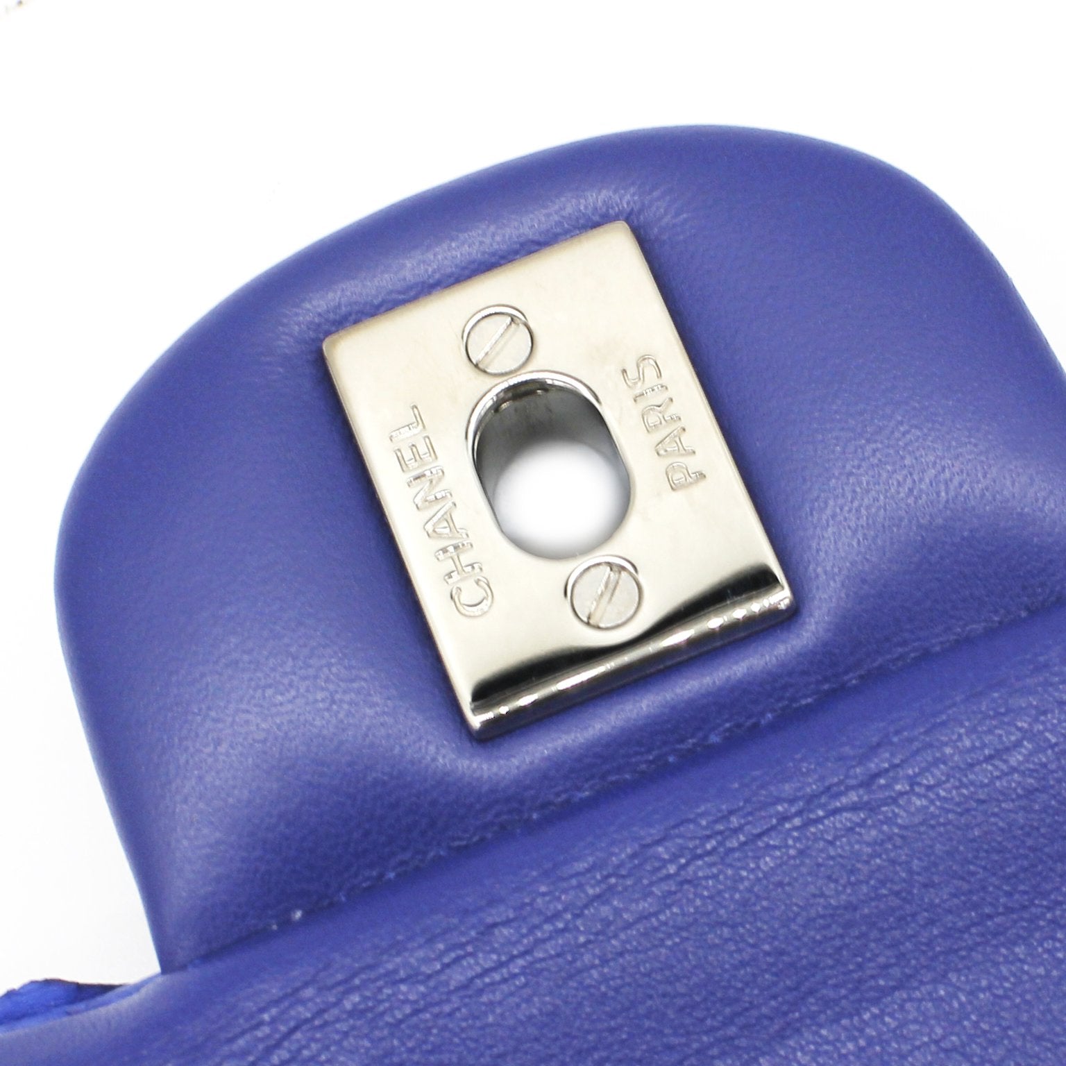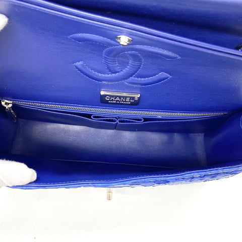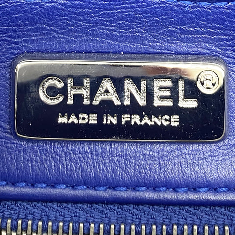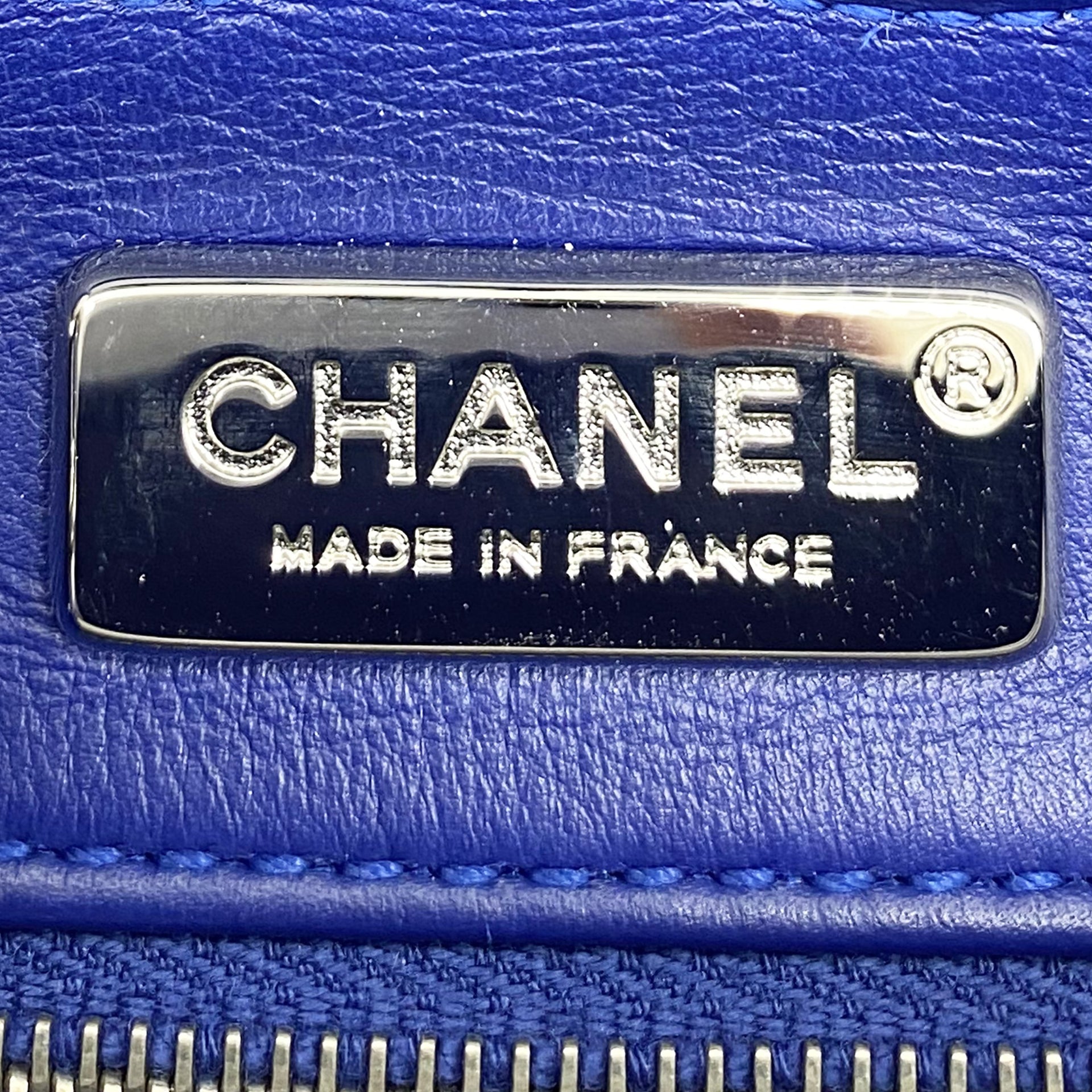 Interior Material:   Blue matte leather lining with one main compartment, a zipper pocket with Chanel pull and an open pocket.