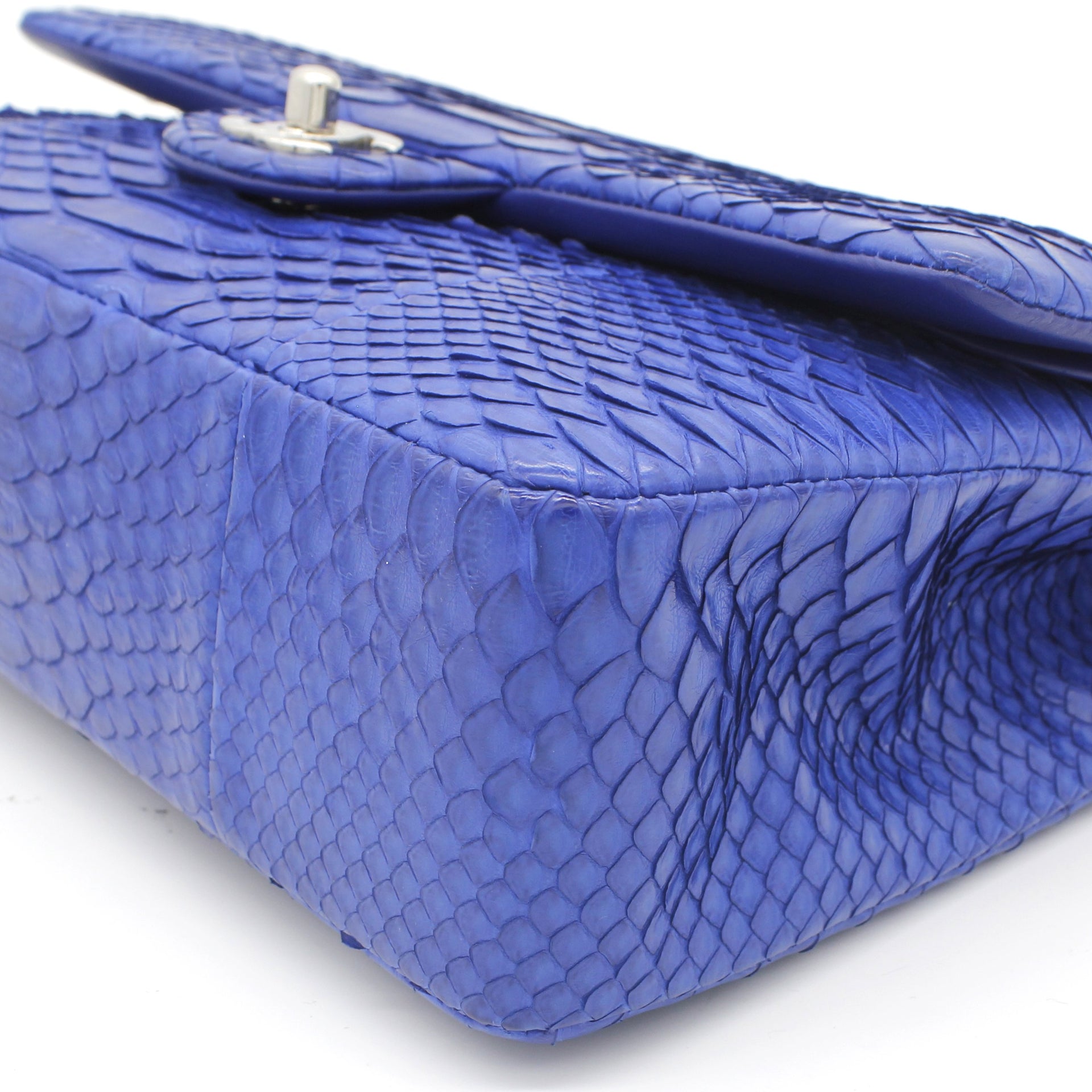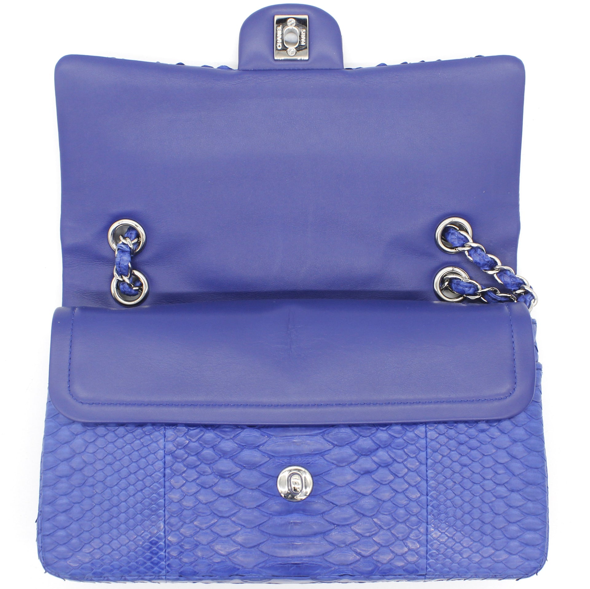 Made in France, this medium double flap chain shoulder bag was fashioned from blue snack leather. It features a leather shoulder strap, adorned with a silver-tone chain, and a main foldover top that is closed by a CC turnlock. As it opens, it leads to a second, smaller flap, fastened by a snap button. It presents us to a luxurious blue interior, embellished with a stitched logo and a logo metal stamp. The compartment has one slip pockets, one zipper pocket and an internal logo stamp. Functional, the accessory displays a front slip pocket, hidden under the double flaps, and another one open on the back.