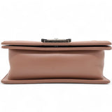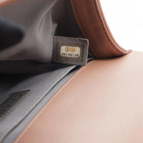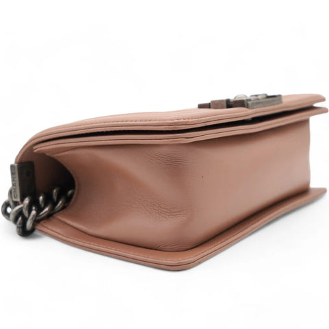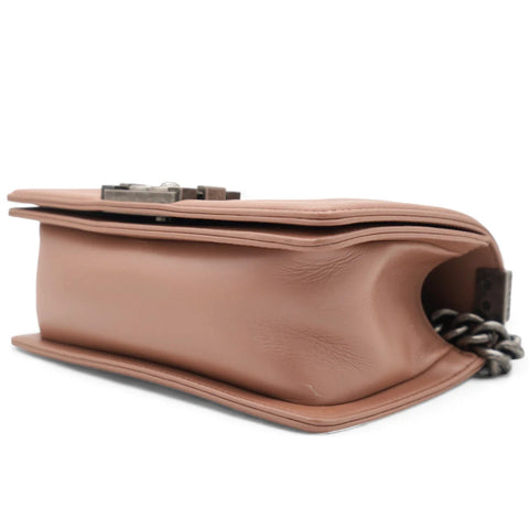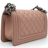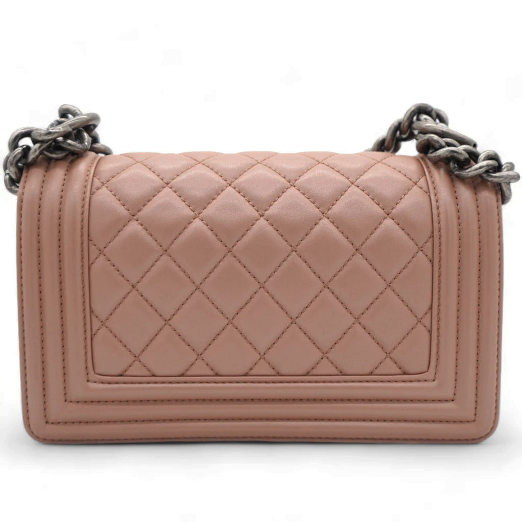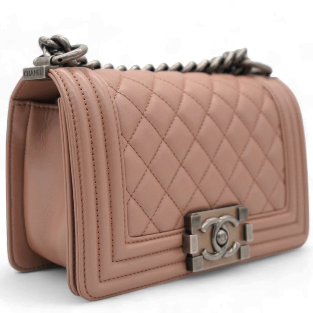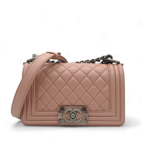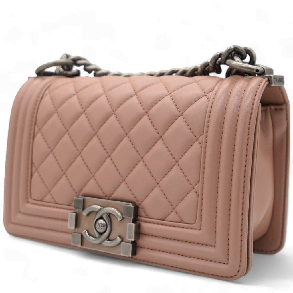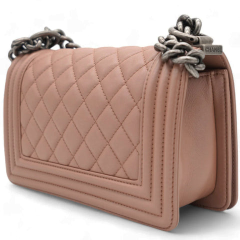 | This stylish Chanel Blush Pink Quilted Boy Bag is made from pastel pink quilted leather. It features a silver-tone CC buckle and a leather and metal chain link strap. The interior is lined with fabric and features a zip pocket. |