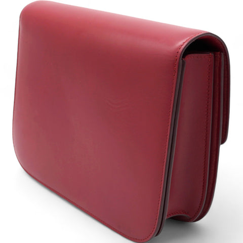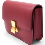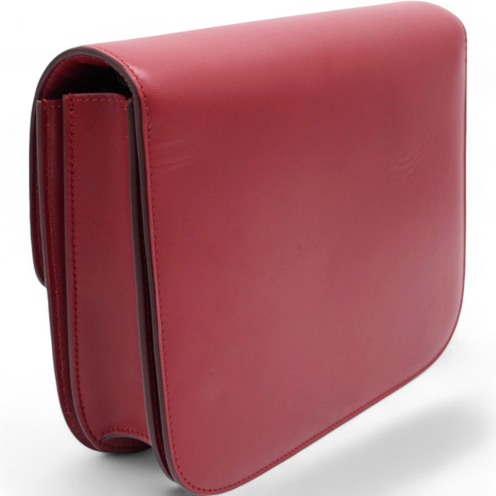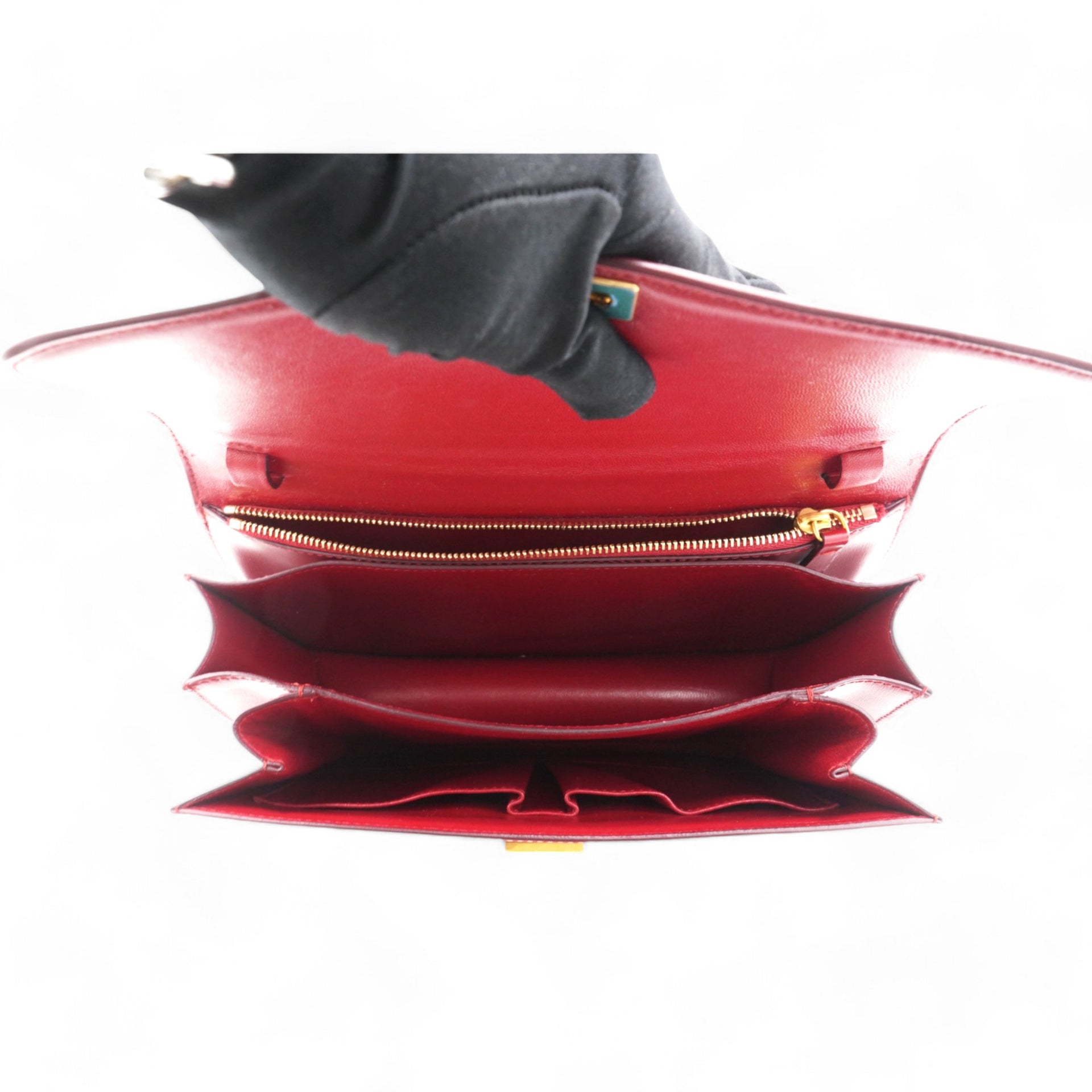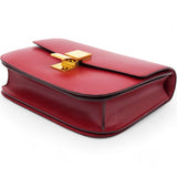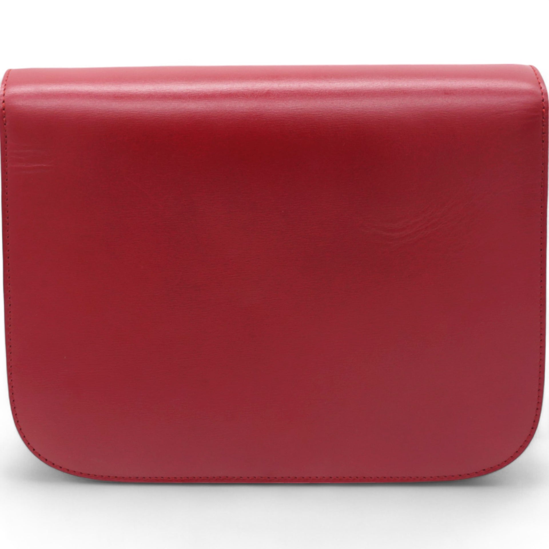 This chic shoulder bag is crafted of box calfskin leather in red. The bag features an adjustable shoulder strap and a front flap with a gold switch-lock. The flap opens to a partitioned leather interior with zipper and patch pockets.