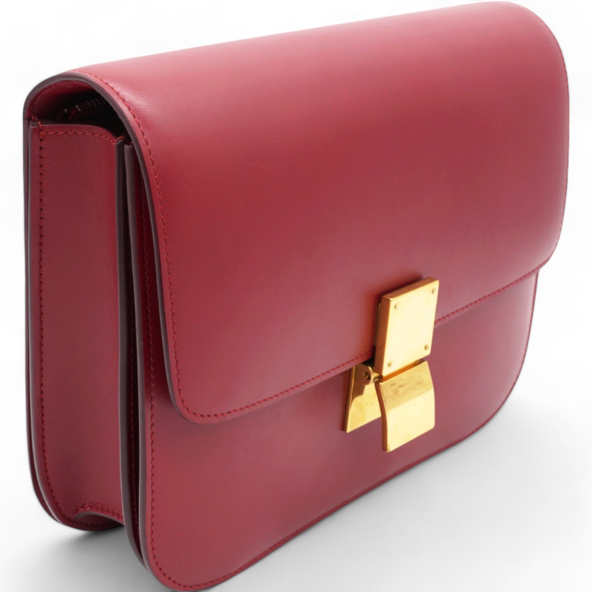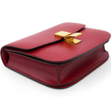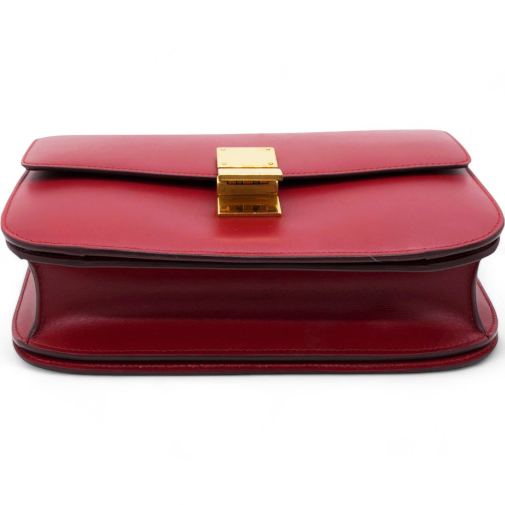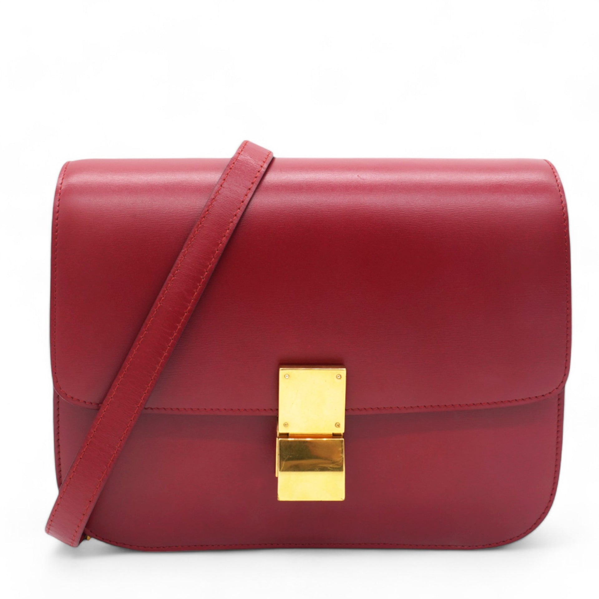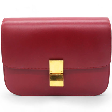 This chic shoulder bag is crafted of box calfskin leather in red. The bag features an adjustable shoulder strap and a front flap with a gold switch-lock. The flap opens to a partitioned leather interior with zipper and patch pockets.