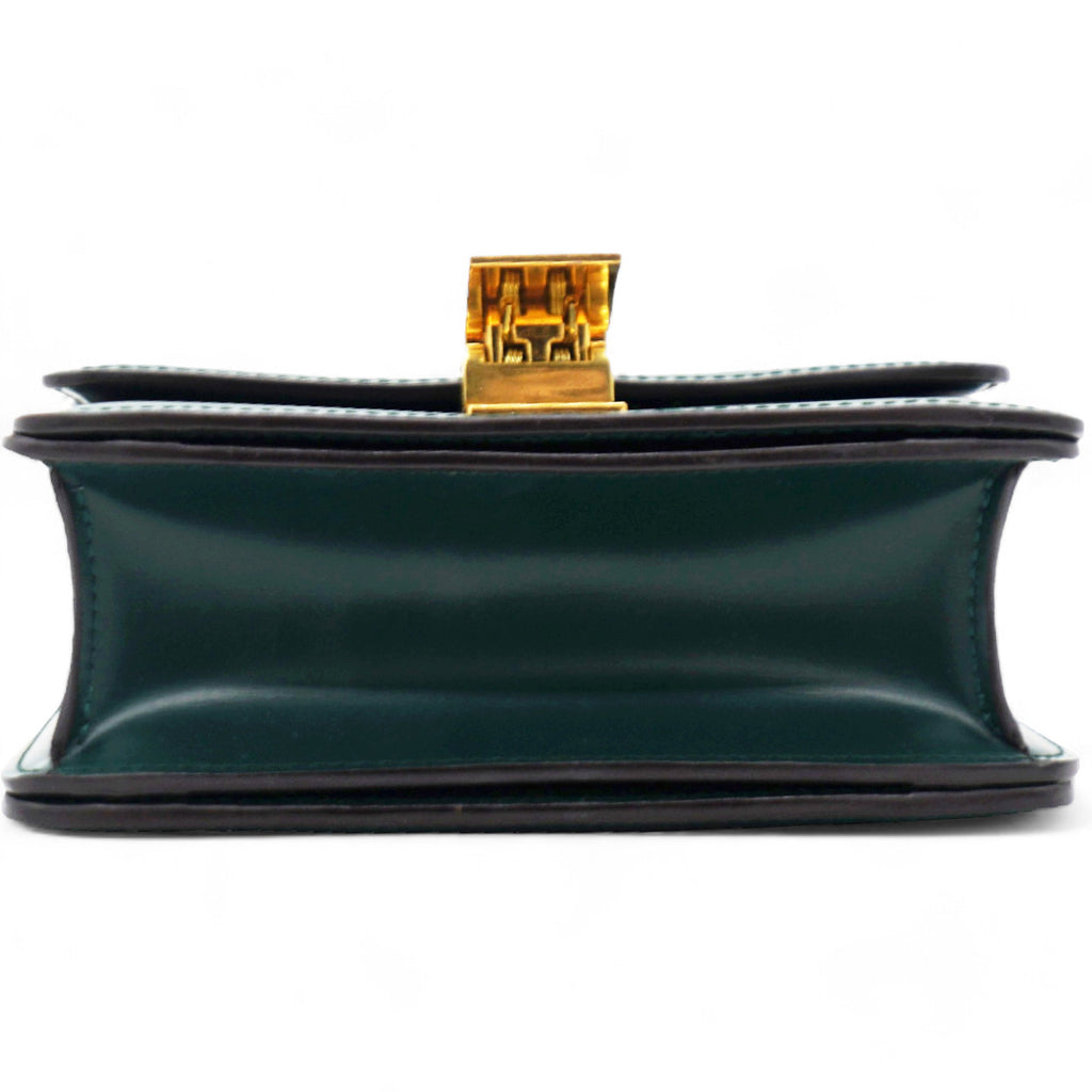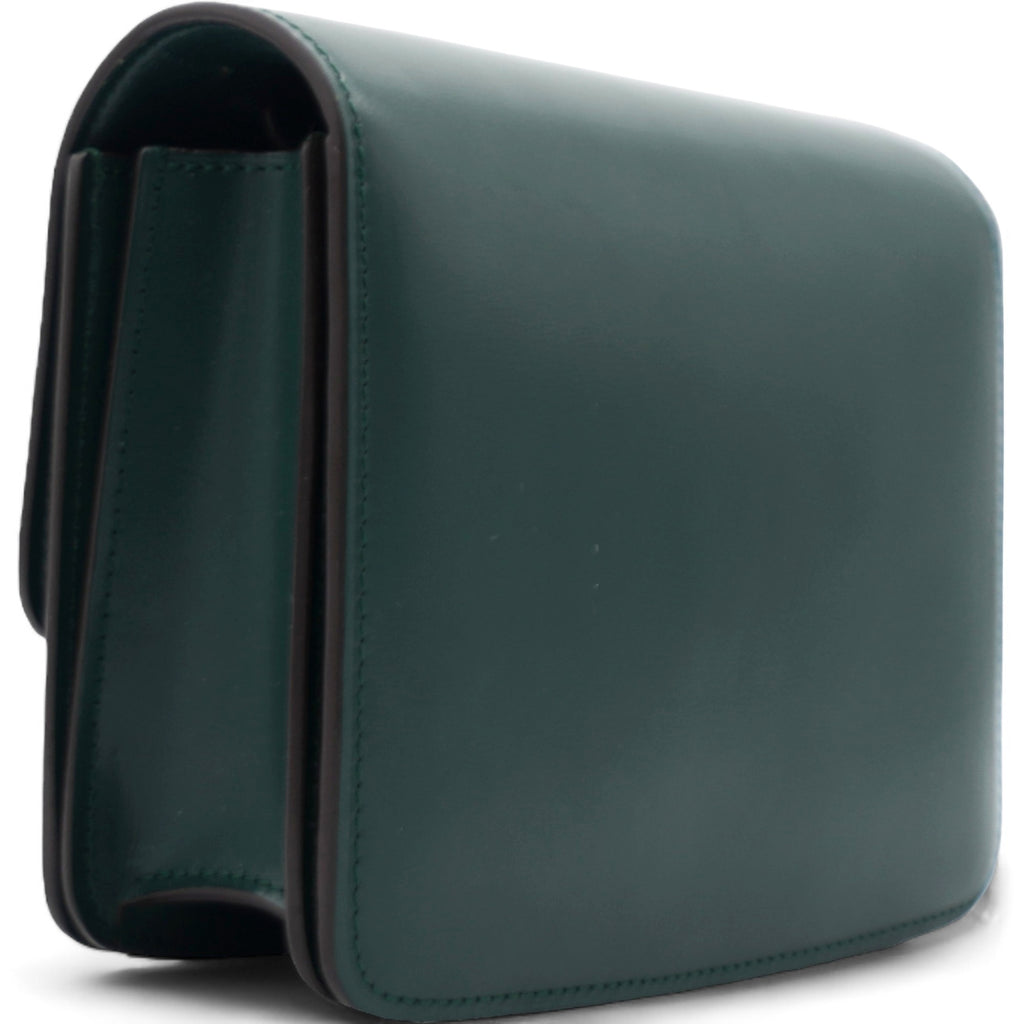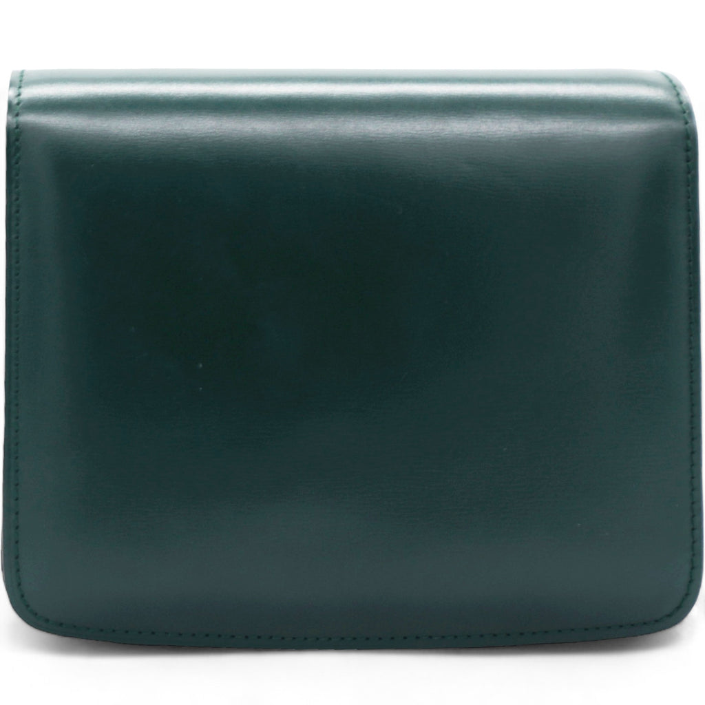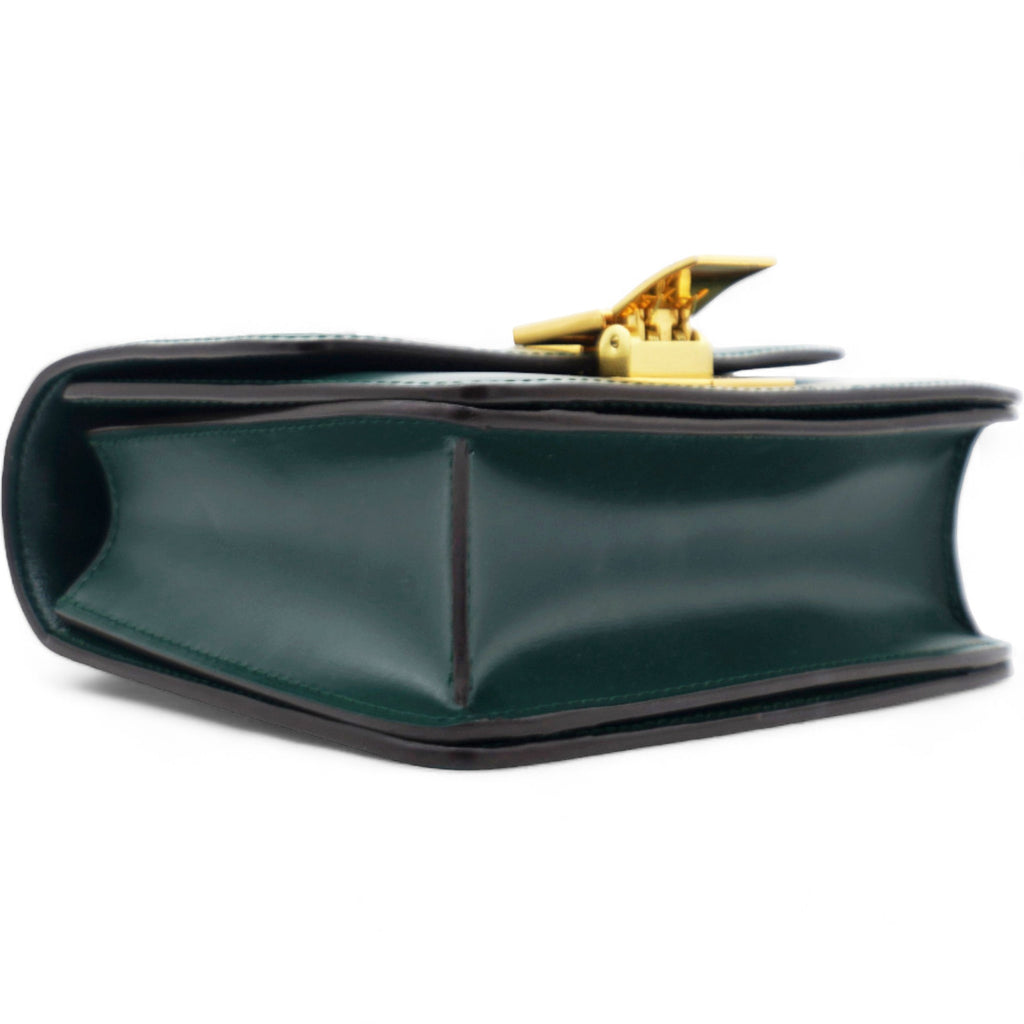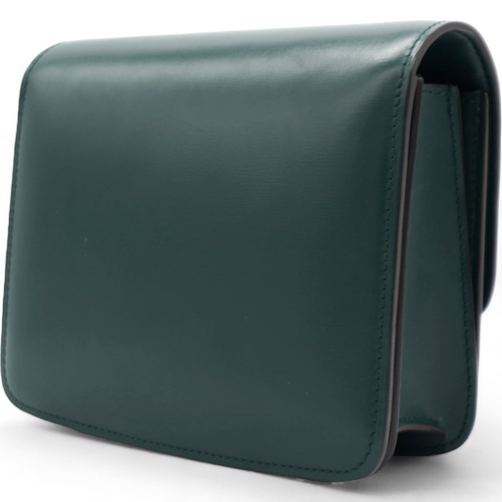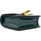 | This chic shoulder bag is crafted of luxuriously smooth dark emerald green box calfskin leather. The bag features a waist-length shoulder strap and a facing flap with a gold switch-lock. The flap opens to a matching green partitioned leather interior with a patch pocket. |