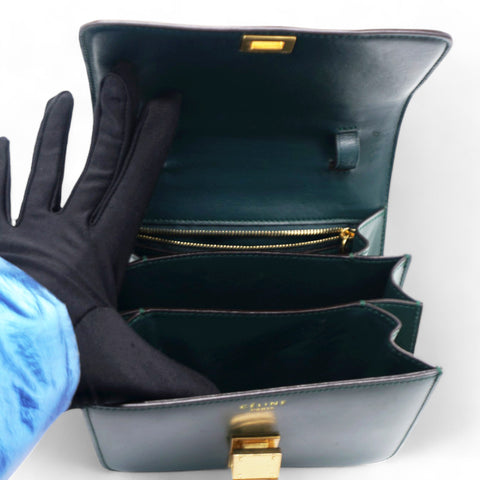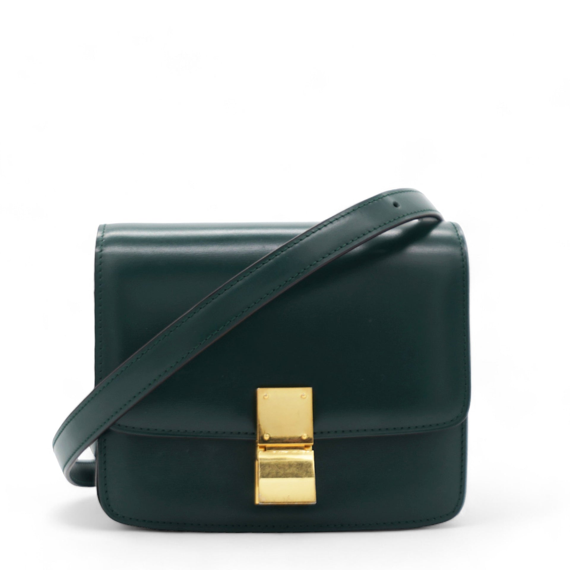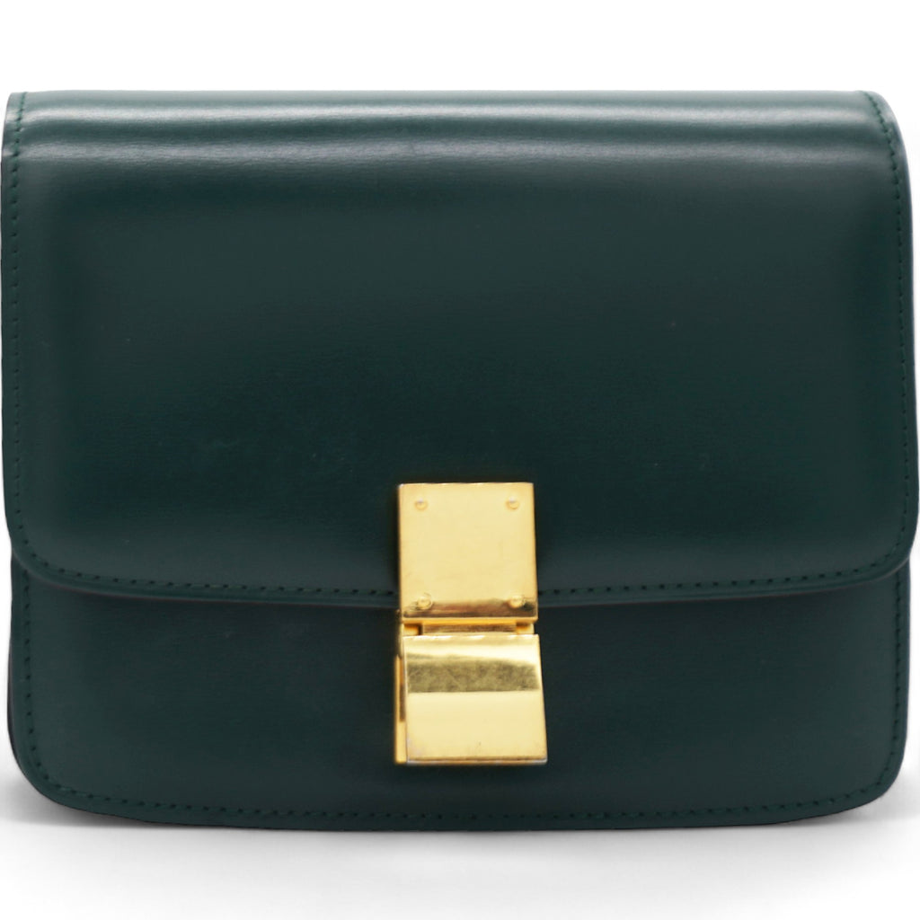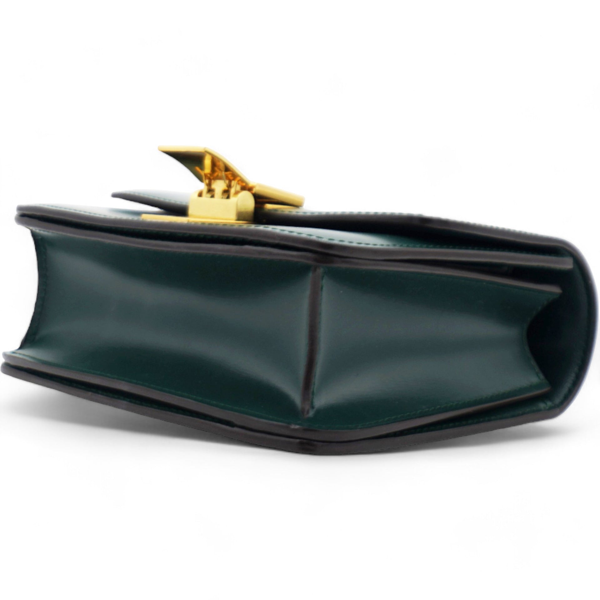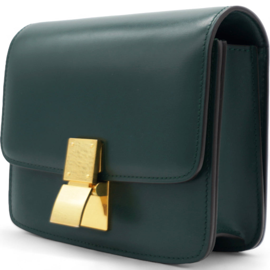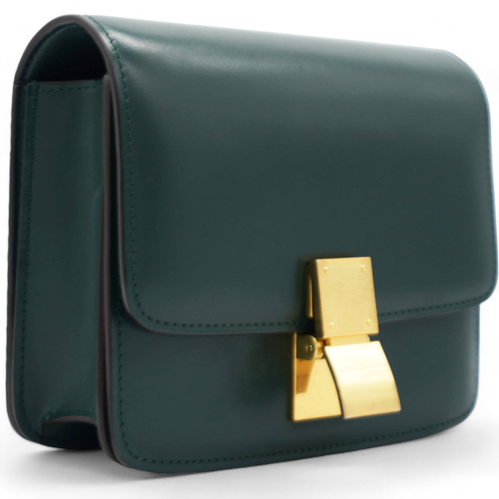 | This chic shoulder bag is crafted of luxuriously smooth dark emerald green box calfskin leather. The bag features a waist-length shoulder strap and a facing flap with a gold switch-lock. The flap opens to a matching green partitioned leather interior with a patch pocket. |