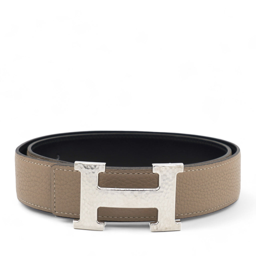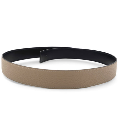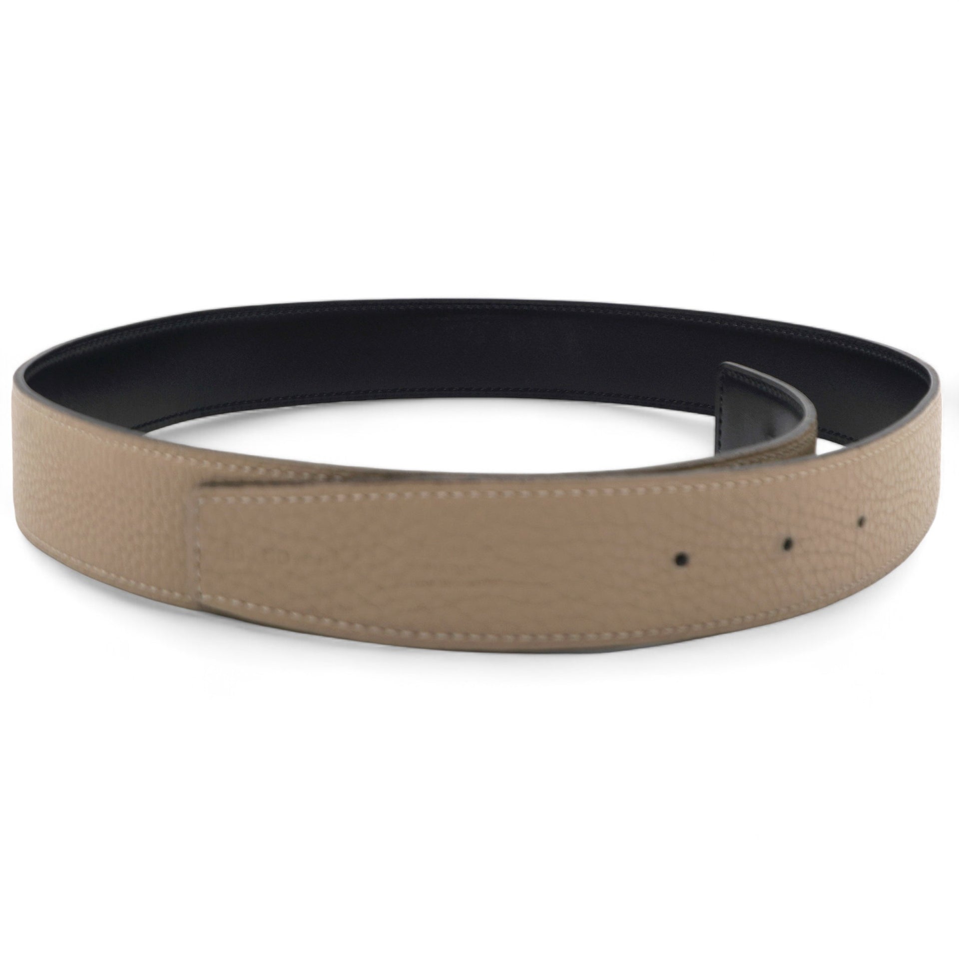 | This super-chic belt is crafted of reversible leather with one side shiny box calfskin leather and the reverse in togo calfskin leather in taupe. This is an excellent belt sure to add a one of a kind look to any outfit, only from Hermes!s!. |