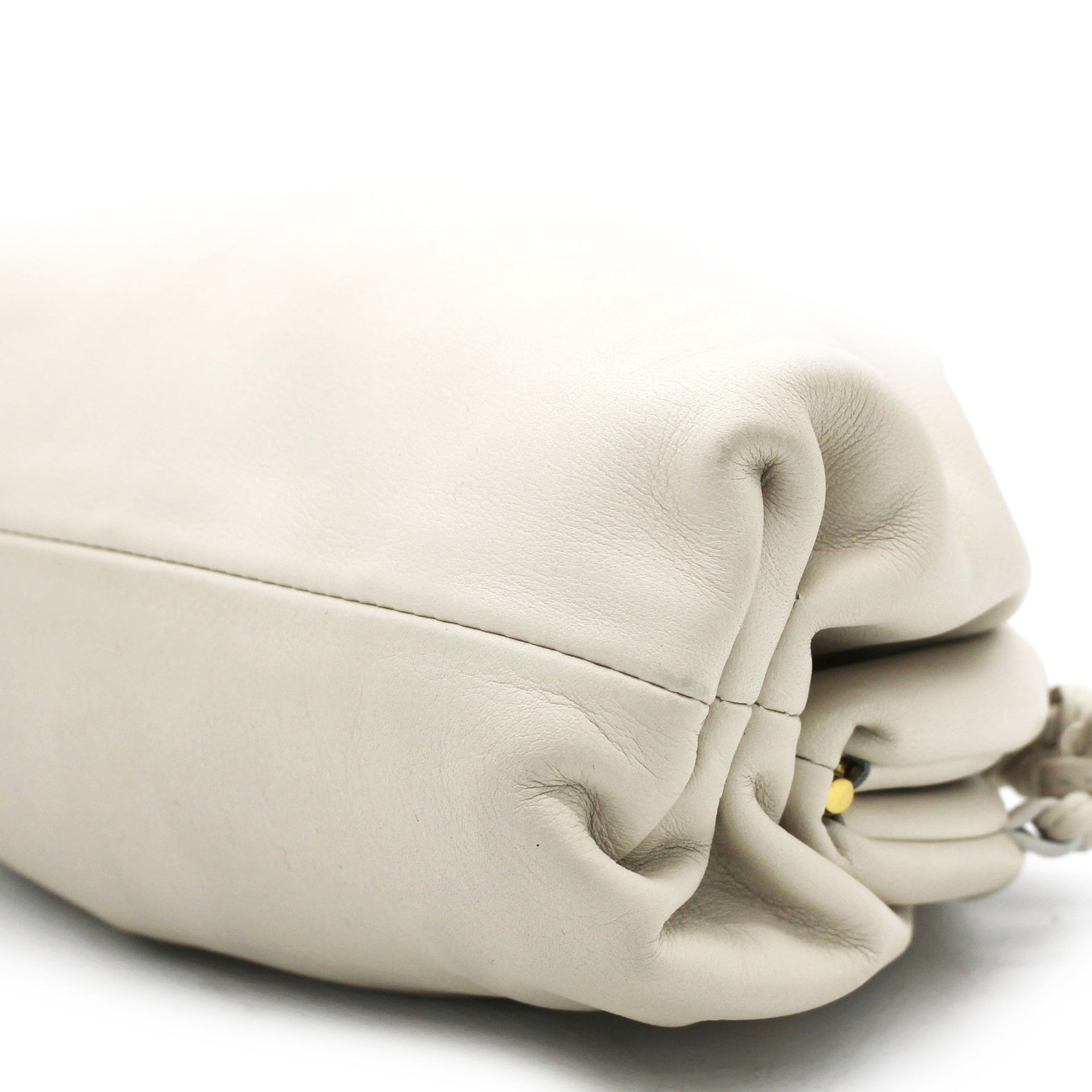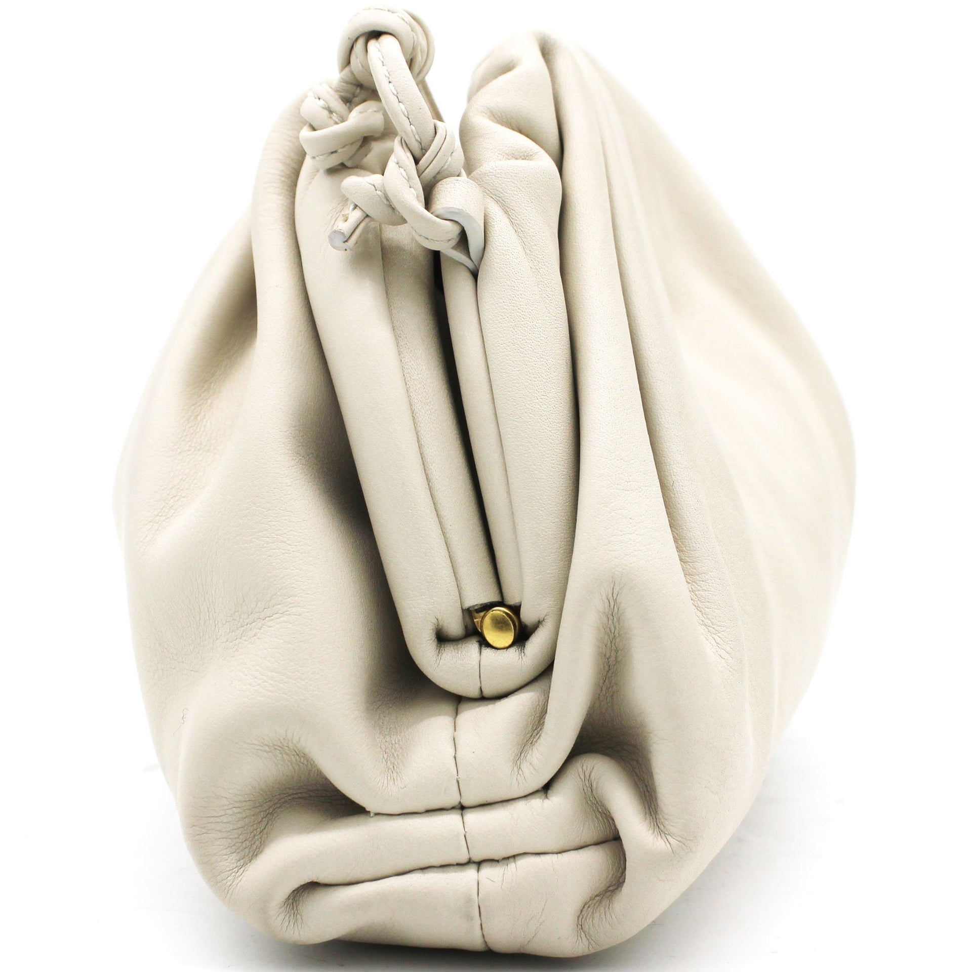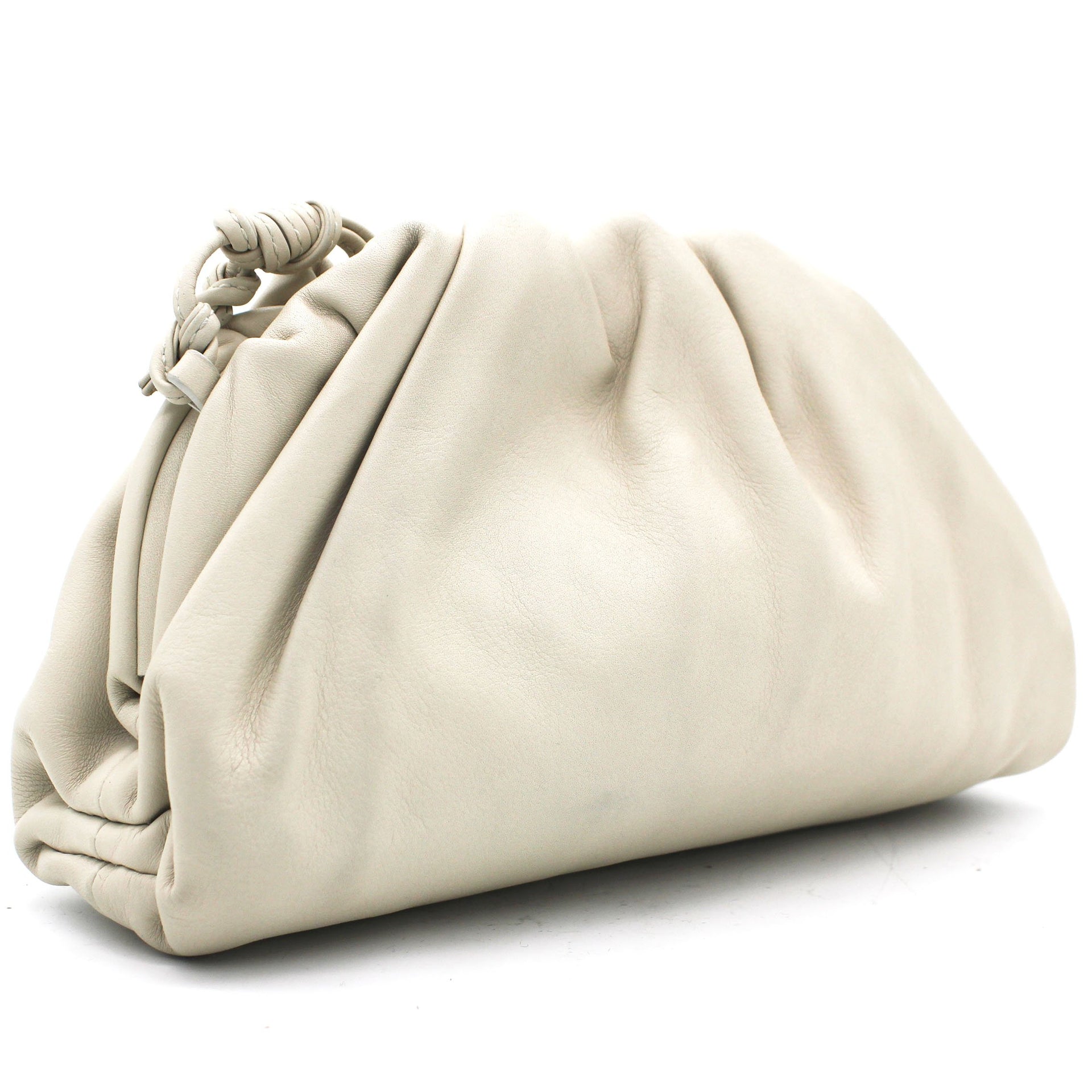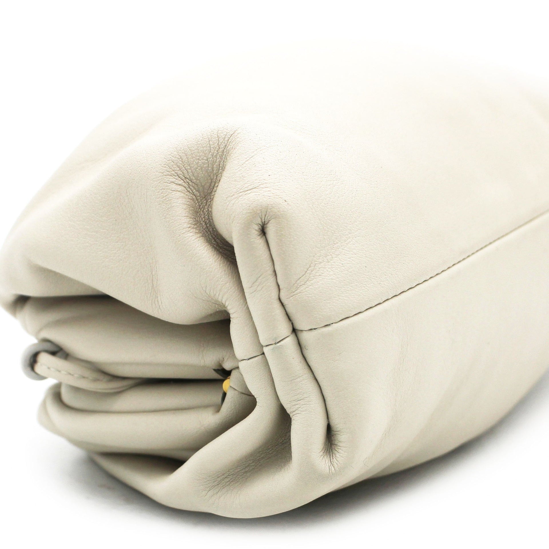 | This ultra-popular clutch is crafted of supple calfskin leather in off white. The bag features a ruched leather magnetic frame top that opens to a matching leather interior. A long thin crossbody strap is accented with signature knotted ends. |