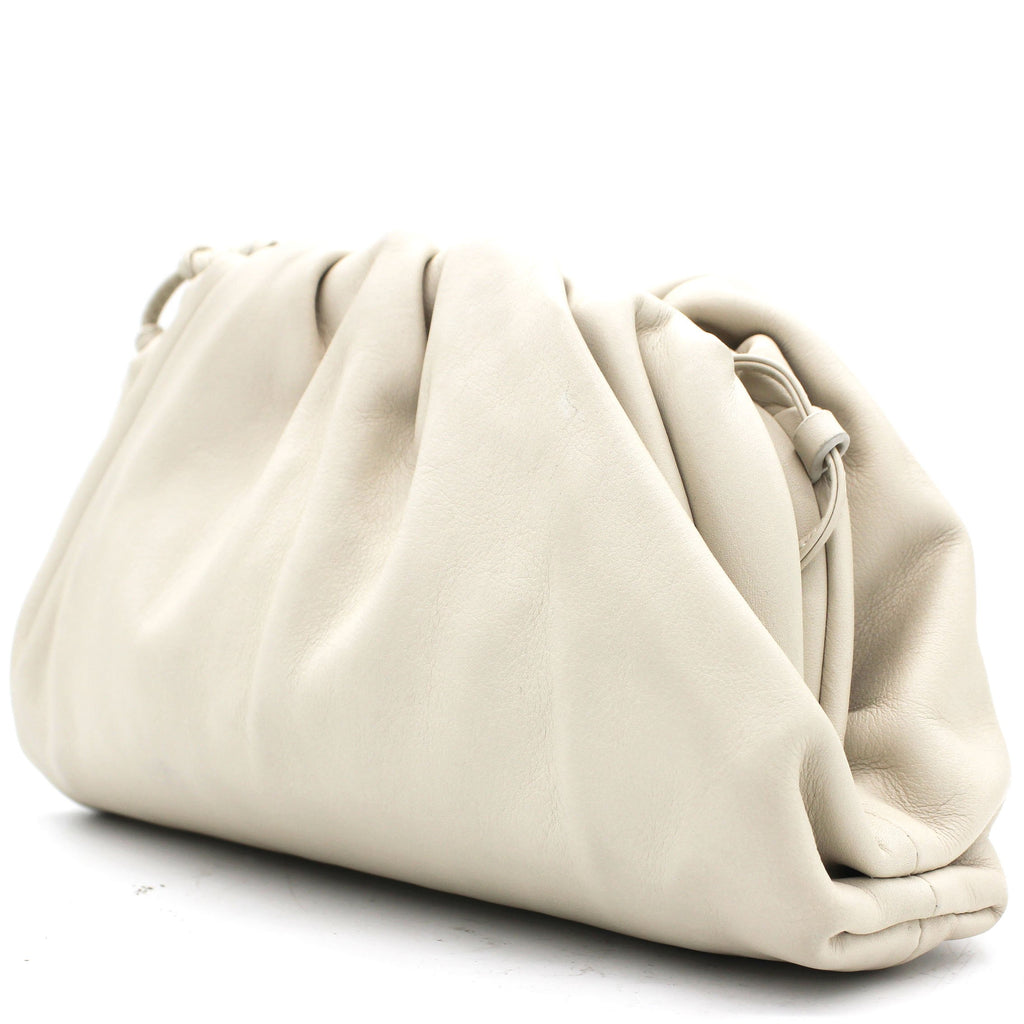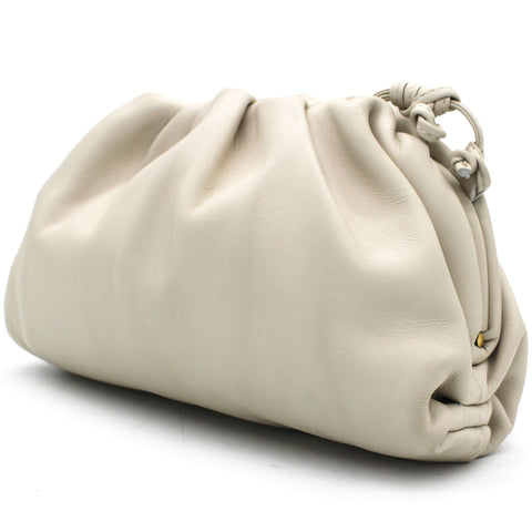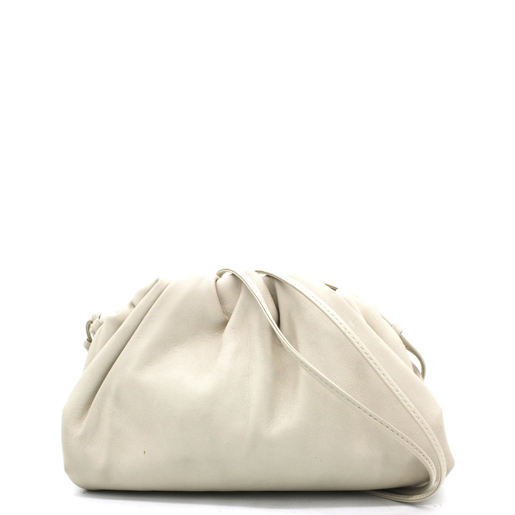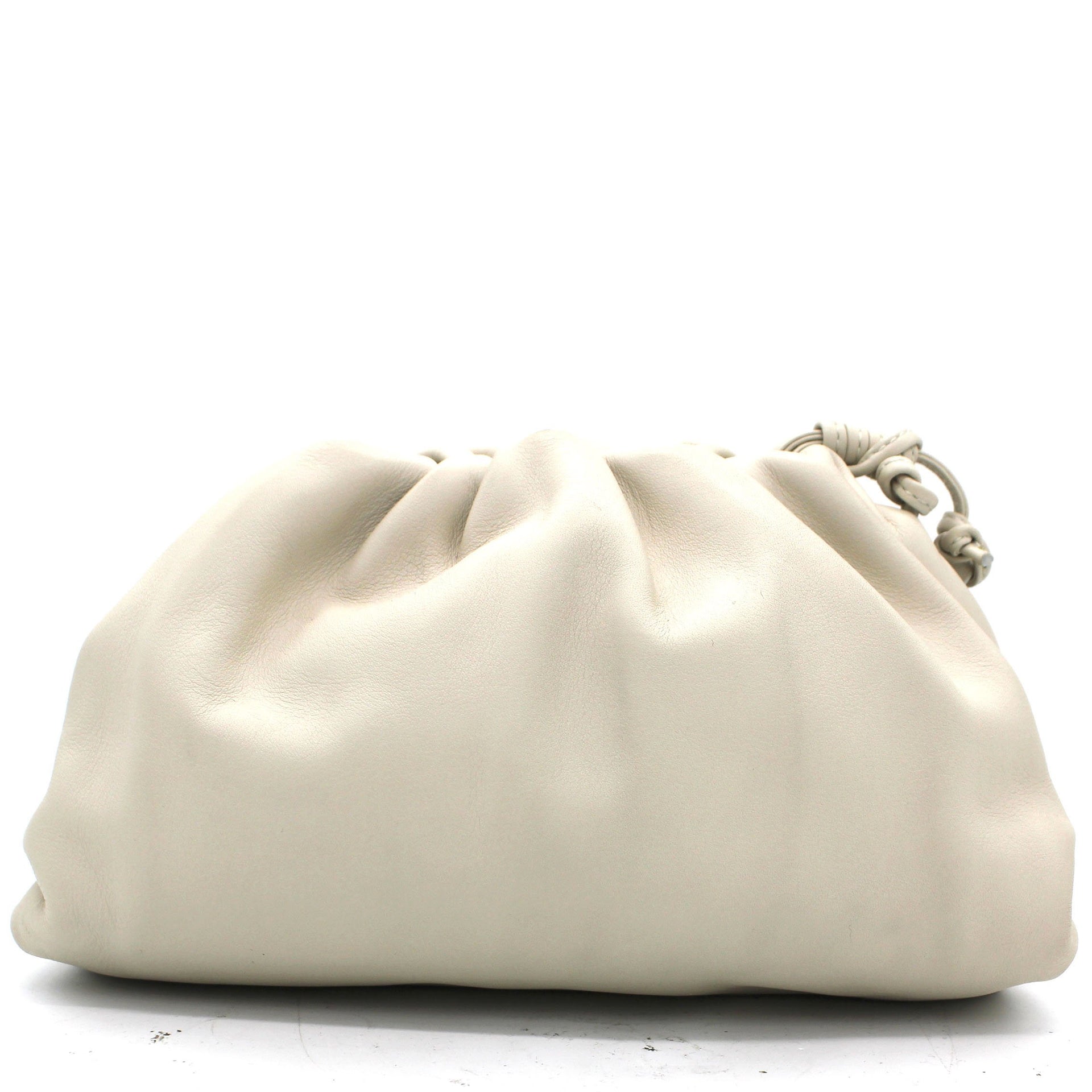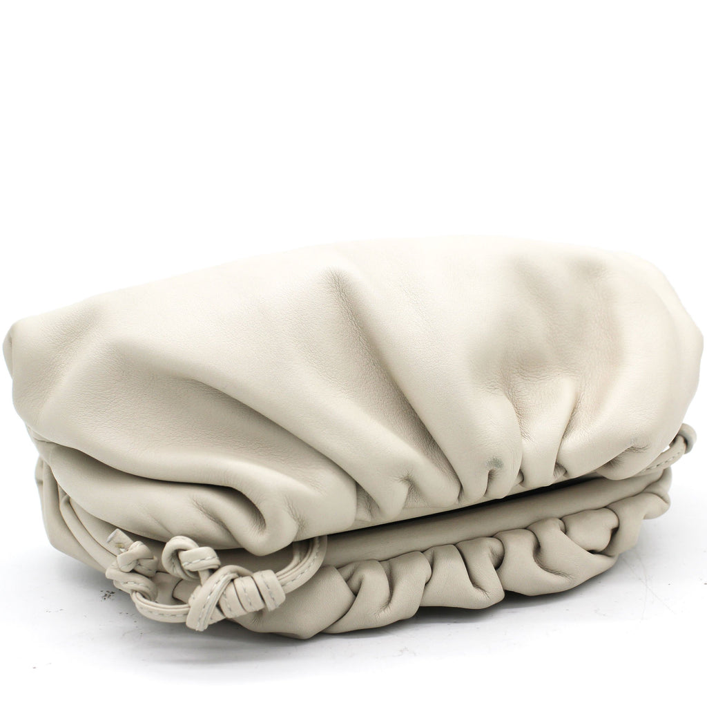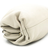 | This ultra-popular clutch is crafted of supple calfskin leather in off white. The bag features a ruched leather magnetic frame top that opens to a matching leather interior. A long thin crossbody strap is accented with signature knotted ends. |