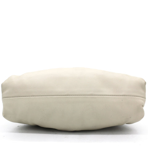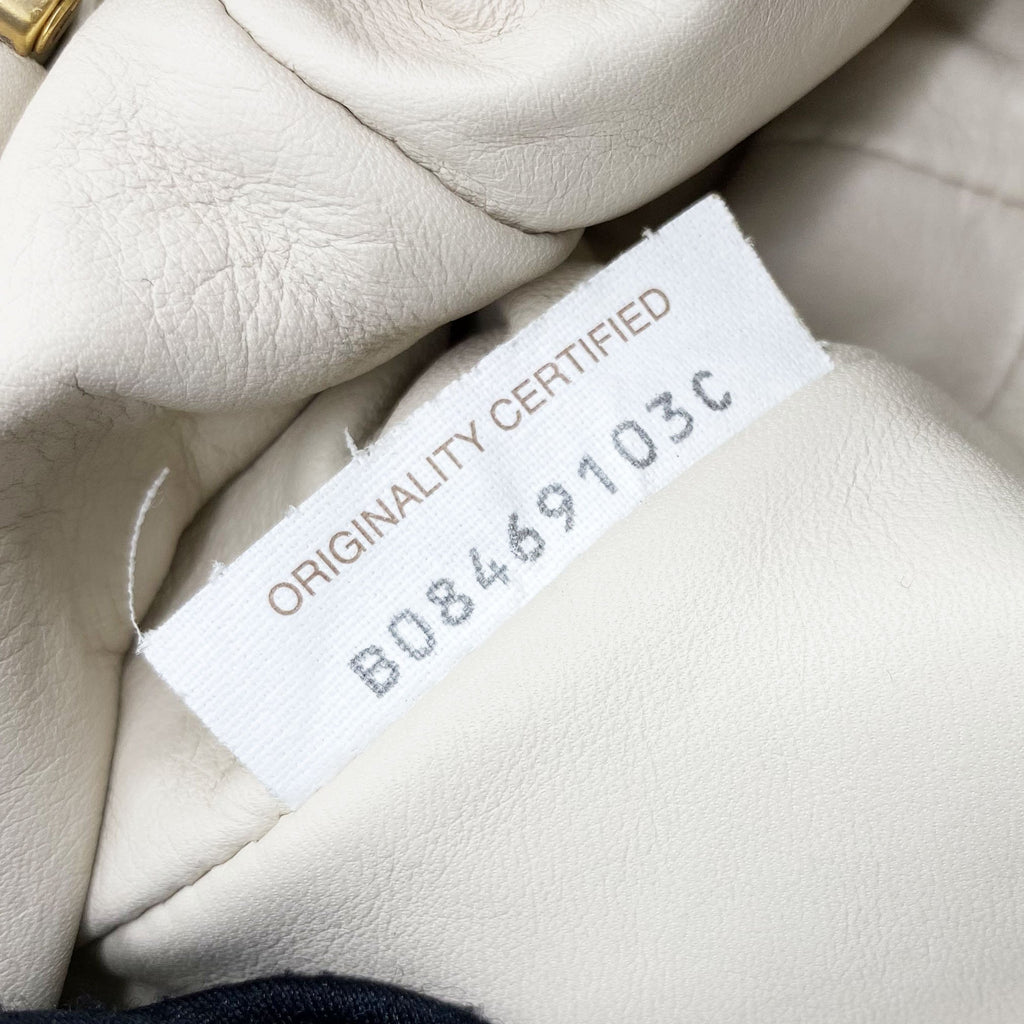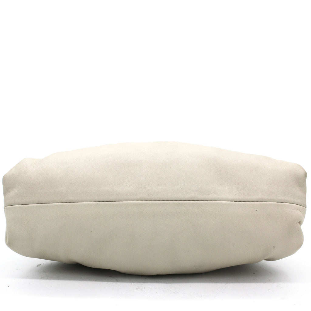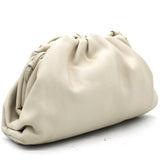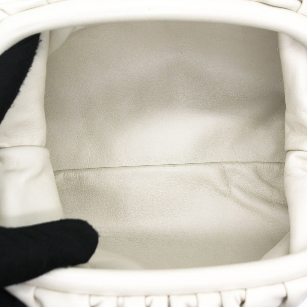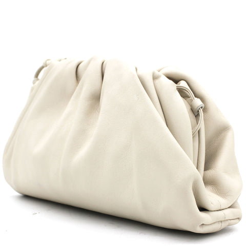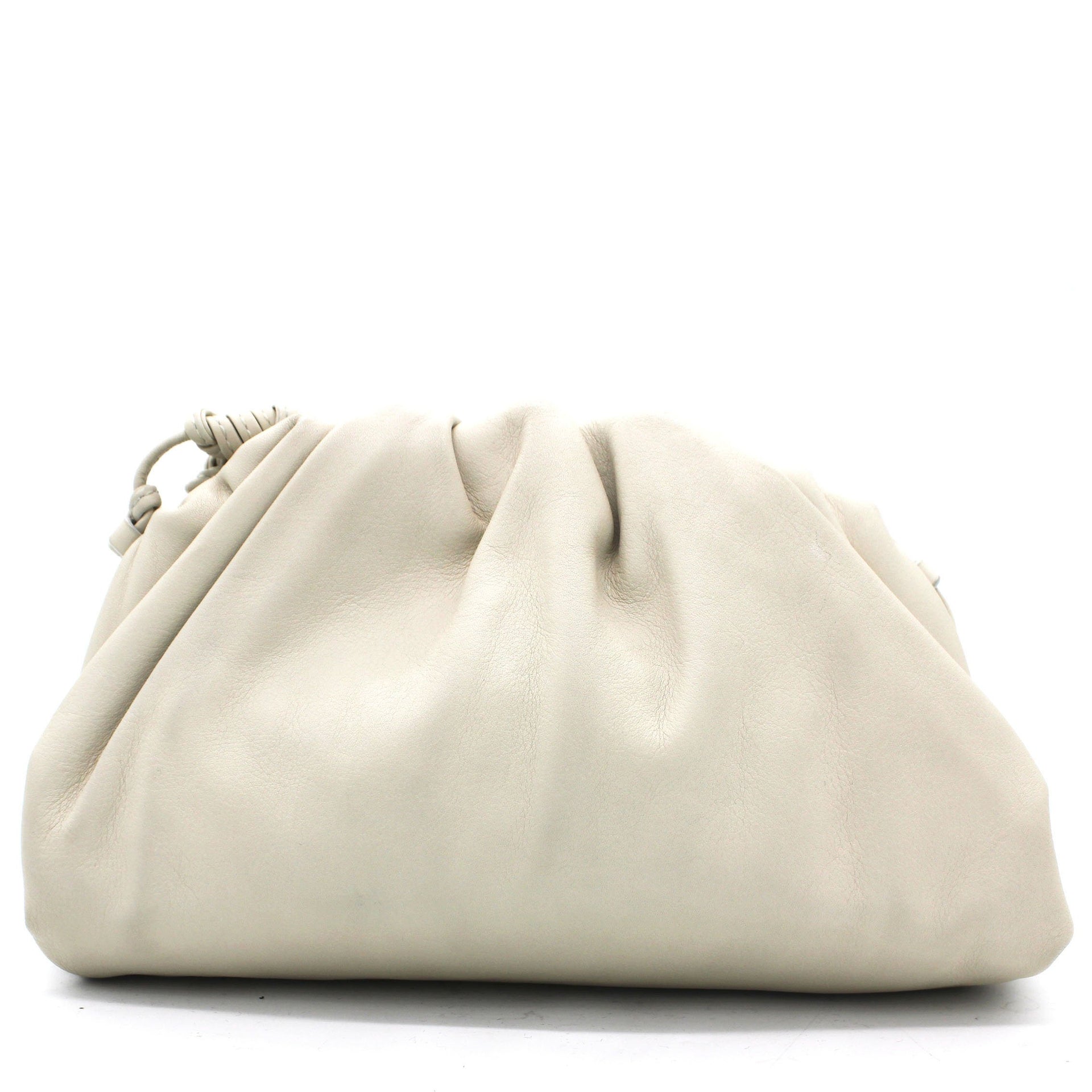 | This ultra-popular clutch is crafted of supple calfskin leather in off white. The bag features a ruched leather magnetic frame top that opens to a matching leather interior. A long thin crossbody strap is accented with signature knotted ends. |