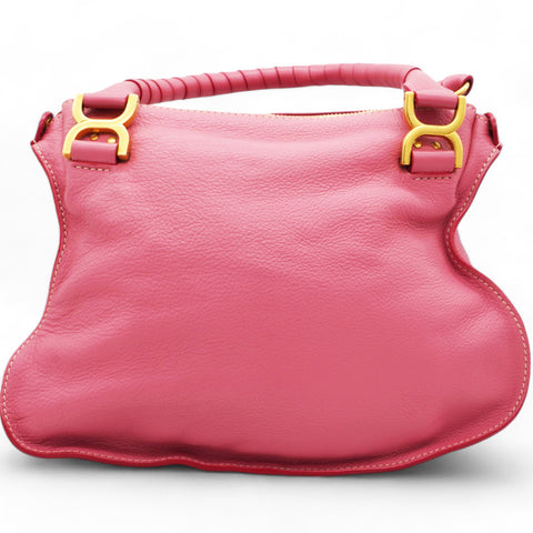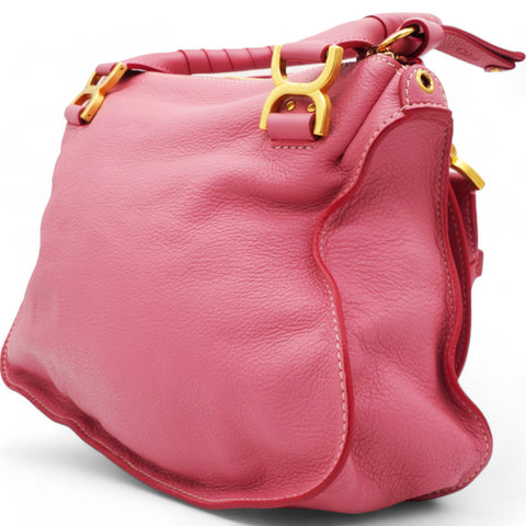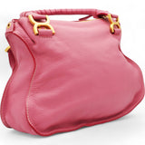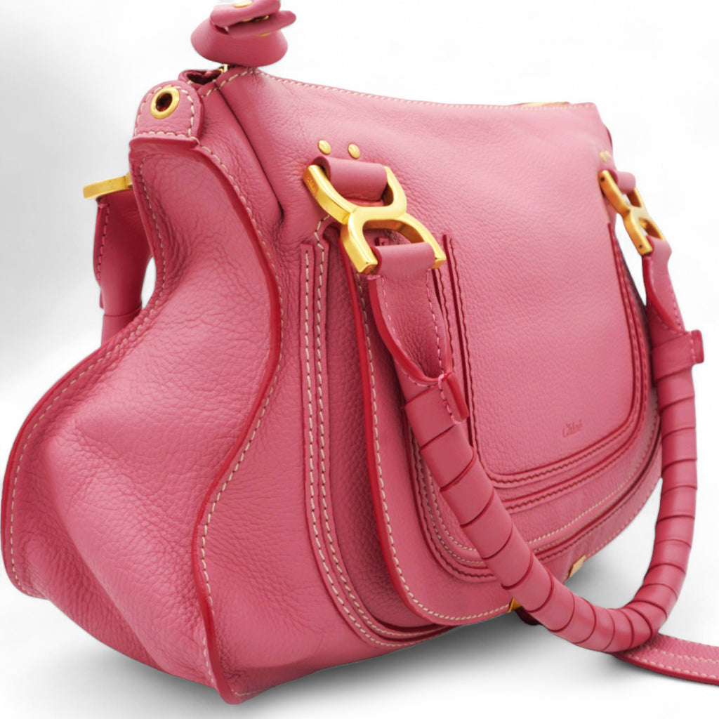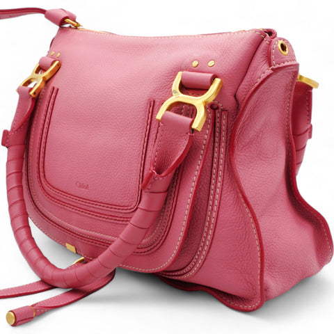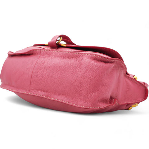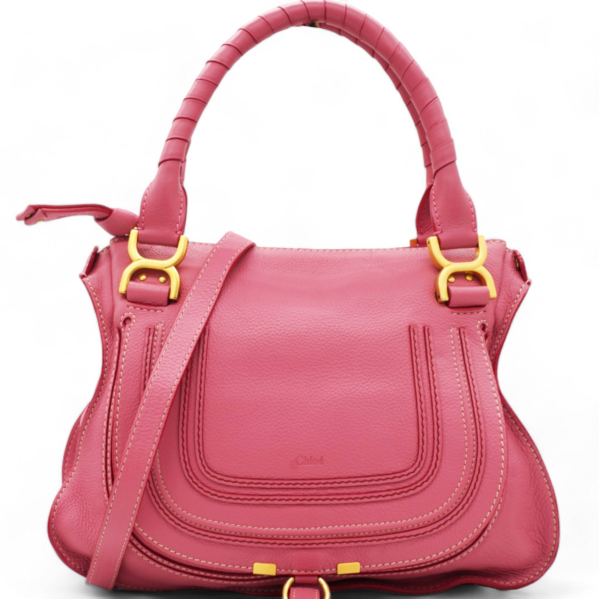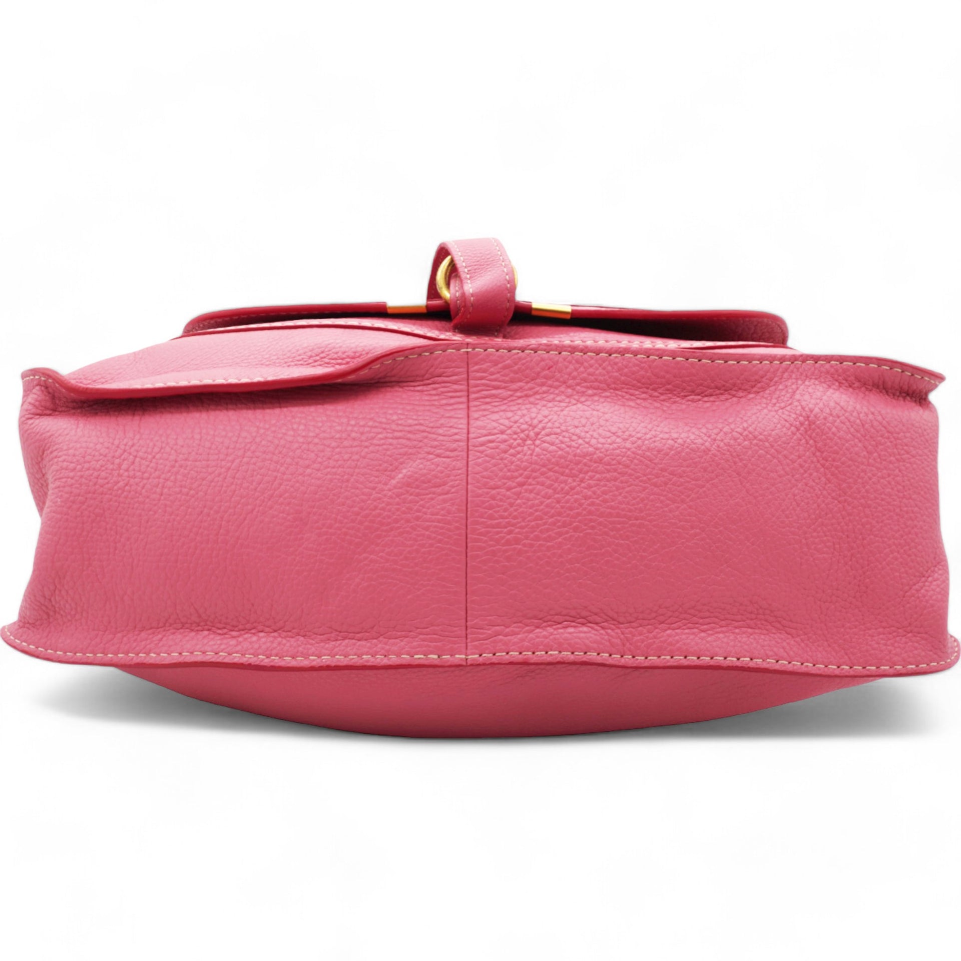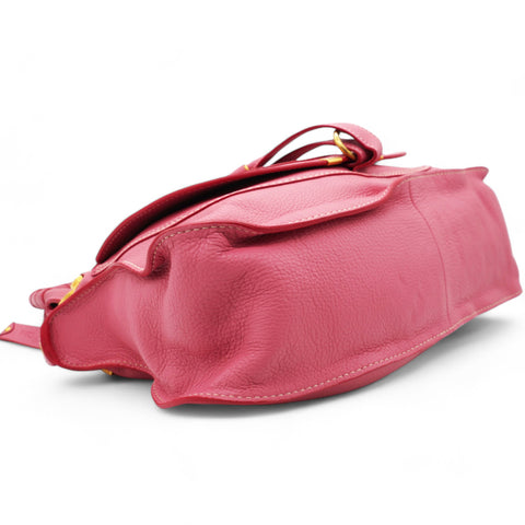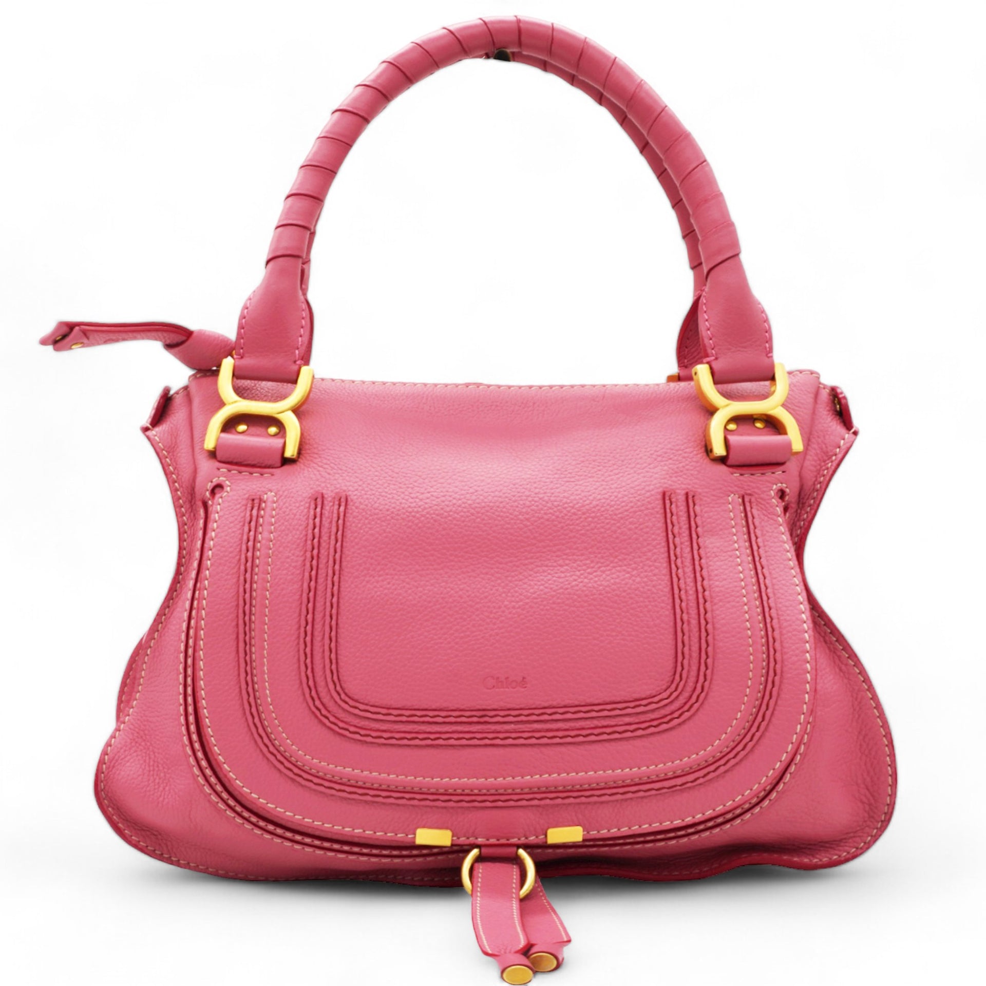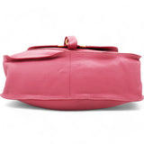 | This stylish satchel is crafted of finely textured red calfskin leather. This chic handbag features the signature horseshoe stitched front flap, wrapped leather top handles and matte brass hardware. The top zipper opens to an olive green fabric interior with a zipper and patch pocket. |