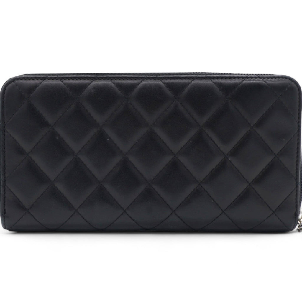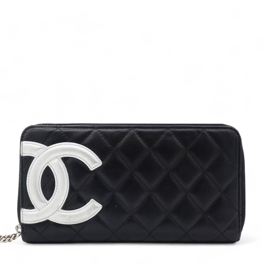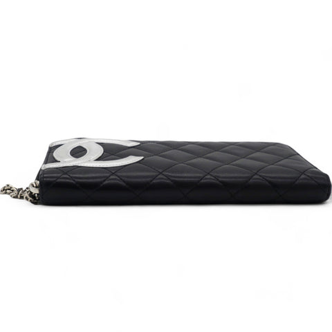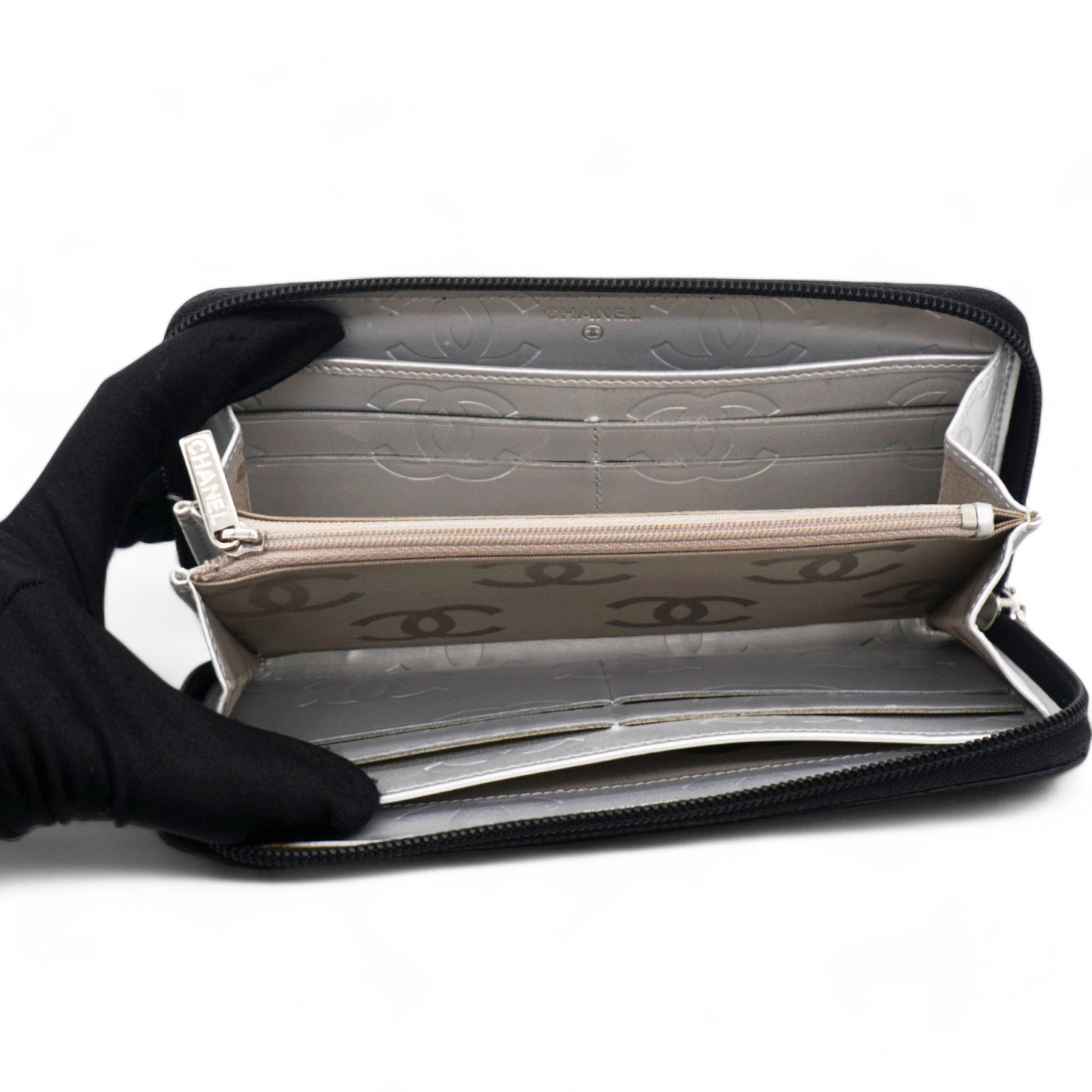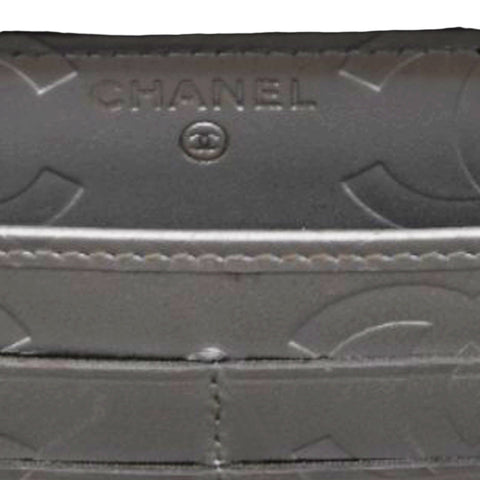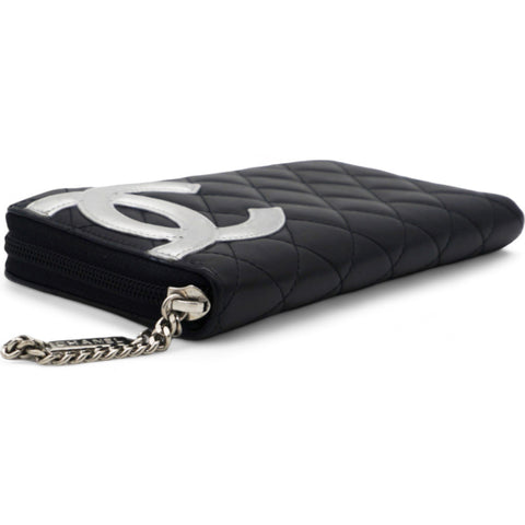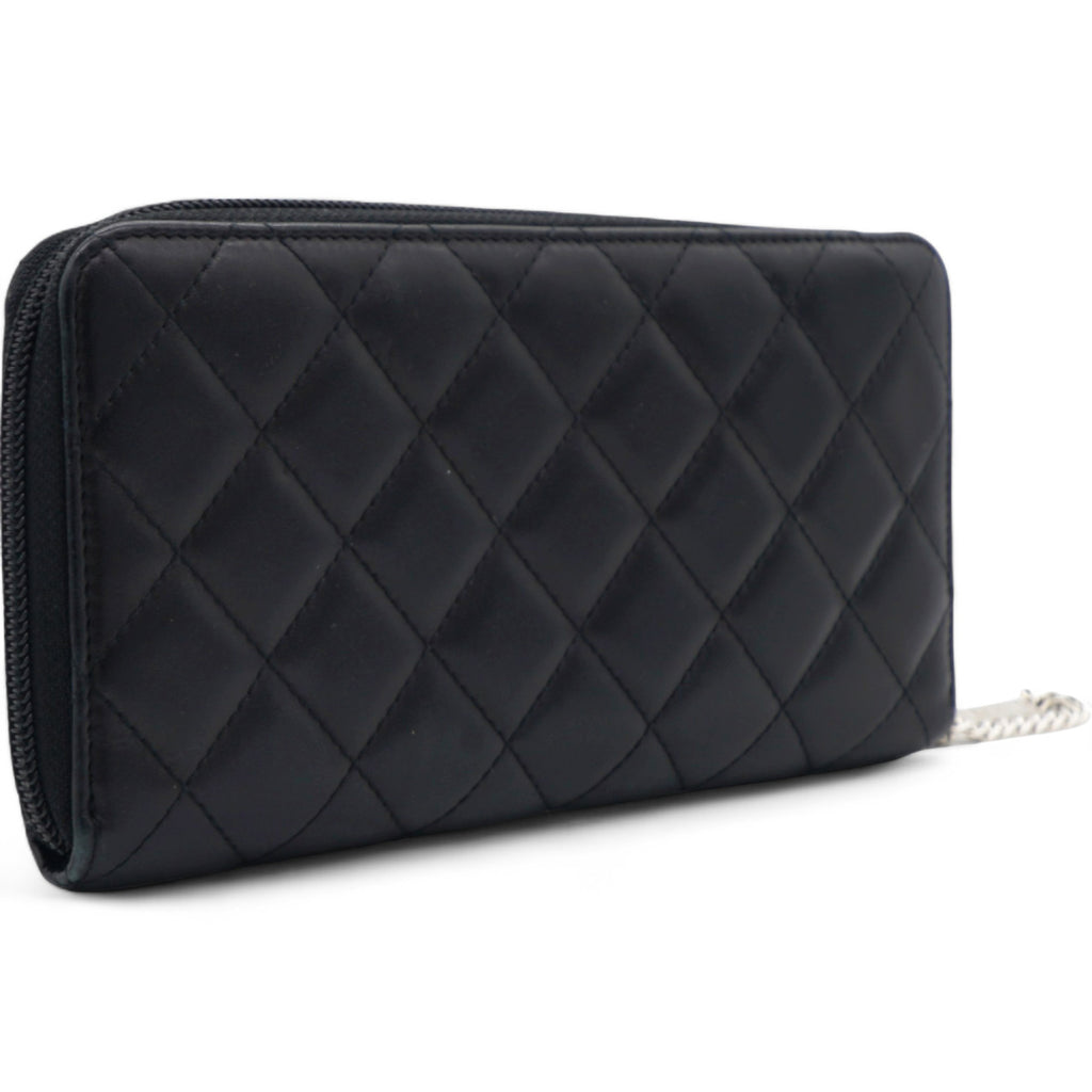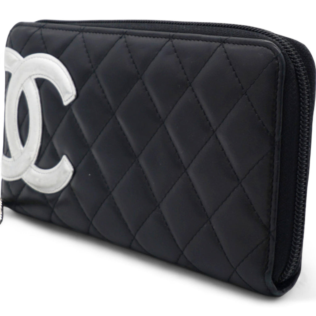 | This stylish clutch wallet is beautifully crafted of black diamond quilted calfskin leather with an off-set silver leather Chanel CC logo patch. The wallet opens to a silver Chanel CC embossed leather interior with card slots, bill compartments and a zipper pocket. |