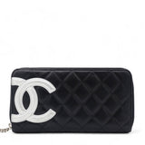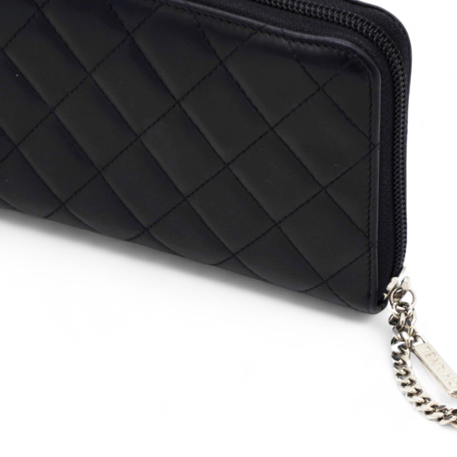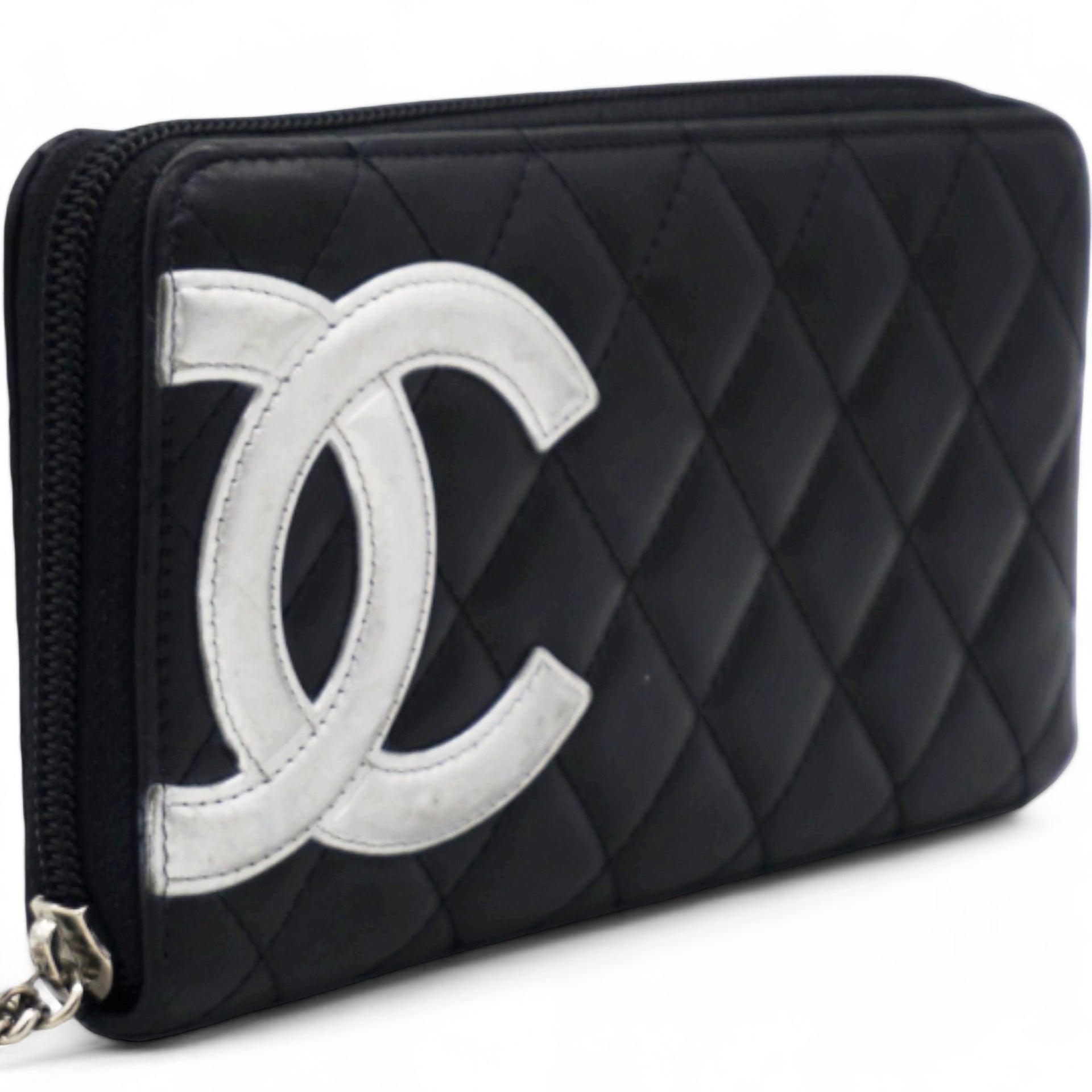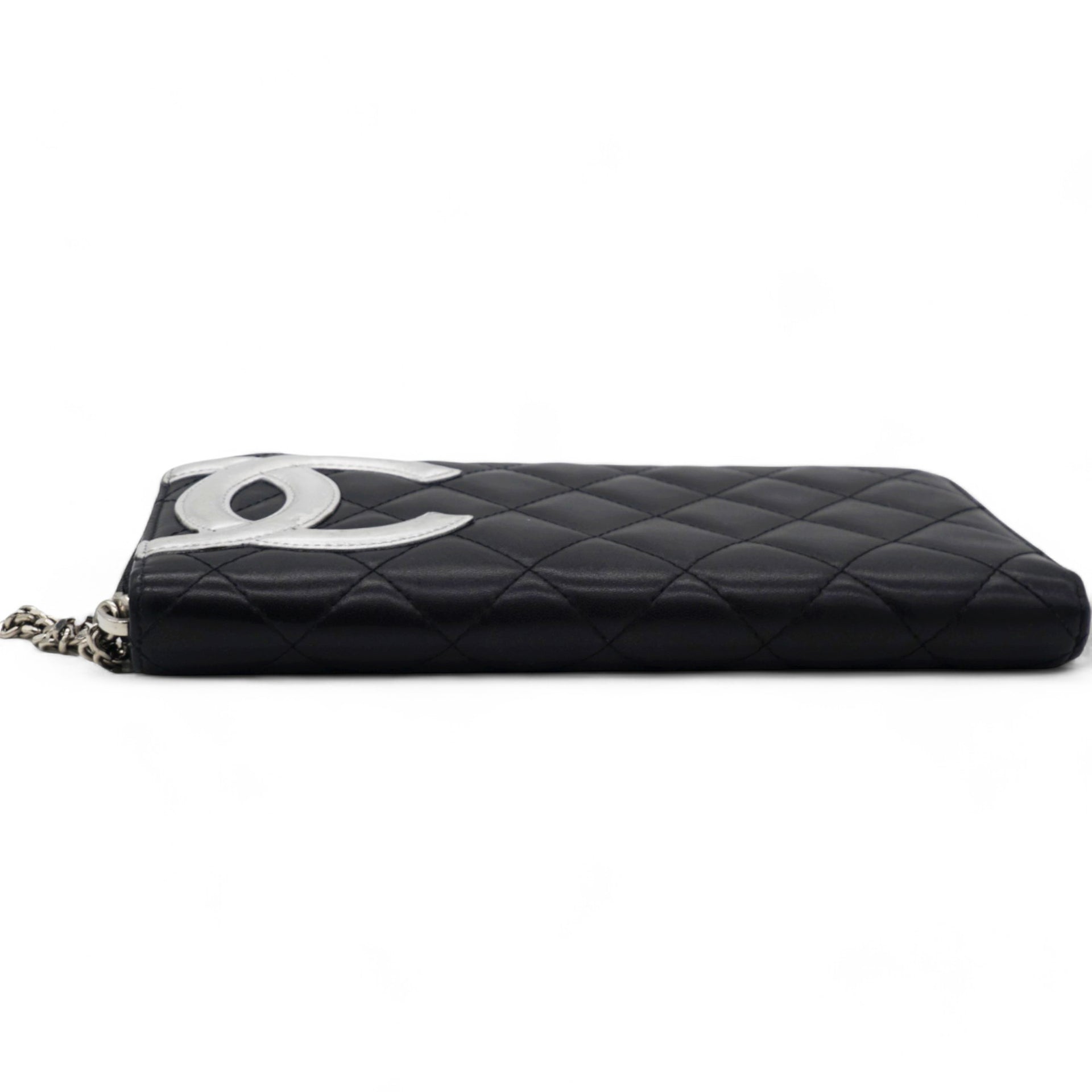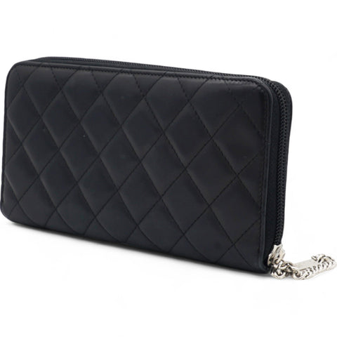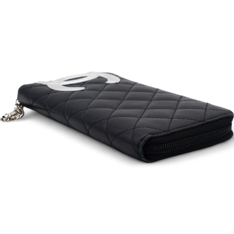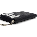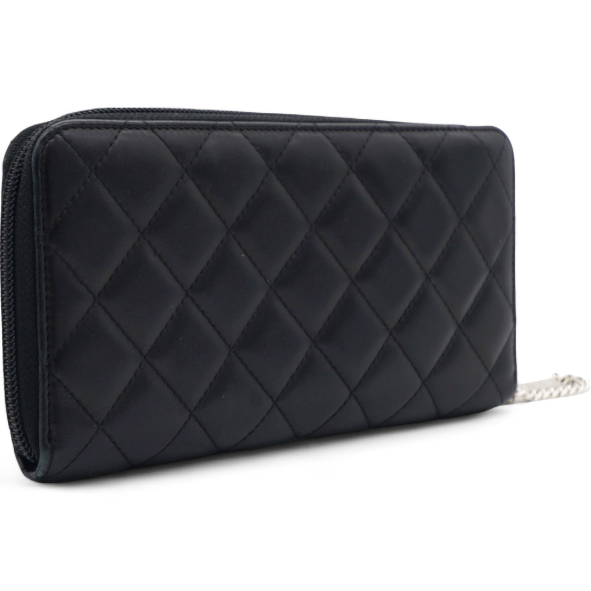 | This stylish clutch wallet is beautifully crafted of black diamond quilted calfskin leather with an off-set silver leather Chanel CC logo patch. The wallet opens to a silver Chanel CC embossed leather interior with card slots, bill compartments and a zipper pocket. |