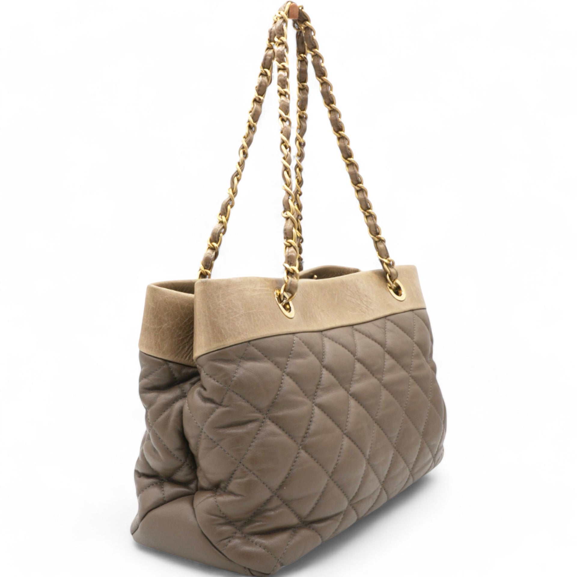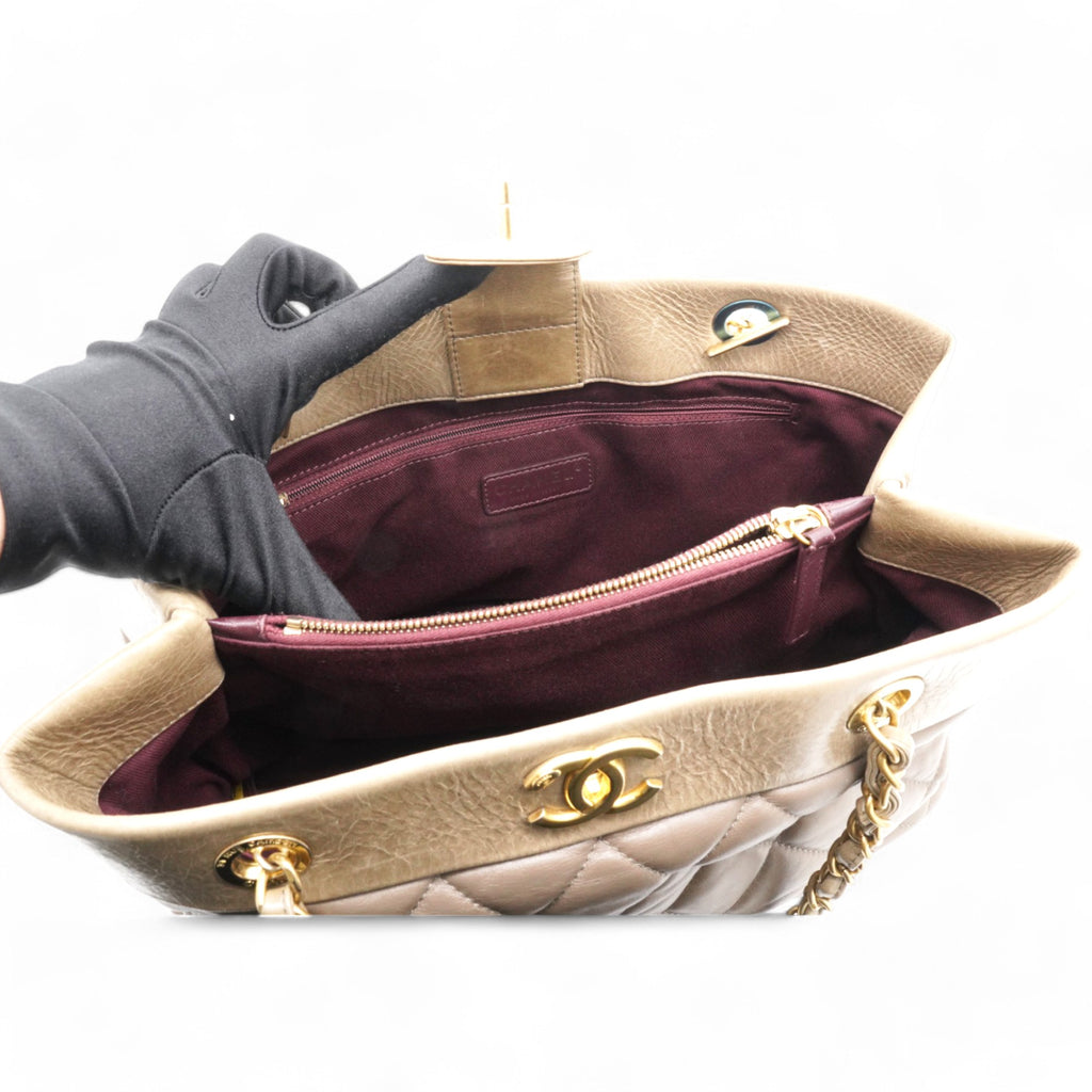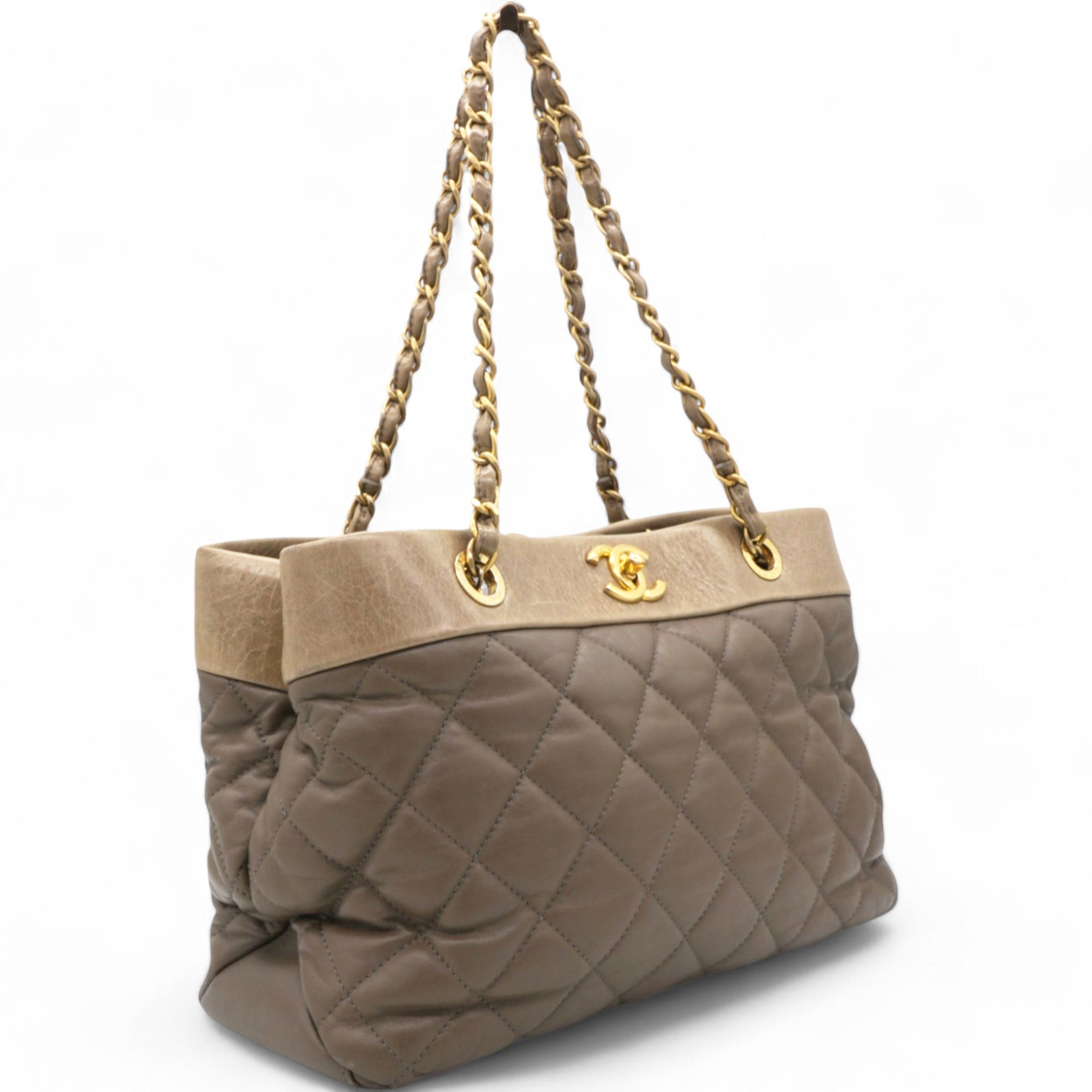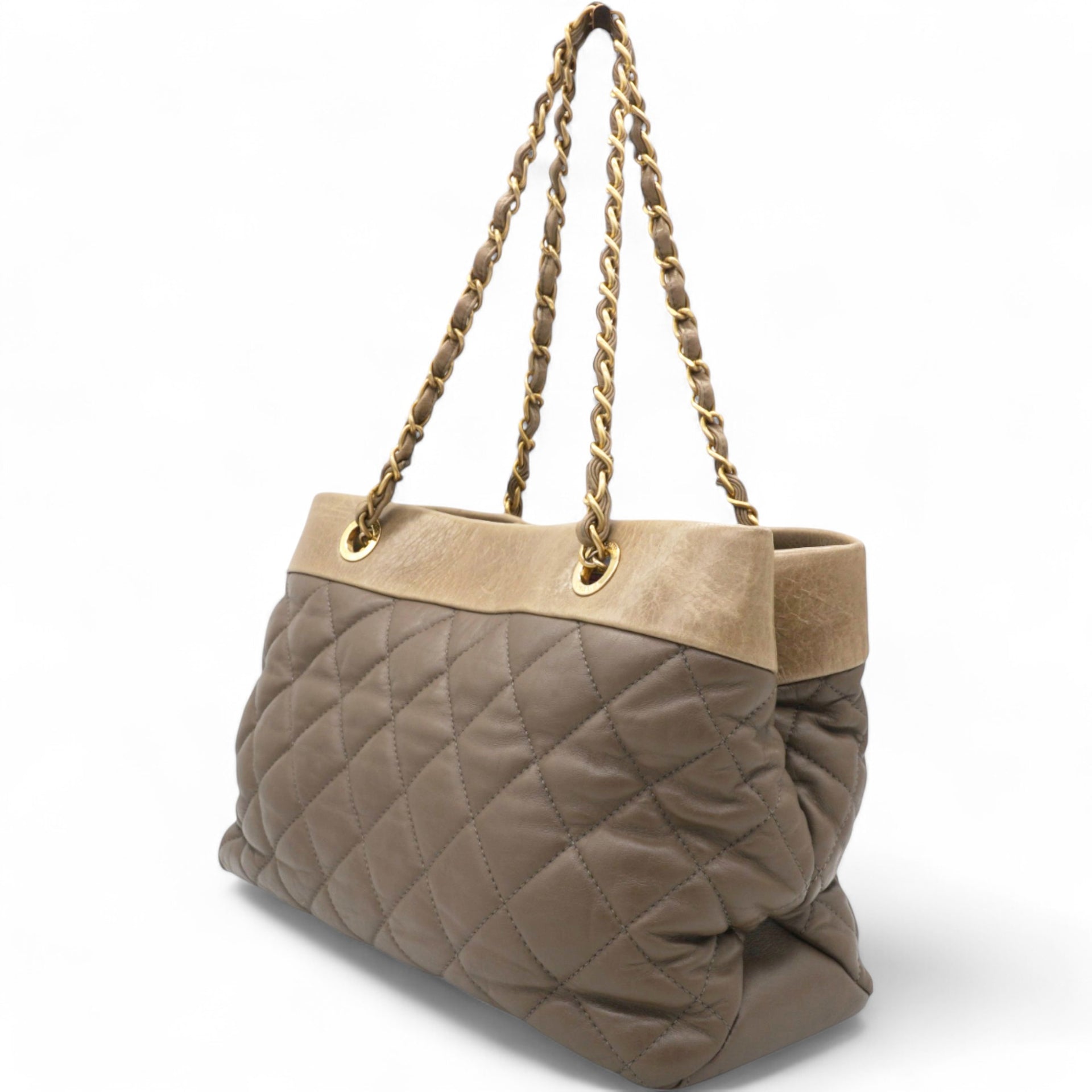 This sophisticated shoulder bag is finely crafted of supple calfskin leather with a signature diamond quilted design in a relaxed structure. It features gold chain link leather threaded shoulder straps and for the top crest a Chanel CC Mademoiselle turn lock opening. This opens to a partitioned plum fabric interior with zipper and patch pockets and a central zipper compartment. .