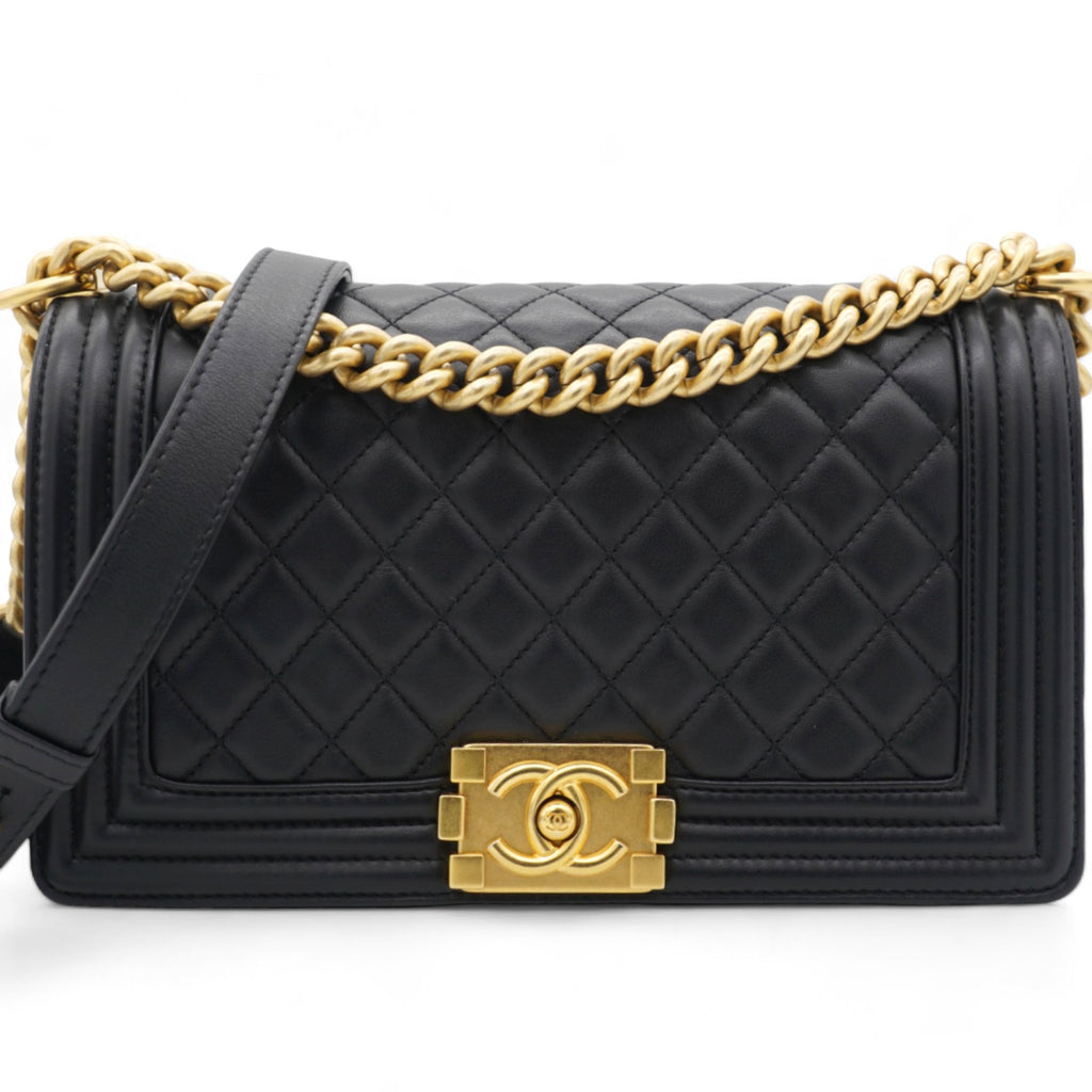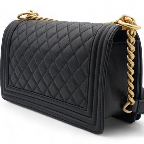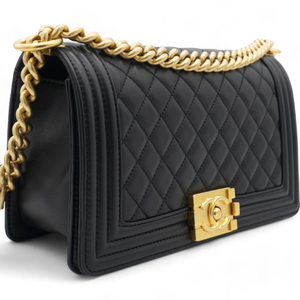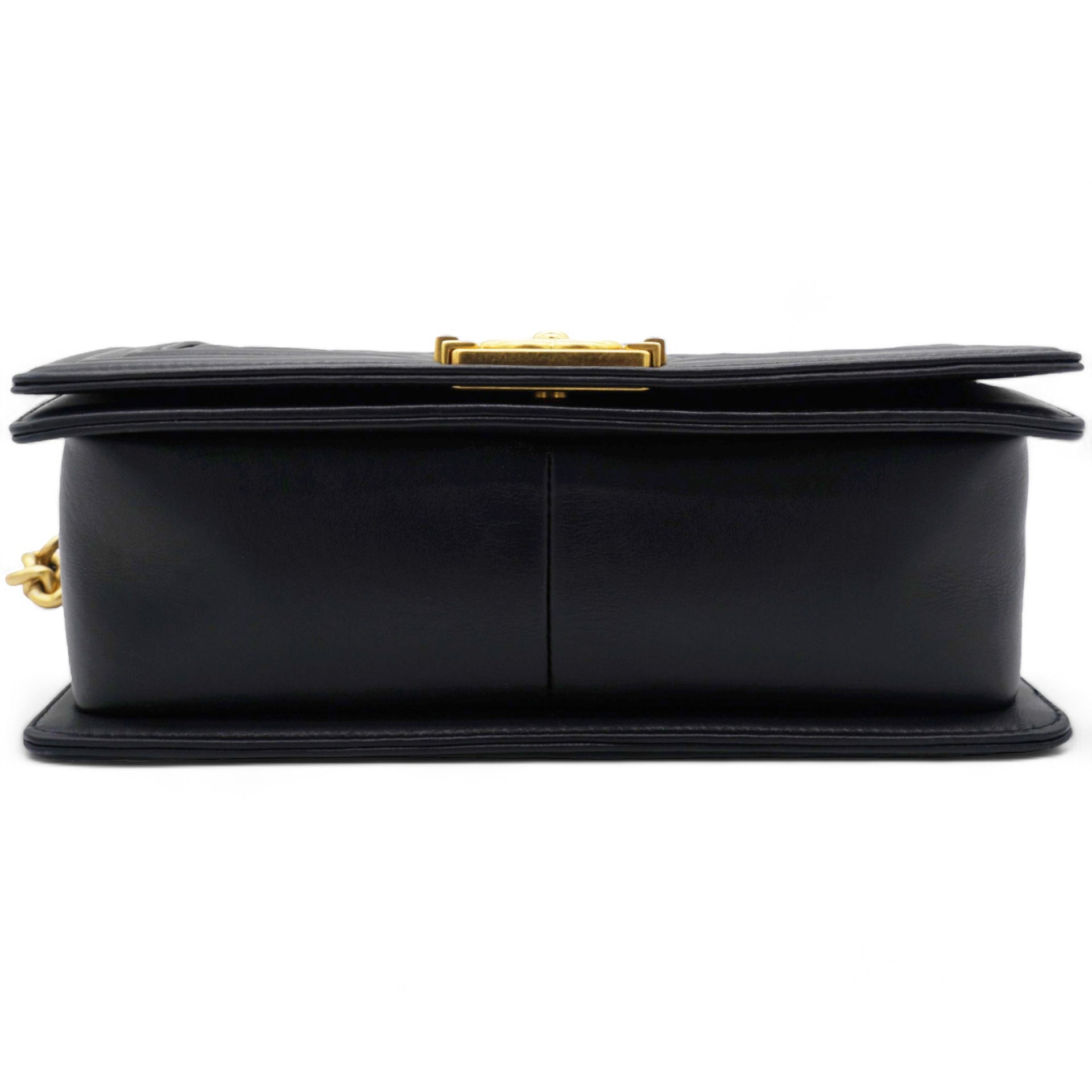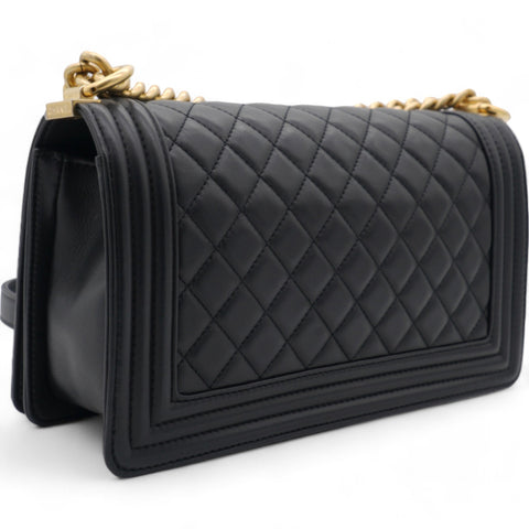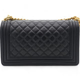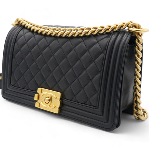 | This stylish shoulder bag is crafted of luxuriously soft diamond quilted calfskin leather with linear quilted borders in black. The bag features an aged gold chain link shoulder strap with a leather shoulder pad and a ruthenium Chanel boy CC push lock. This opens the full flap to a black fabric interior with zipper and flat pockets. |
