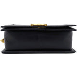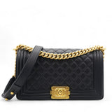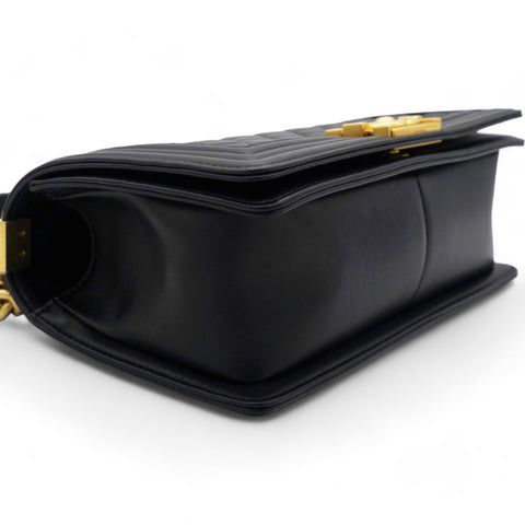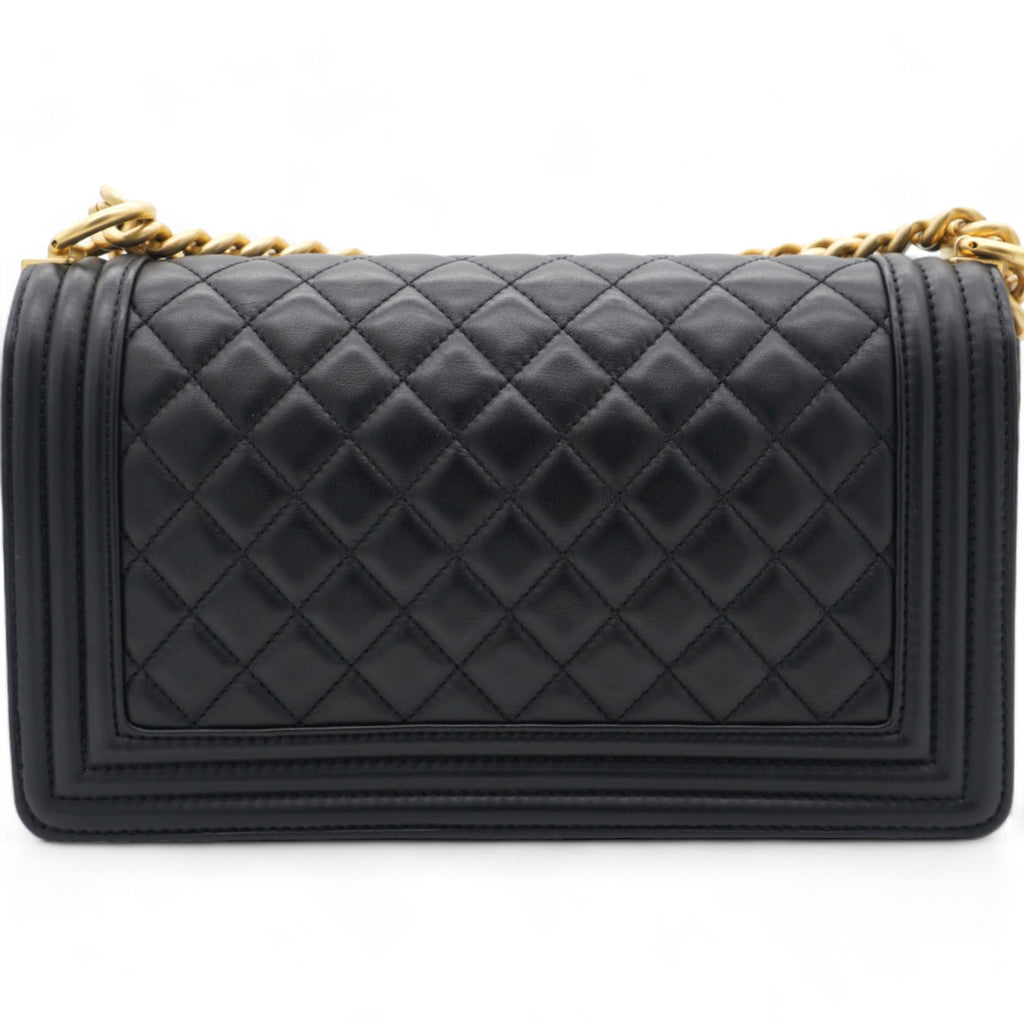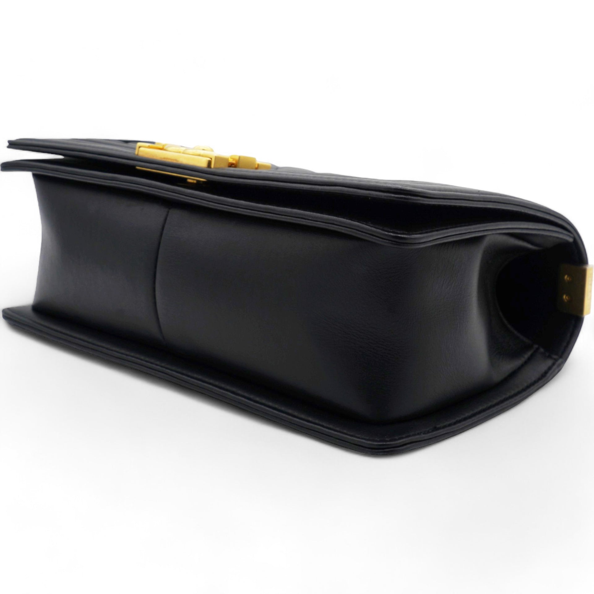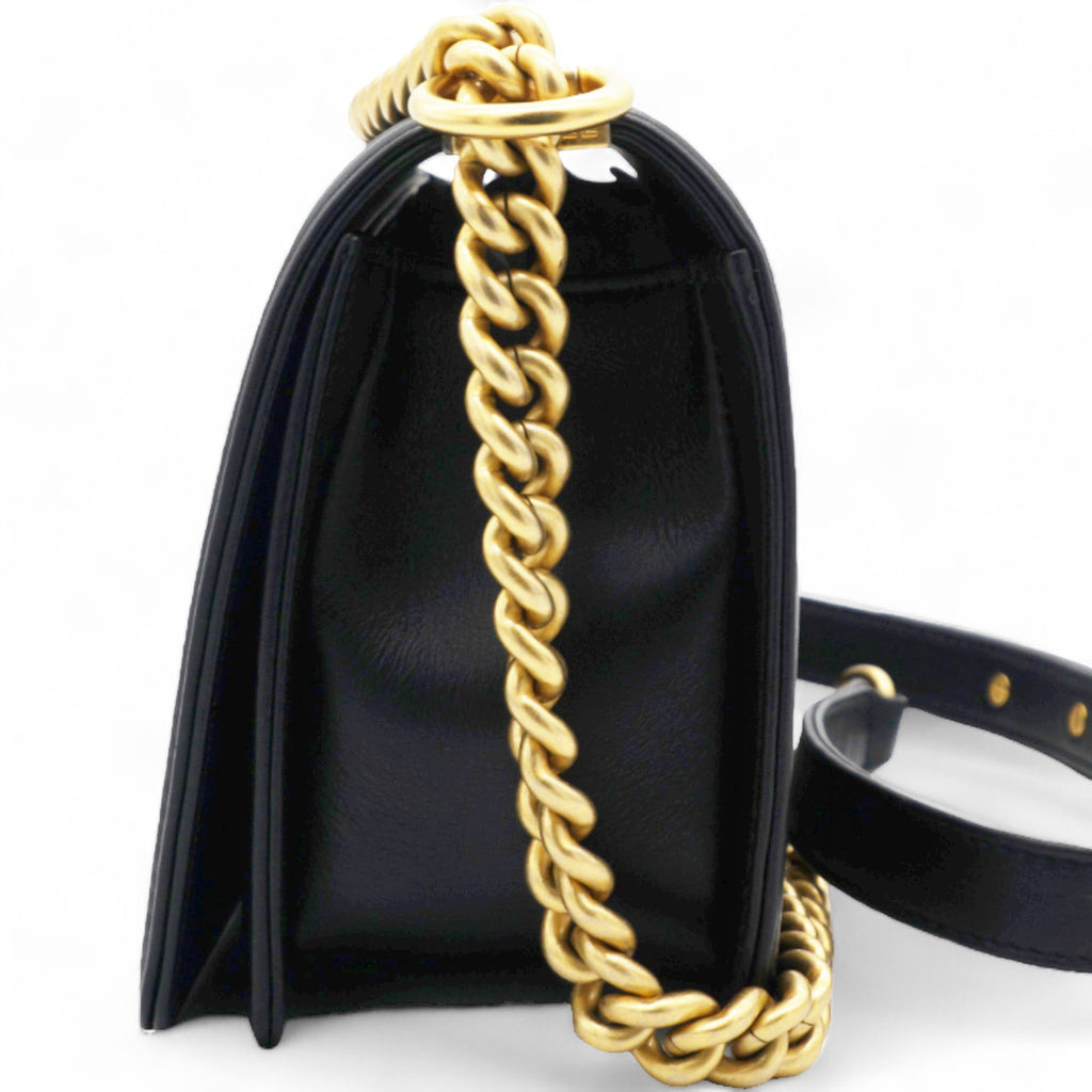 | This stylish shoulder bag is crafted of luxuriously soft diamond quilted calfskin leather with linear quilted borders in black. The bag features an aged gold chain link shoulder strap with a leather shoulder pad and a ruthenium Chanel boy CC push lock. This opens the full flap to a black fabric interior with zipper and flat pockets. |