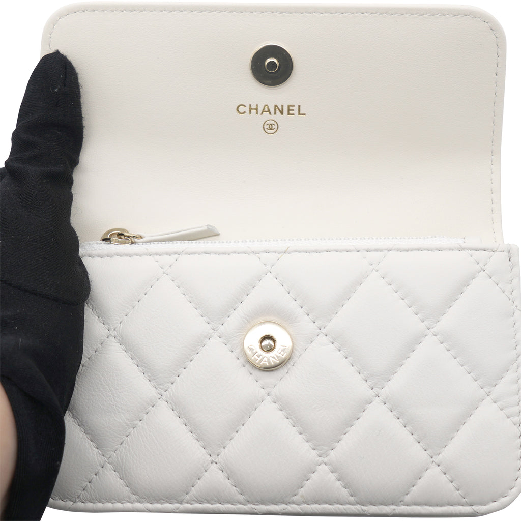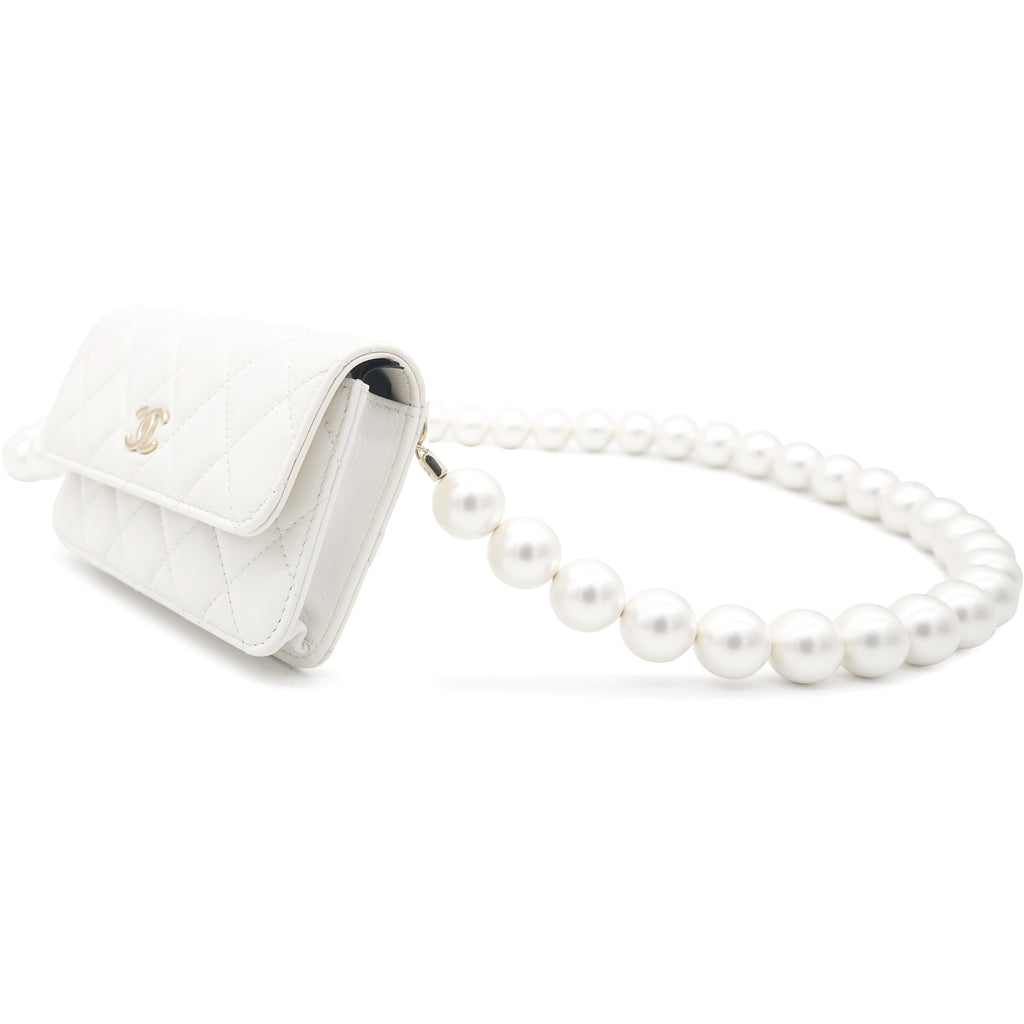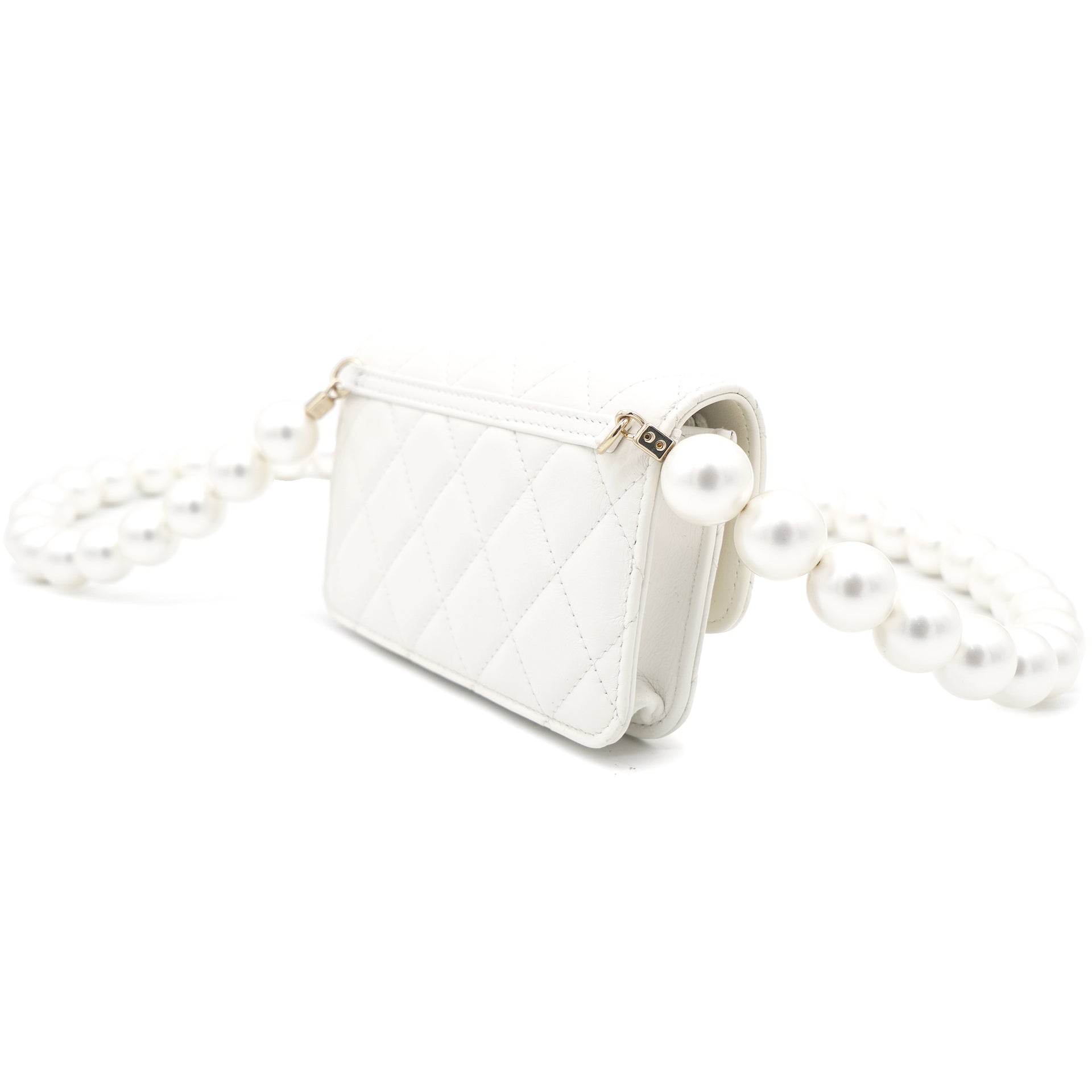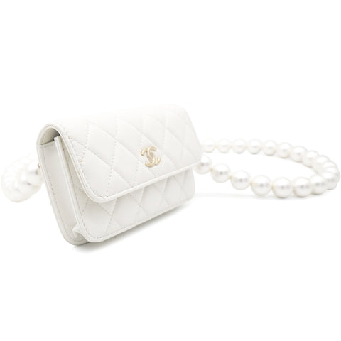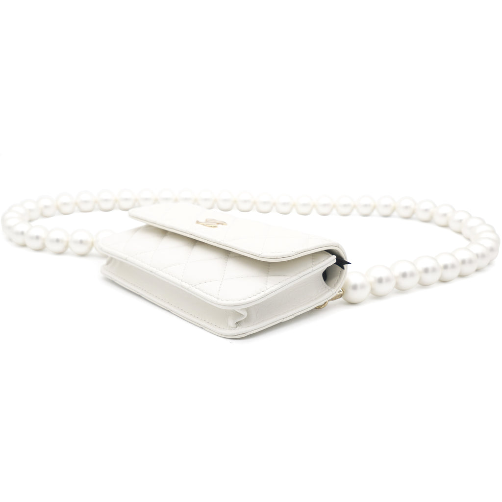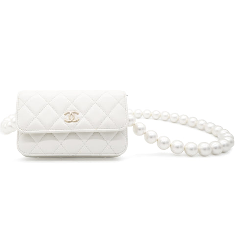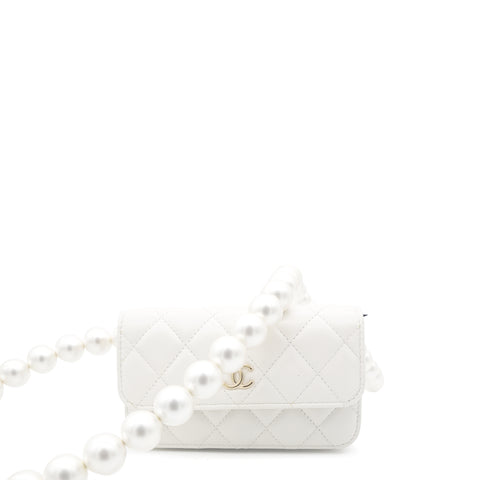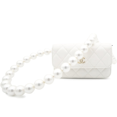 | This is an authentic CHANEL Calfskin Quilted Pearl Mini Wallet On Chain WOC in White. This chic and stylish wallet is crafted of luxuriously soft diamond quilted lambskin leather in white. This crossbody bag features a pearl crossbody shoulder strap and a facing flap, gold hardware, and a gold Chanel CC logo. The flap opens to a partitioned white fabric interior with card slots, a zipper compartment, and patch pocket. |