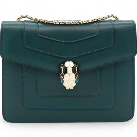 | This clutch is crafted in green calfskin leather. It features snakehead closure in light gold with black and white agate enamel scales and green eyes. the bag opens to a fabric interior with a green leather patch pocket. |