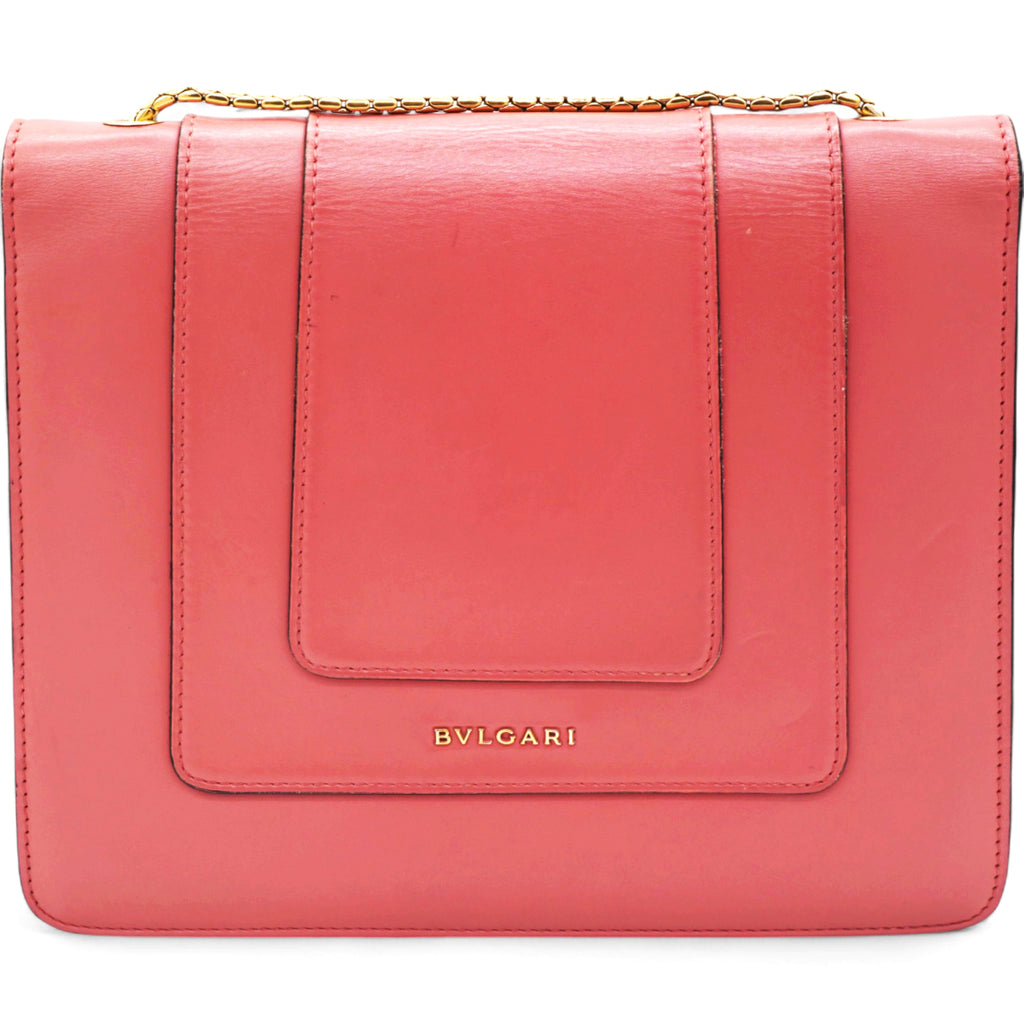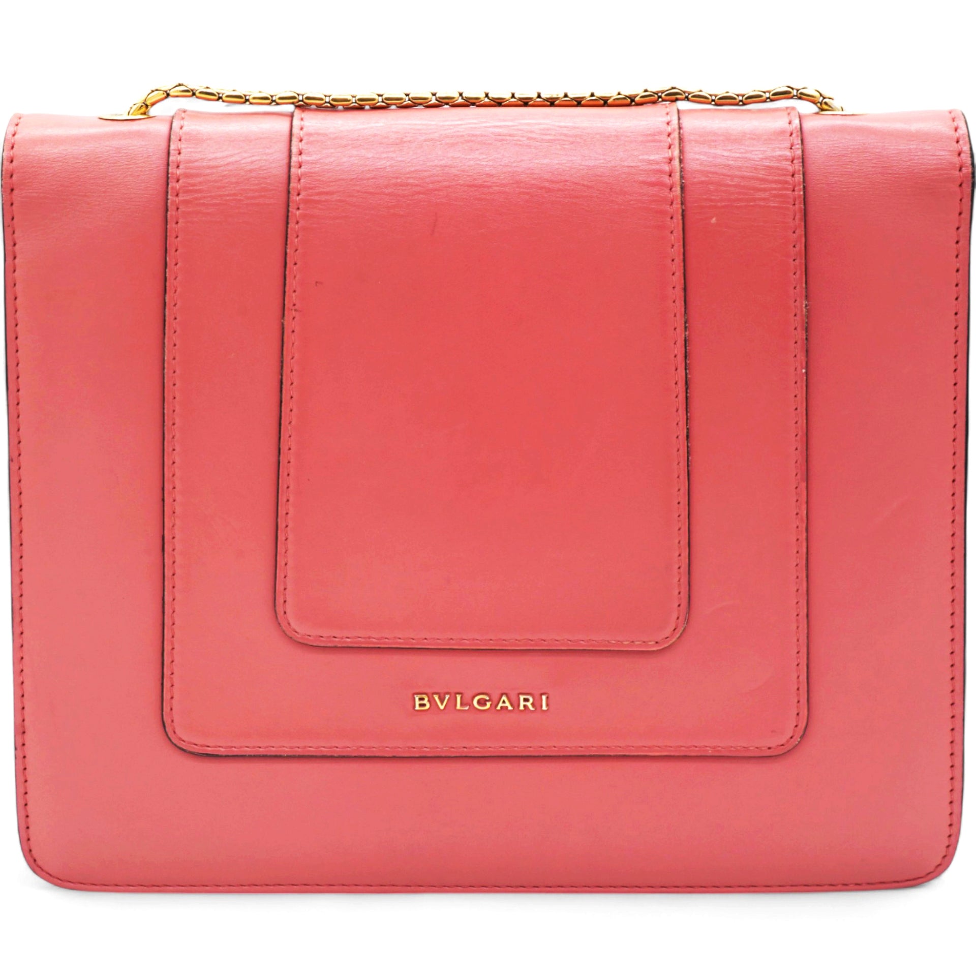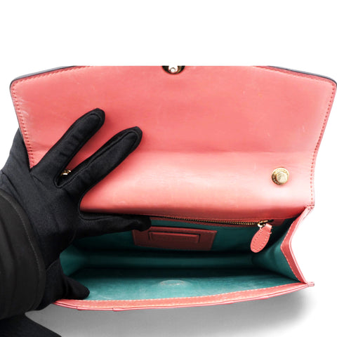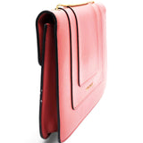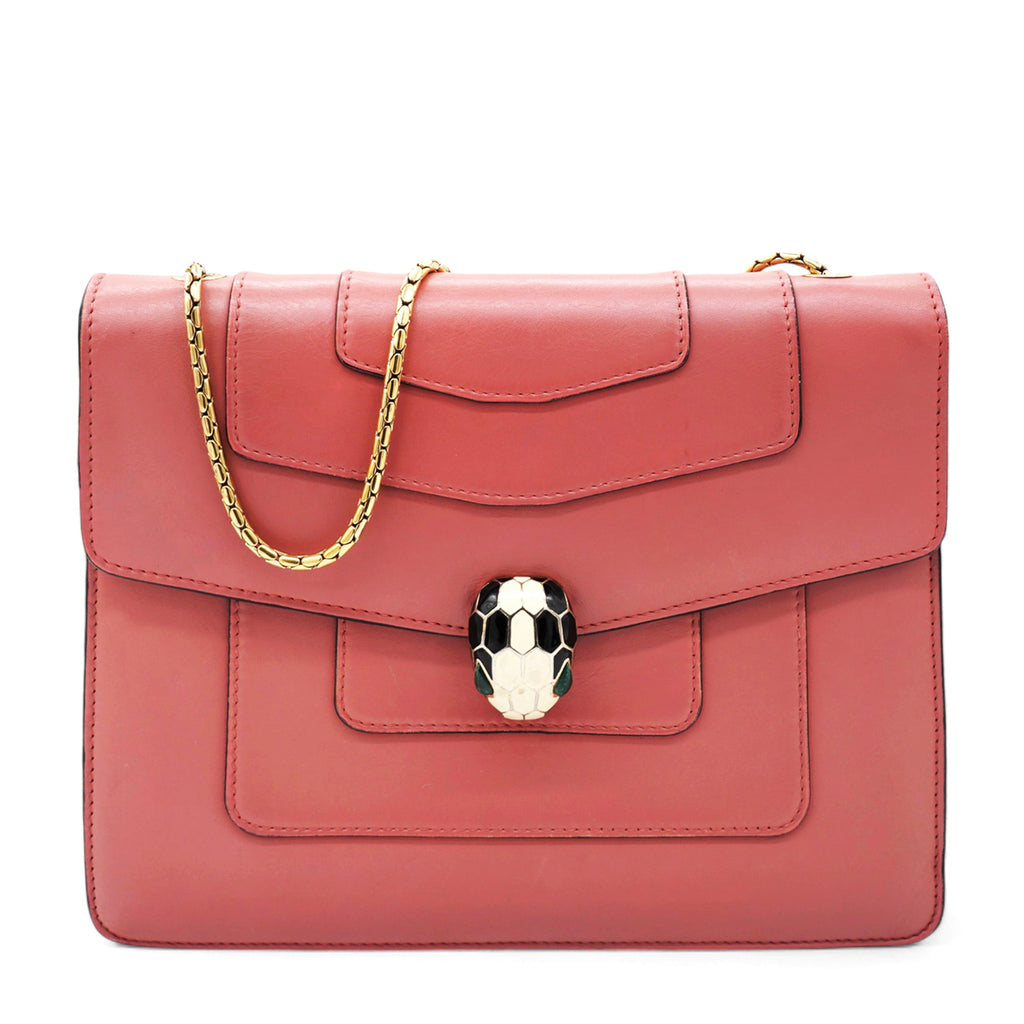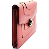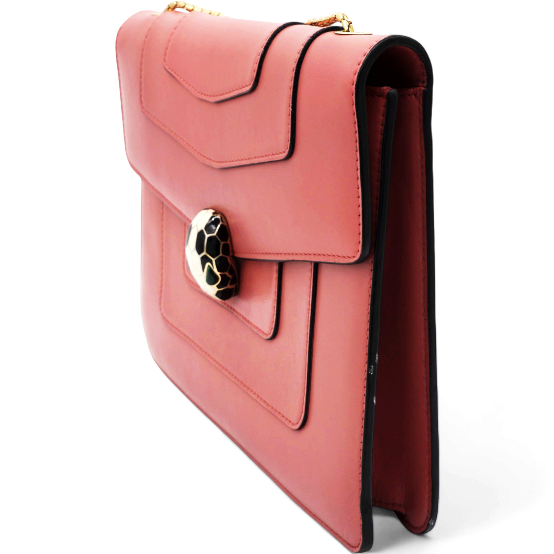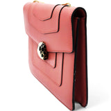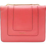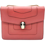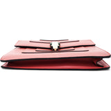 | This chic crossbody is crafted of smooth pink leather. It features a light gold plated sinuous snake chain and snakehead closure. The bag opens with a snap to a blue fabric interior with a zipper pocket and leather card slot. |