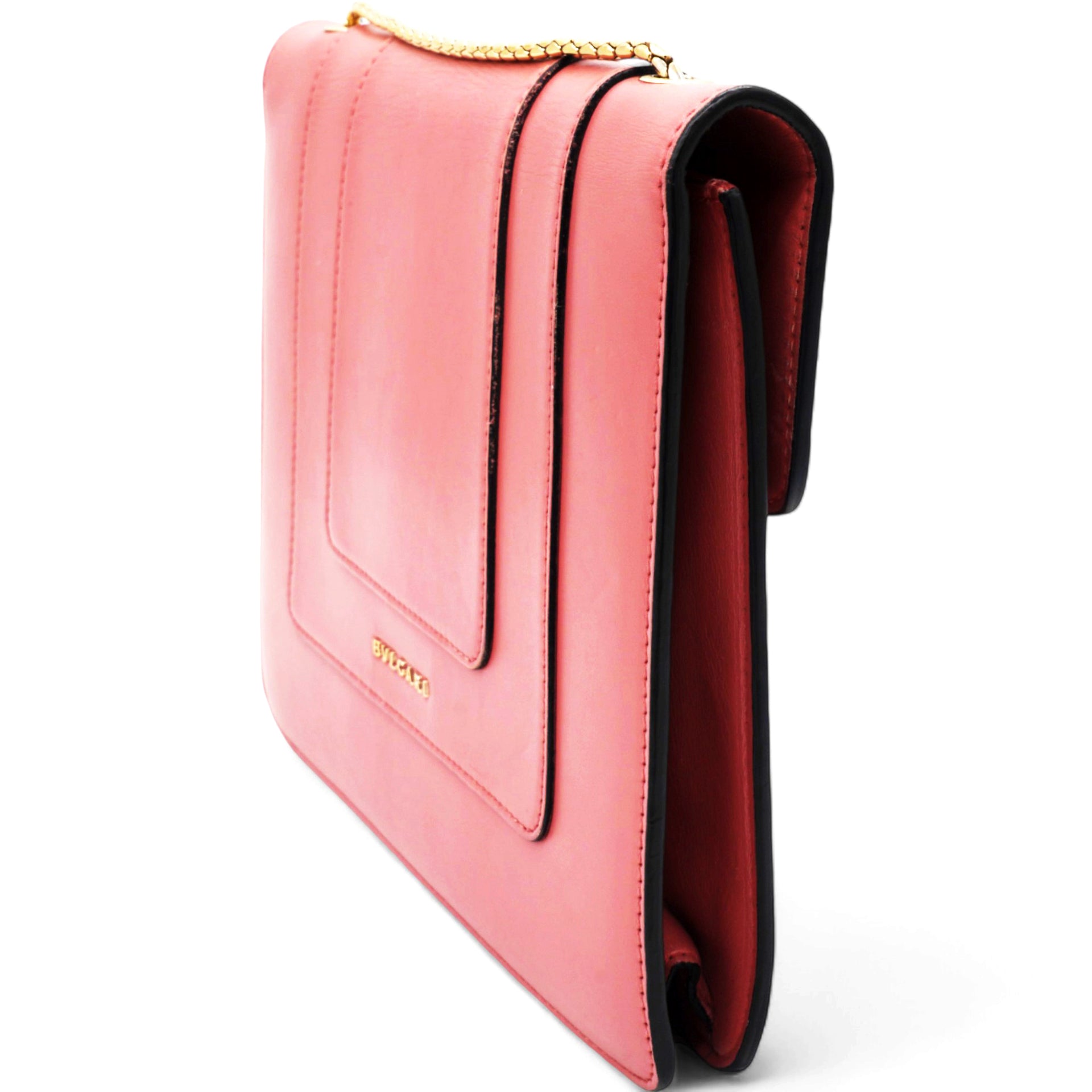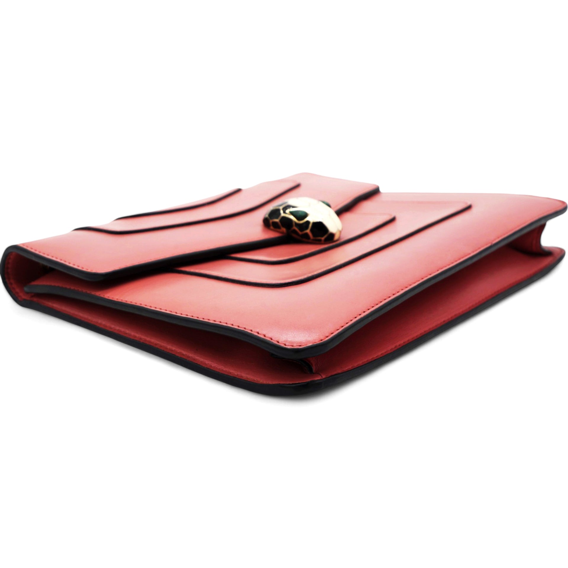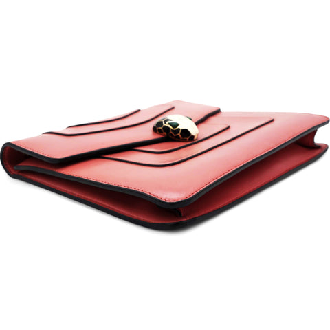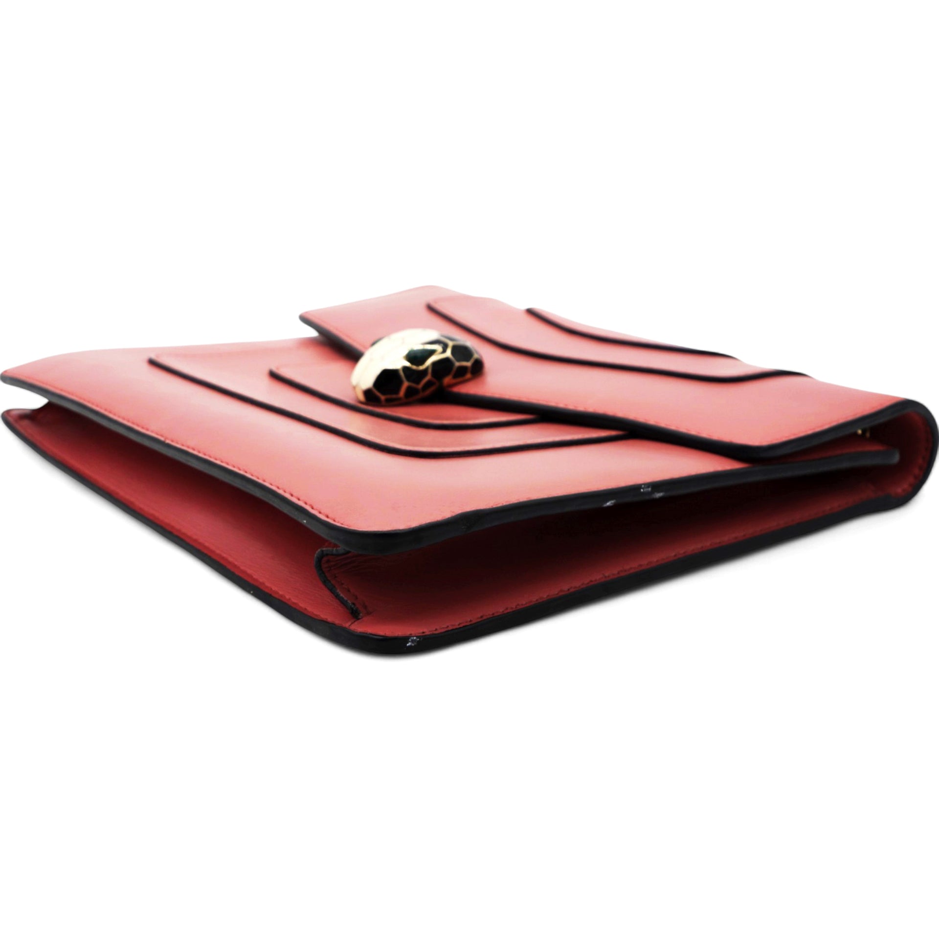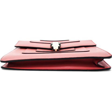 | This chic crossbody is crafted of smooth pink leather. It features a light gold plated sinuous snake chain and snakehead closure. The bag opens with a snap to a blue fabric interior with a zipper pocket and leather card slot. |