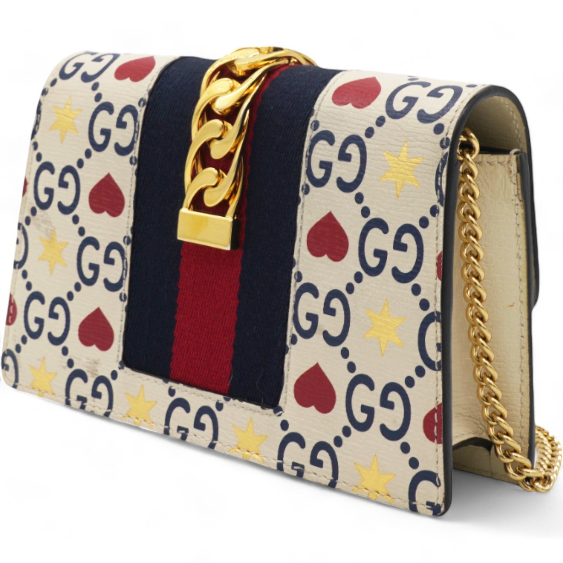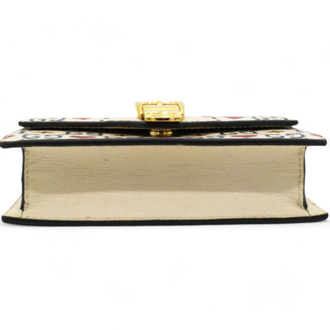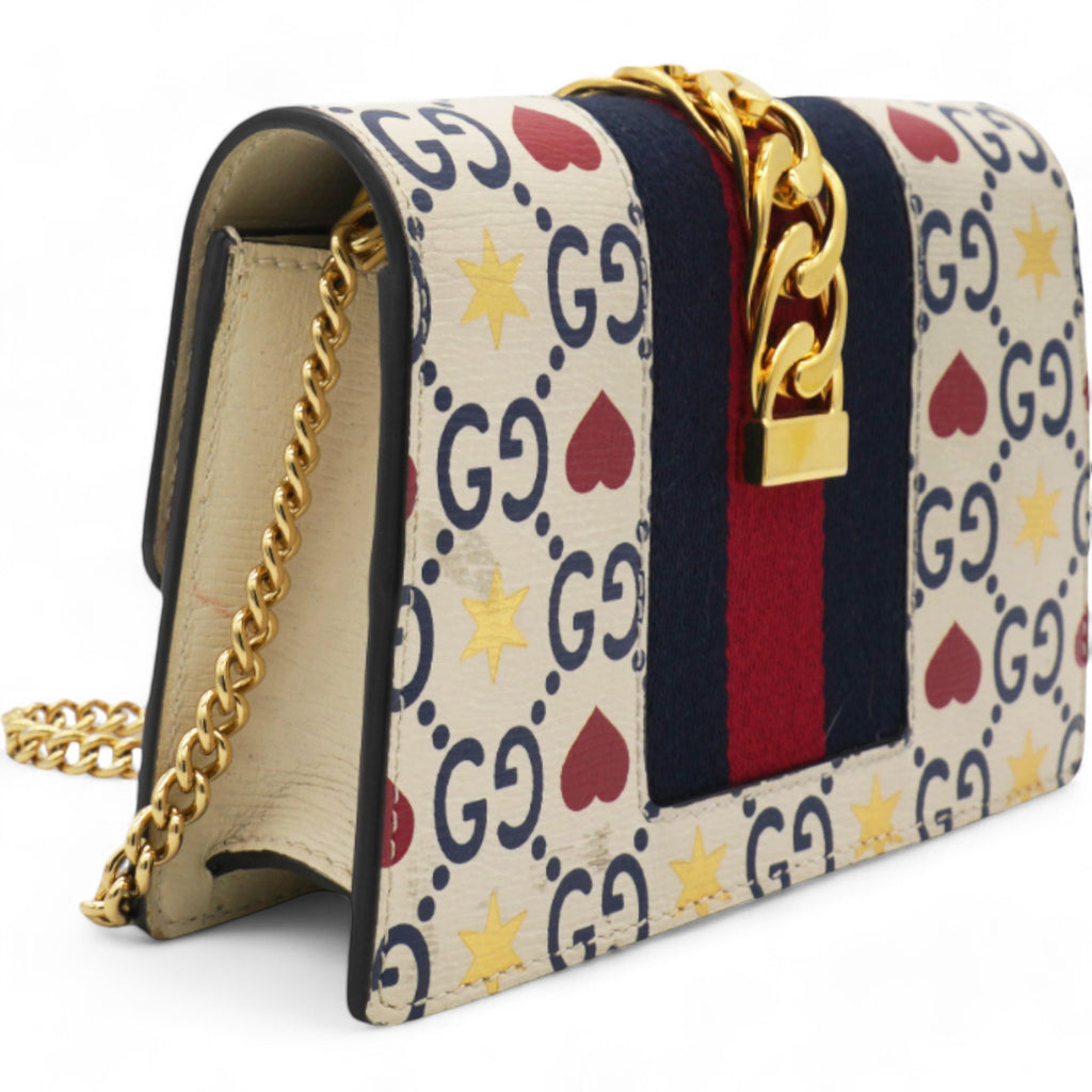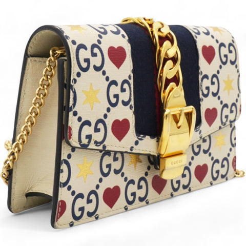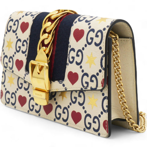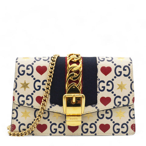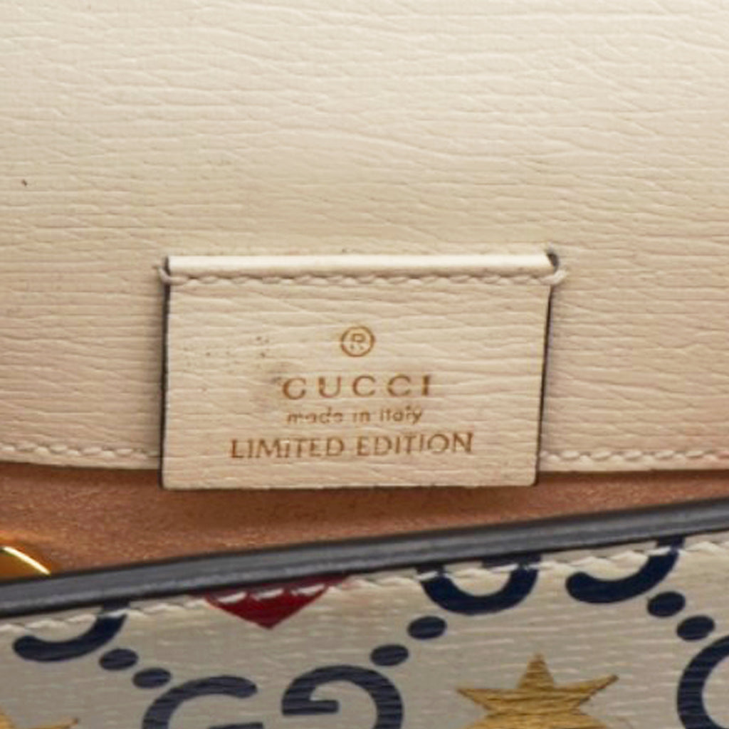 | This chic limited edition shoulder bag is crafted of smooth off white calfskin leather with a blue GG logo, stars printed in gold foil and red hearts. It features a prominent front flap detailed with a central canvas red and blue web stripe. A top handle and shoulder strap complement the polished gold chain buckle lock closure. There is an optional shoulder strap crafted of twisted satin cording in white, red and blue with polished gold clasps as well as a white leather shoulder strap. The top flap opens to a light blue fabric interior with a patch pocket. |