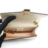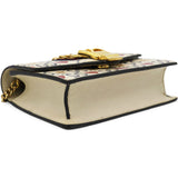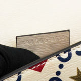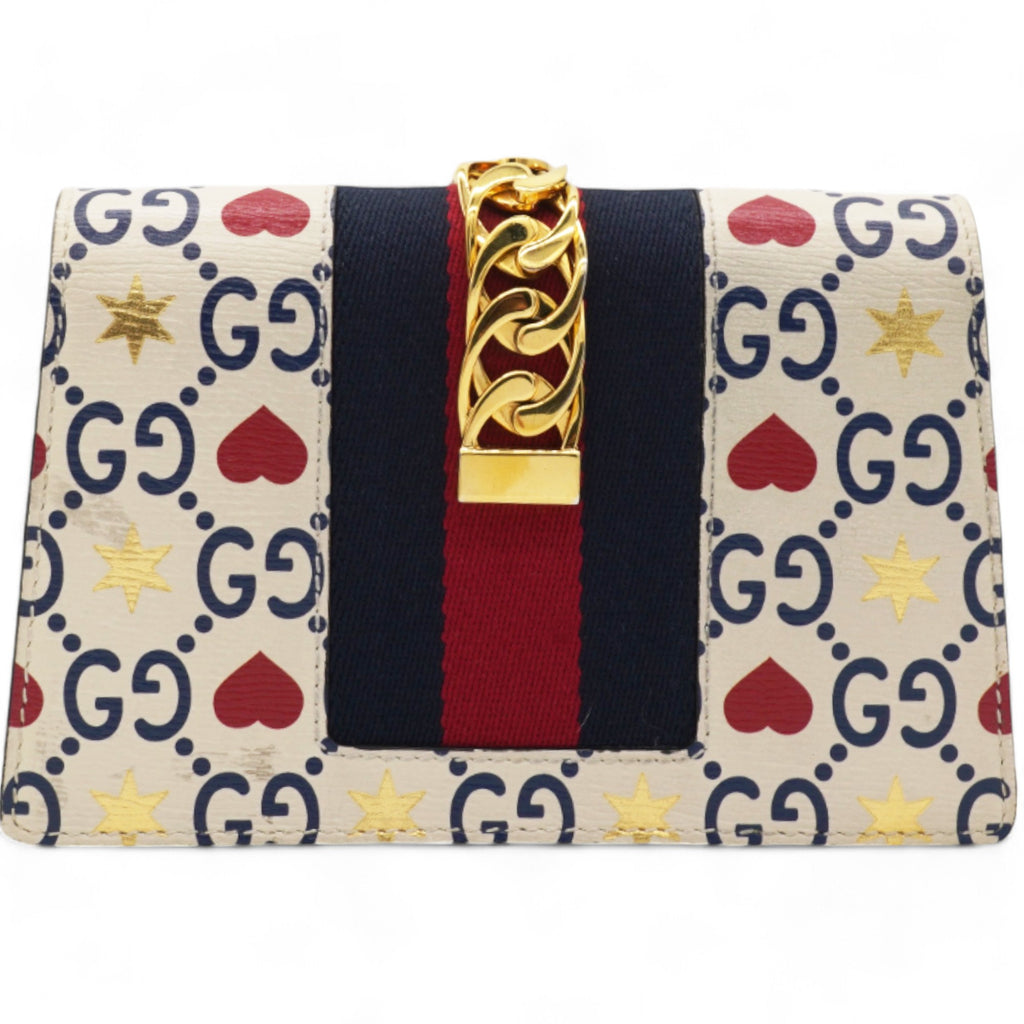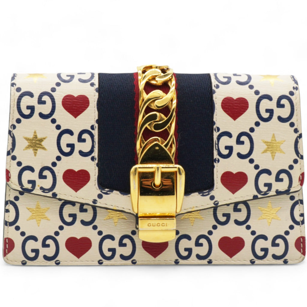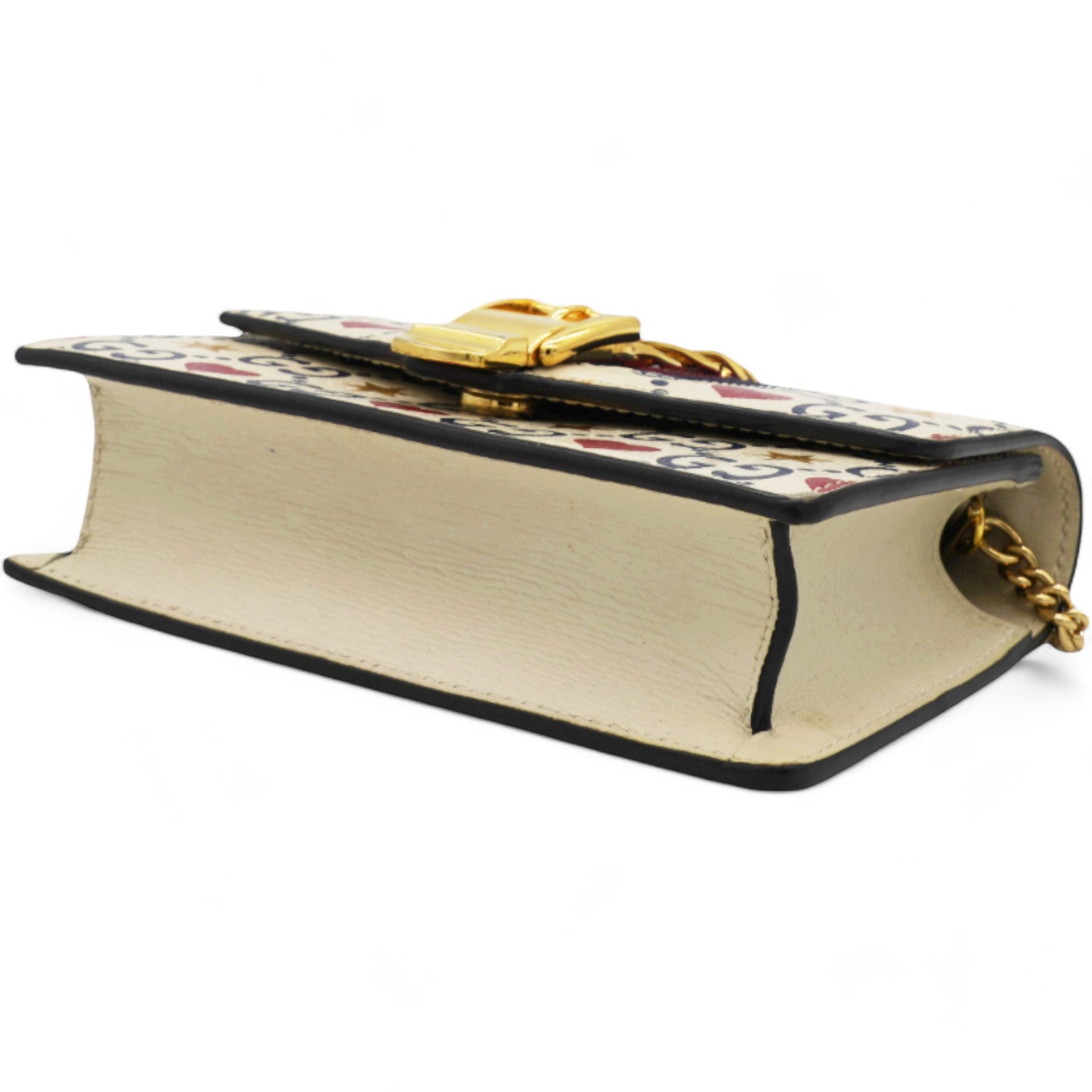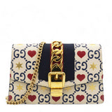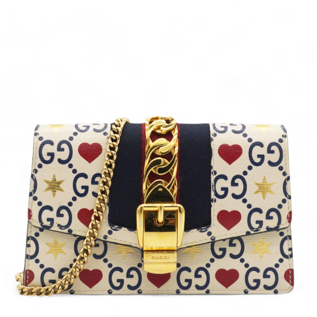 | This chic limited edition shoulder bag is crafted of smooth off white calfskin leather with a blue GG logo, stars printed in gold foil and red hearts. It features a prominent front flap detailed with a central canvas red and blue web stripe. A top handle and shoulder strap complement the polished gold chain buckle lock closure. There is an optional shoulder strap crafted of twisted satin cording in white, red and blue with polished gold clasps as well as a white leather shoulder strap. The top flap opens to a light blue fabric interior with a patch pocket. |