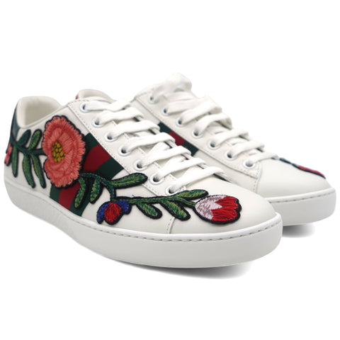 | These stylish sneakers are crafted of white leather with a stunning floral pattern. They feature white laces, red and green snakeskin-embossed panels and white rubber soles. |