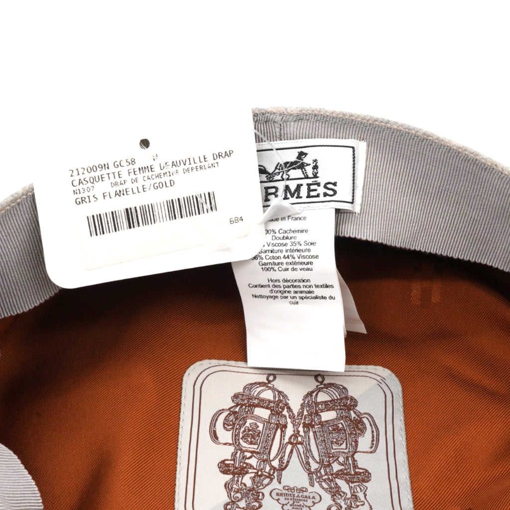 | This lovely hat is crafted of 100% cashmere in grey with woven brown leather trim and palladium and light brown enameled buttons with the Hermes logo. |