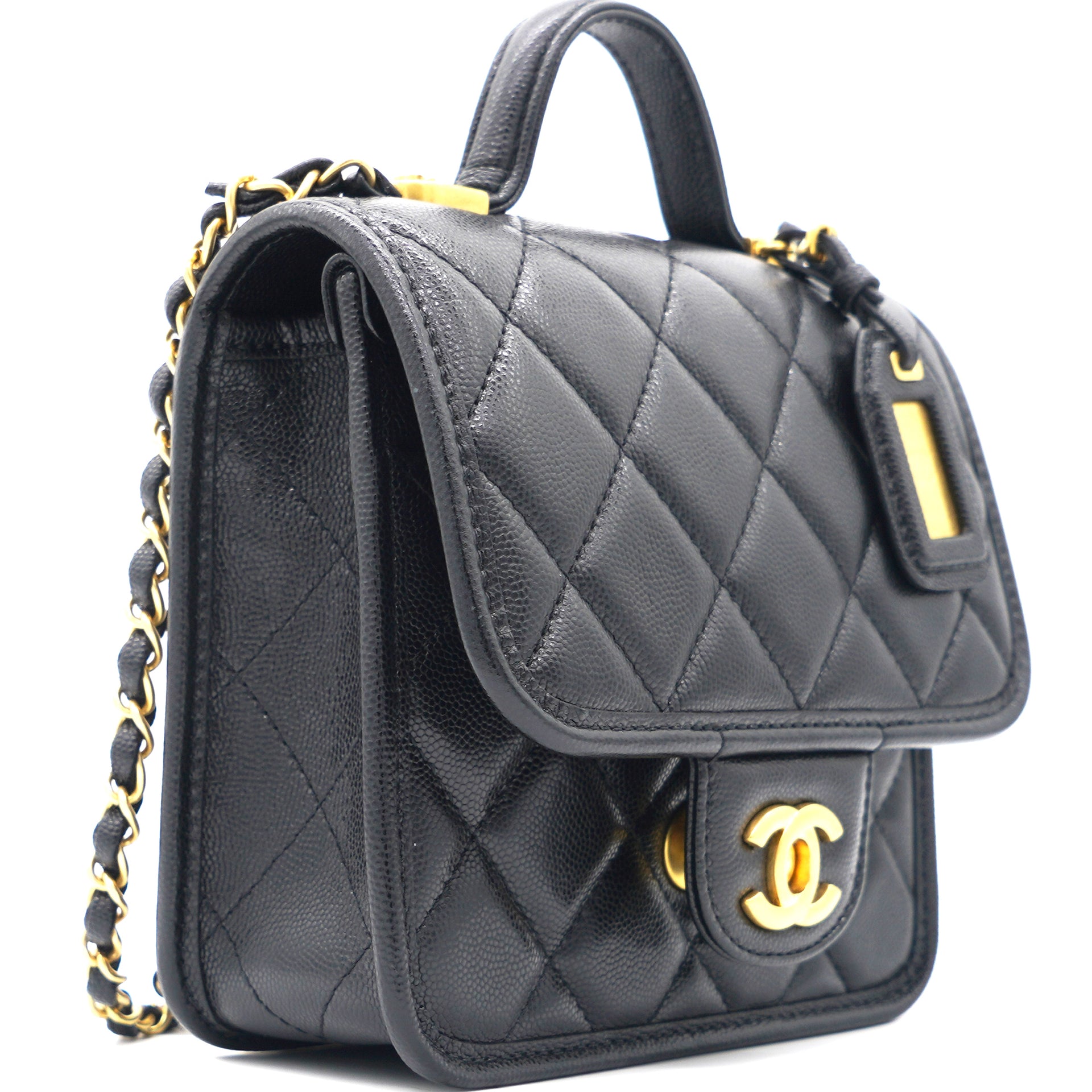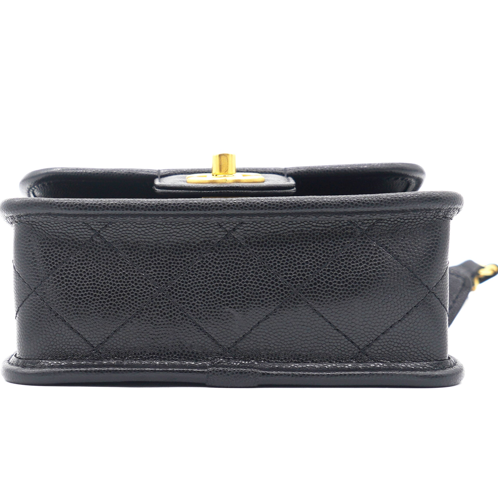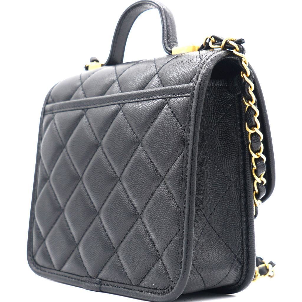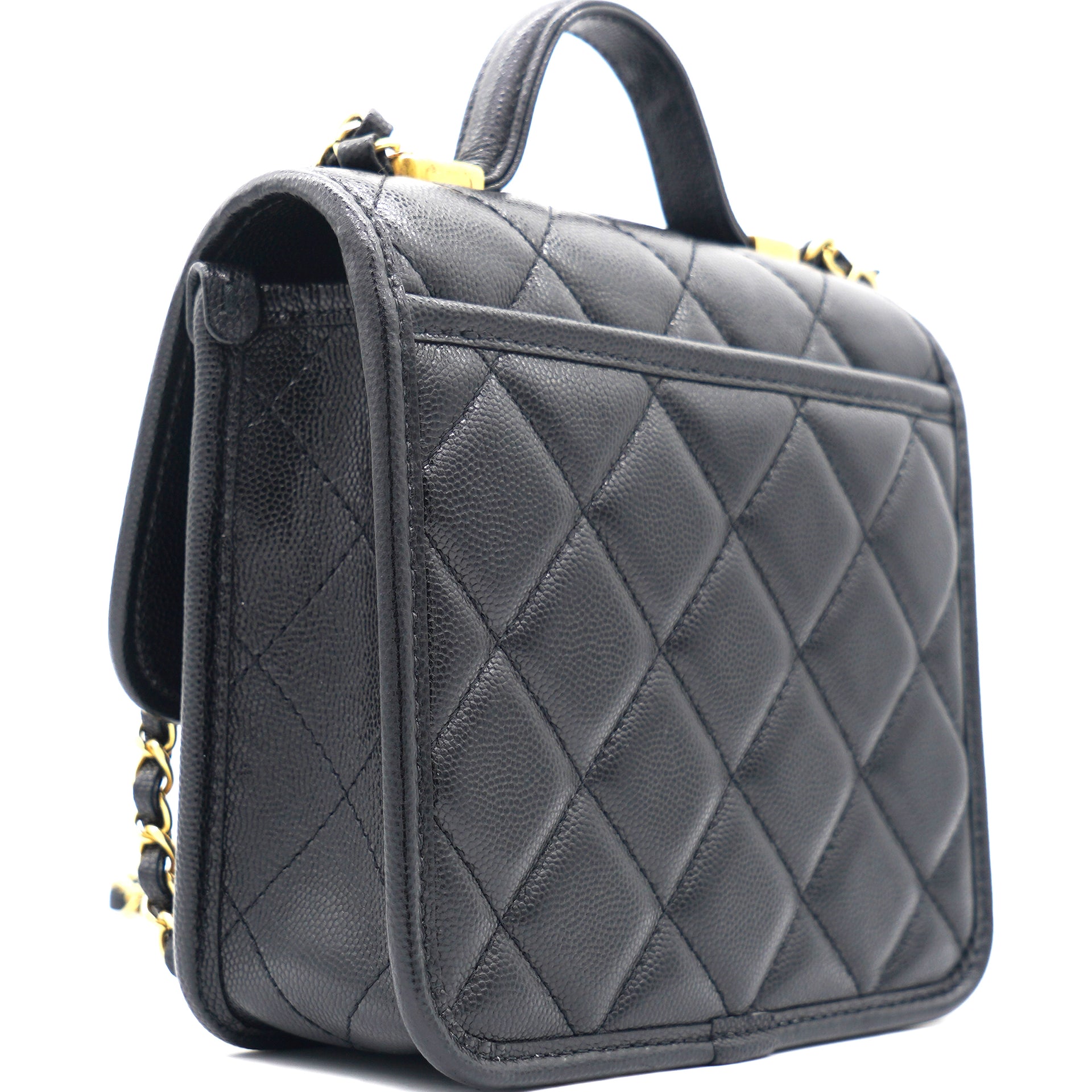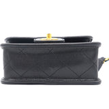 | This stylish crossbody is crafted of luxurious quilted caviar leather in black. The bag features a leather top handle, leather threaded gold chain-link shoulder strap, and gold hardware. |