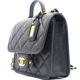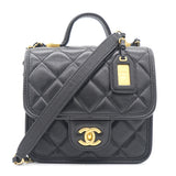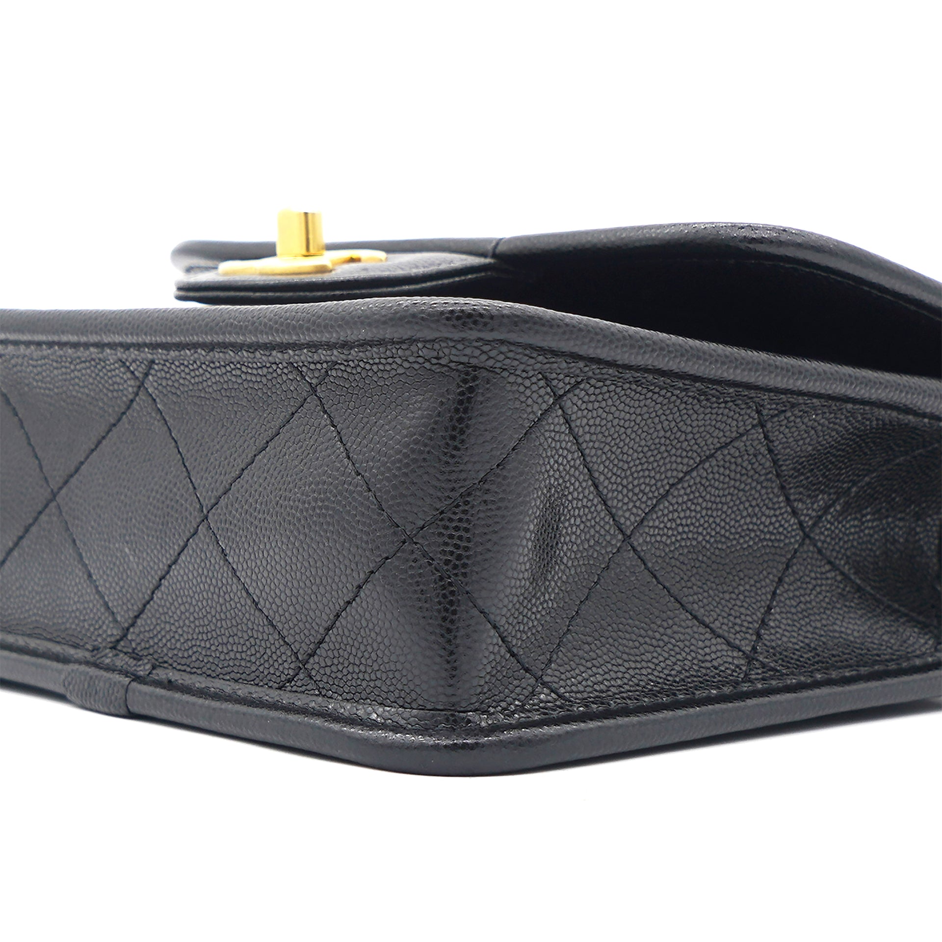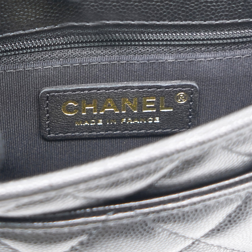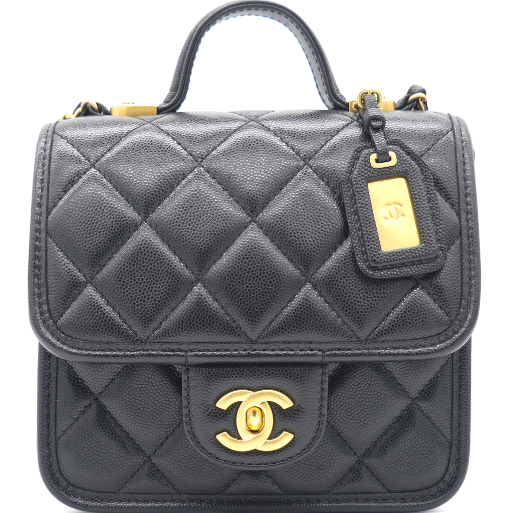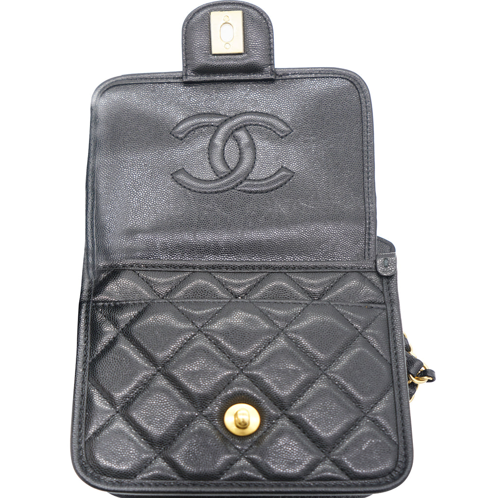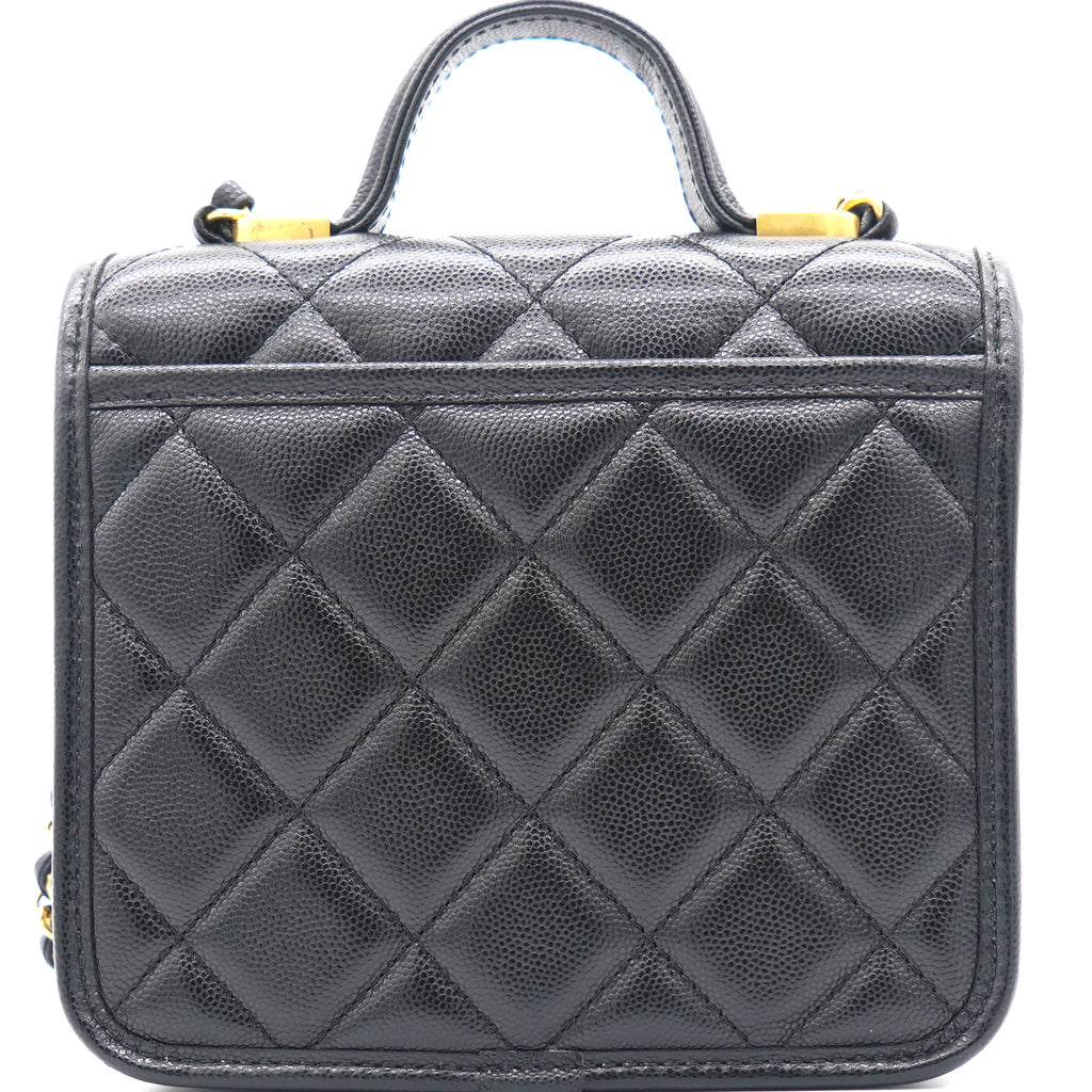 | This stylish crossbody is crafted of luxurious quilted caviar leather in black. The bag features a leather top handle, leather threaded gold chain-link shoulder strap, and gold hardware. |