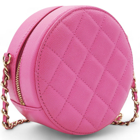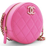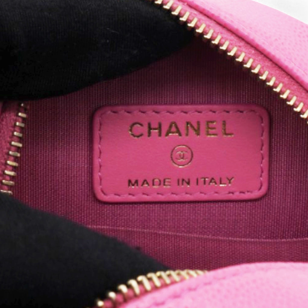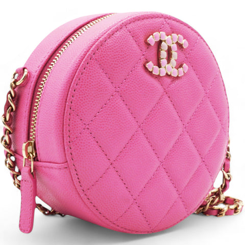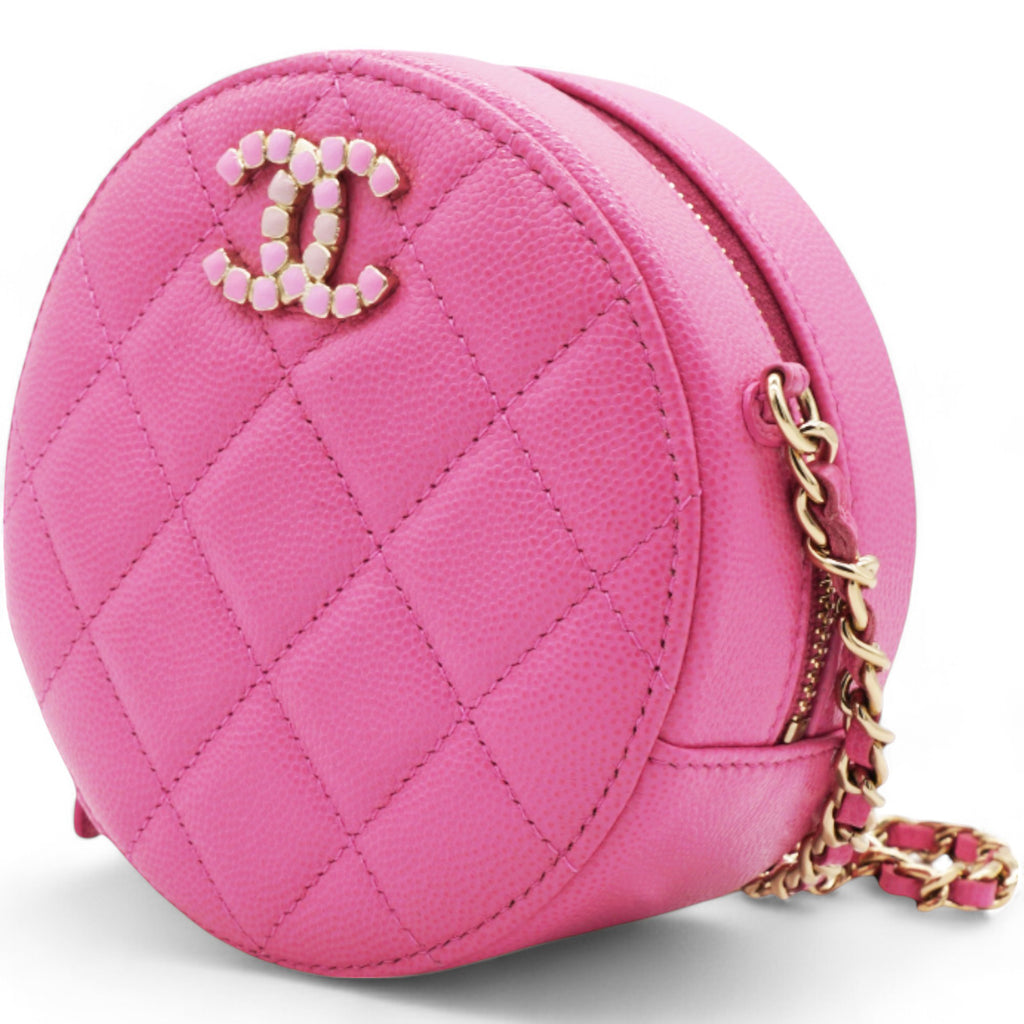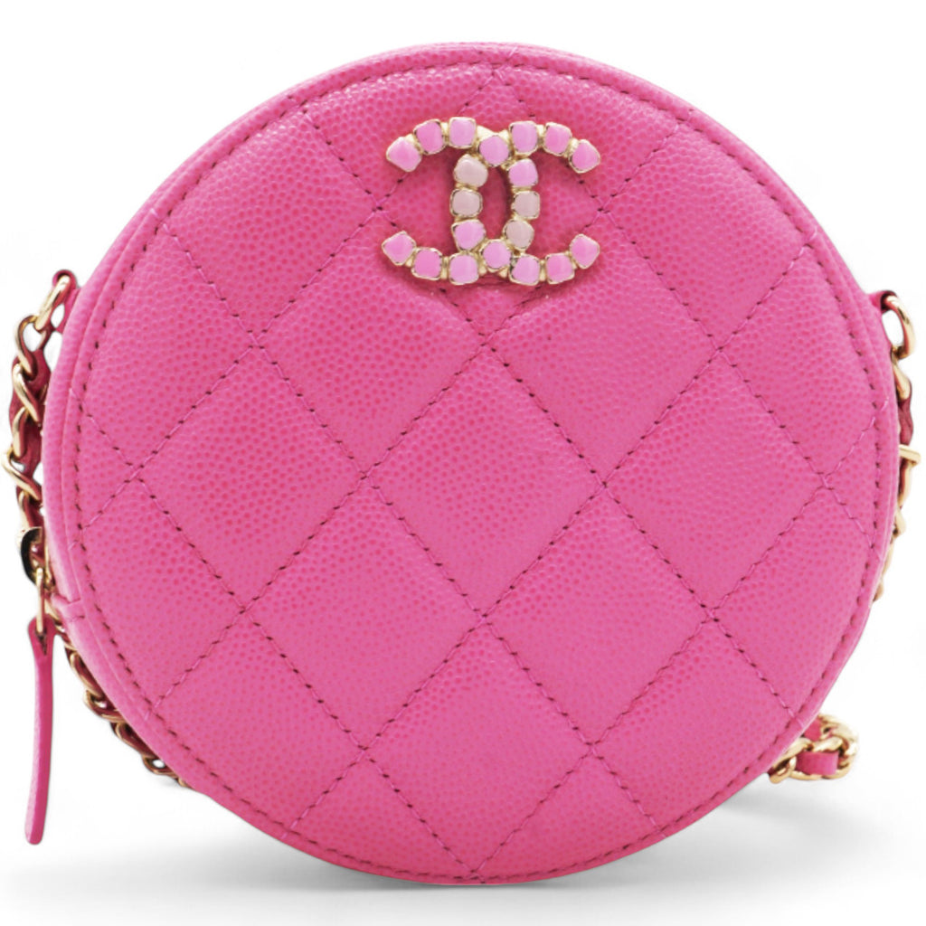 | This stylish crossbody clutch is crafted of luxurious caviar quilted leather in pink. The shoulder bag features a leather-threaded light gold chain-link shoulder strap and a crystal Chanel CC logo on the front in different pink tones. This shoulder bag opens with a top zipper to a light pink fabric interior with patch pockets. |