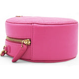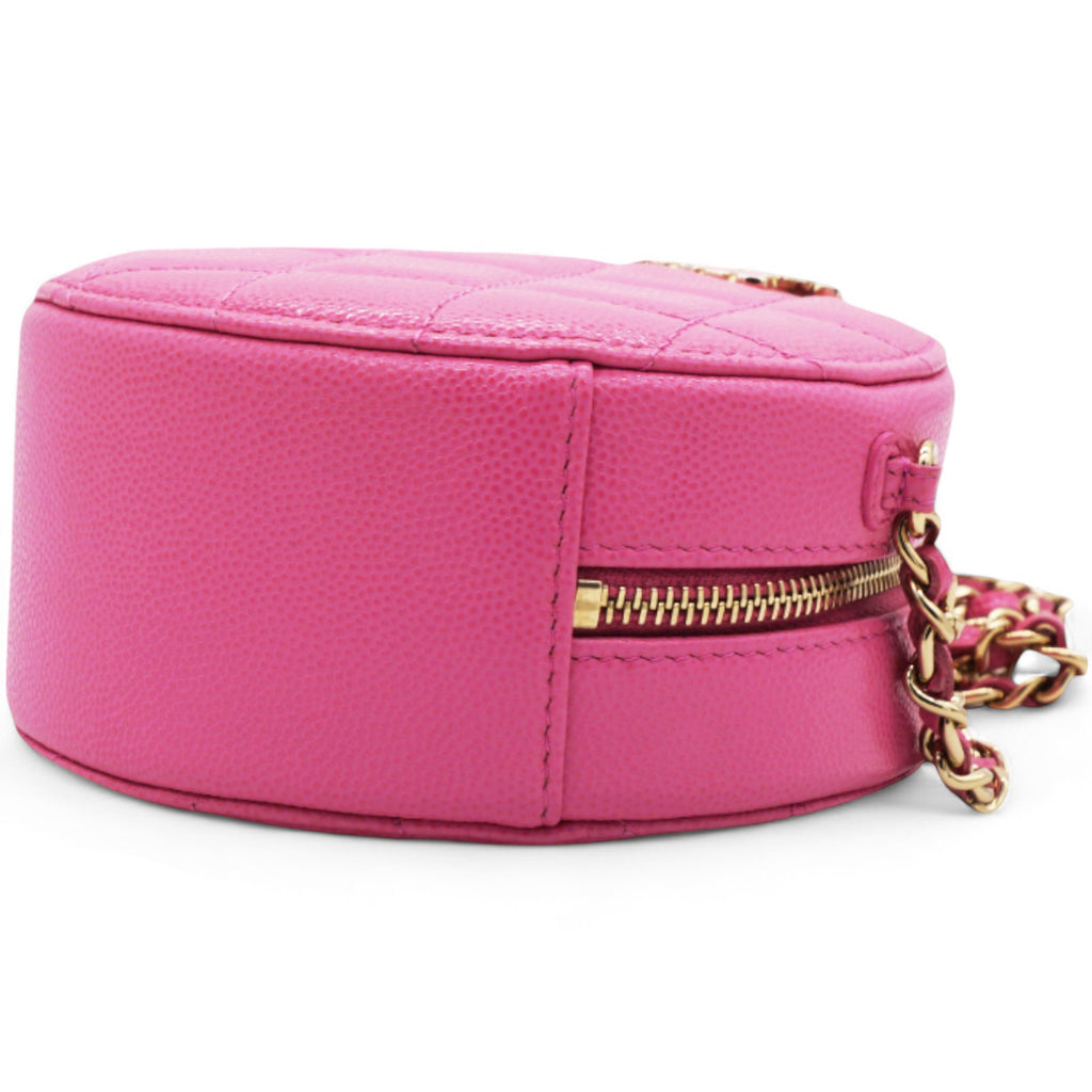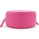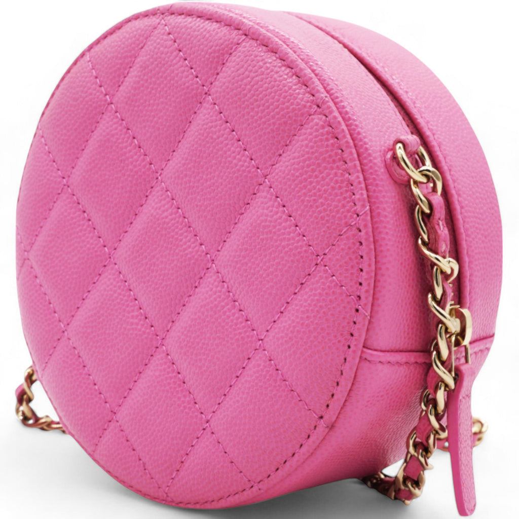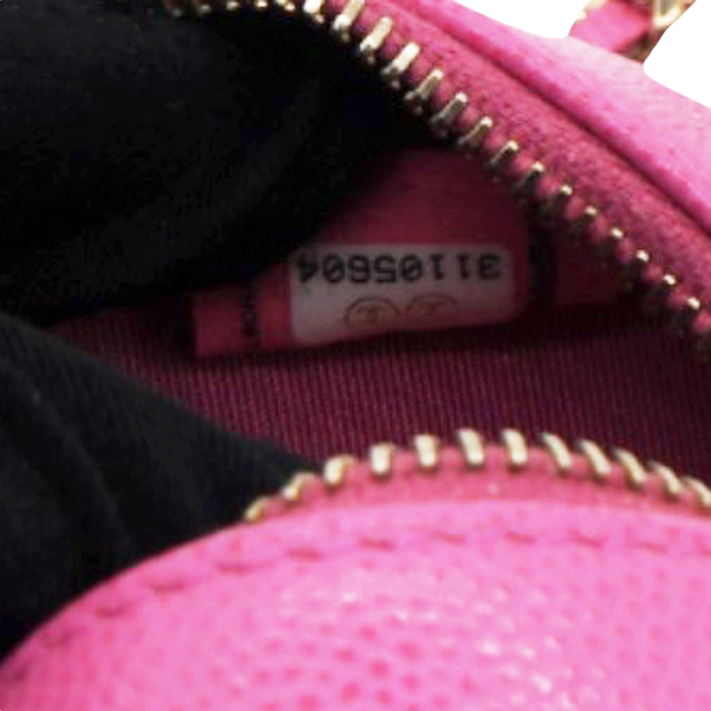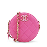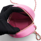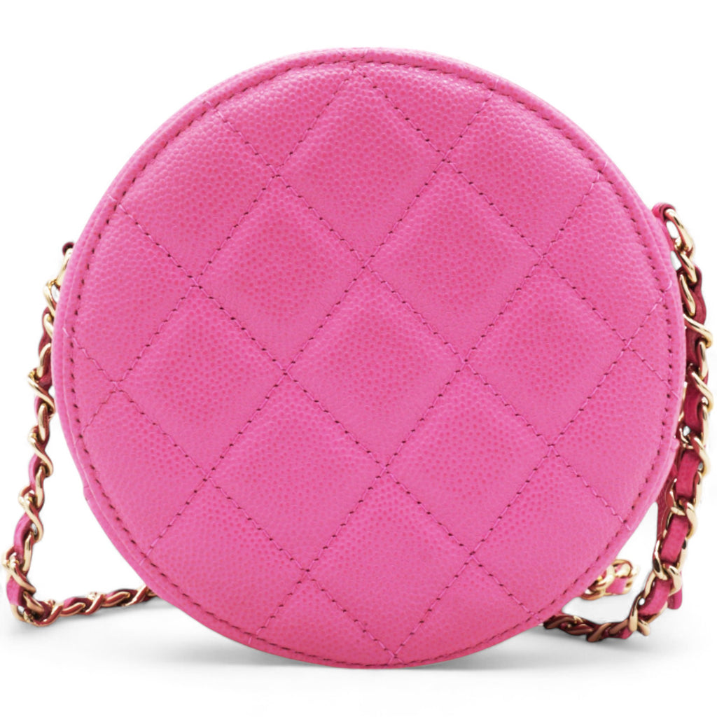 | This stylish crossbody clutch is crafted of luxurious caviar quilted leather in pink. The shoulder bag features a leather-threaded light gold chain-link shoulder strap and a crystal Chanel CC logo on the front in different pink tones. This shoulder bag opens with a top zipper to a light pink fabric interior with patch pockets. |