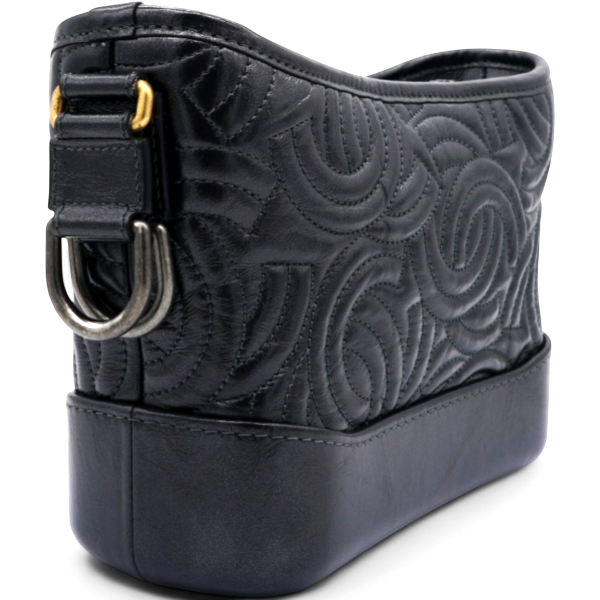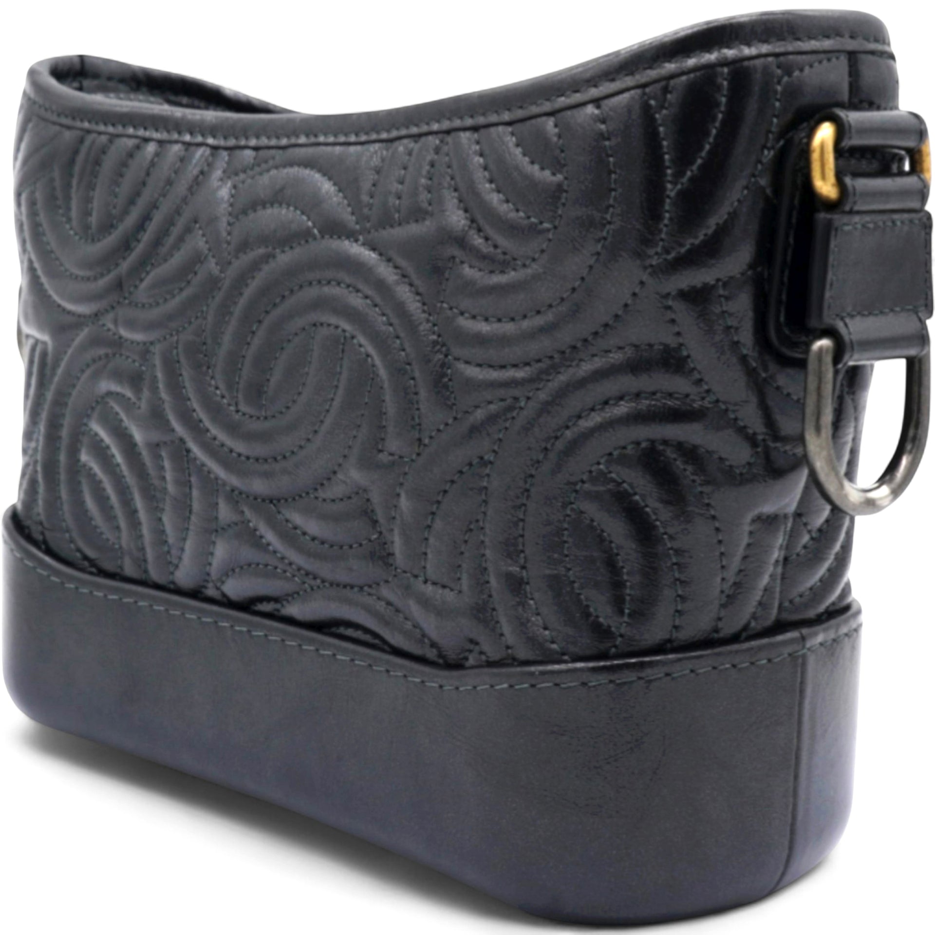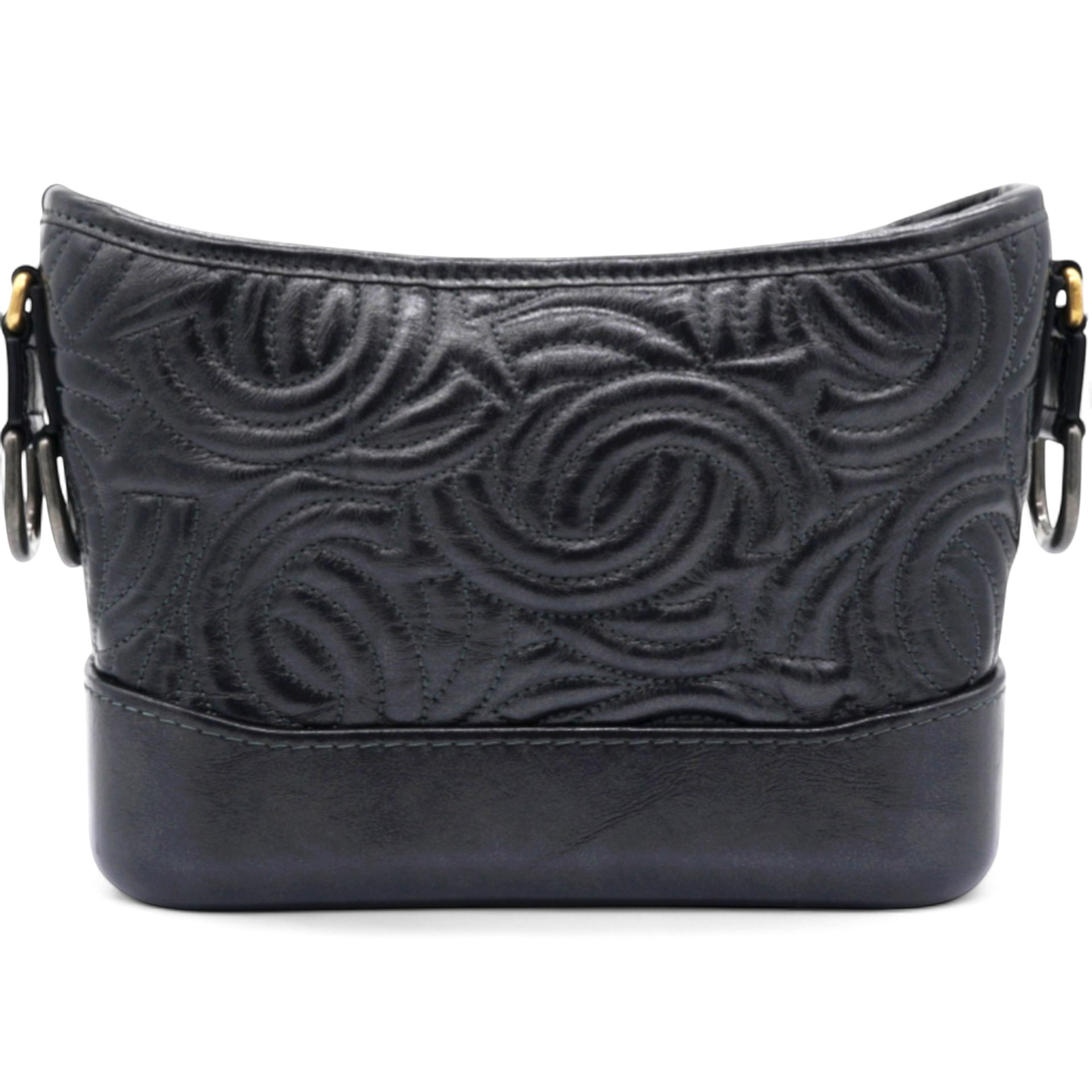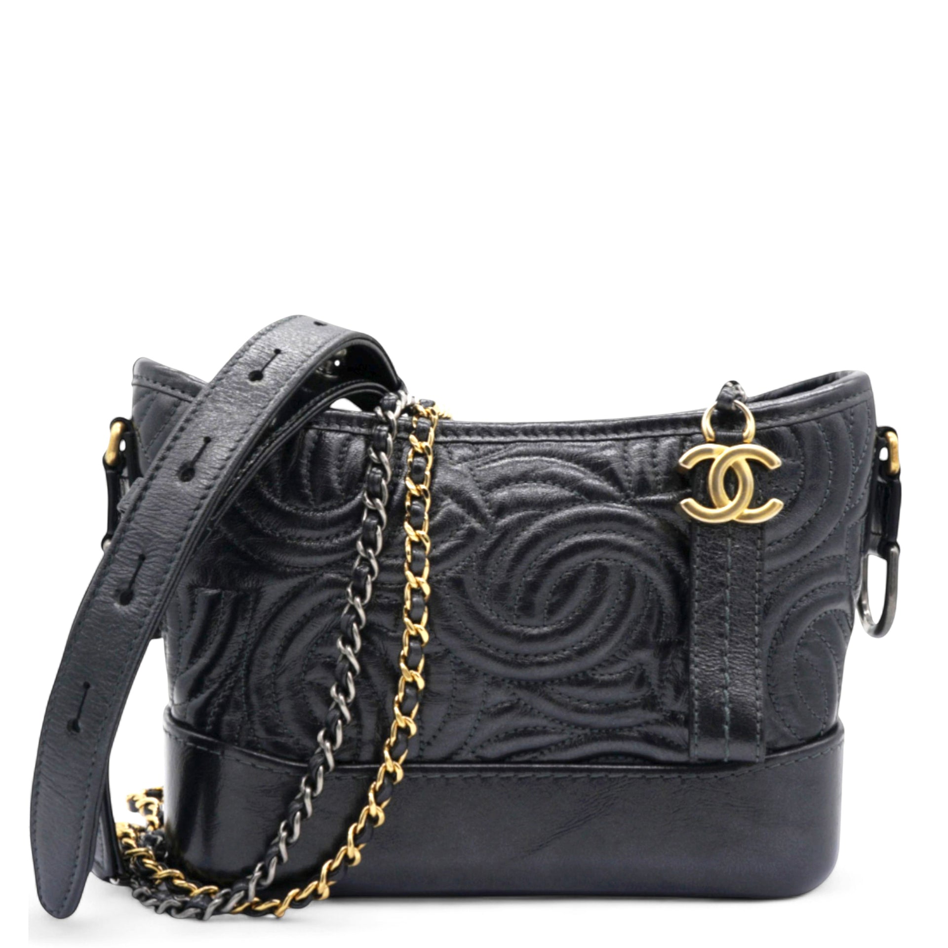 | The bag is crafted of a C-stitched aged calfskin leather in dark gray with a matching smooth leather base. The bag features a gradient gold to ruthenium chain-link leather threaded shoulder strap with a shoulder pad. The top zipper opens to a black fabric interior with zipper and patch pockets. |