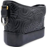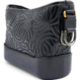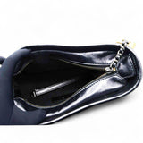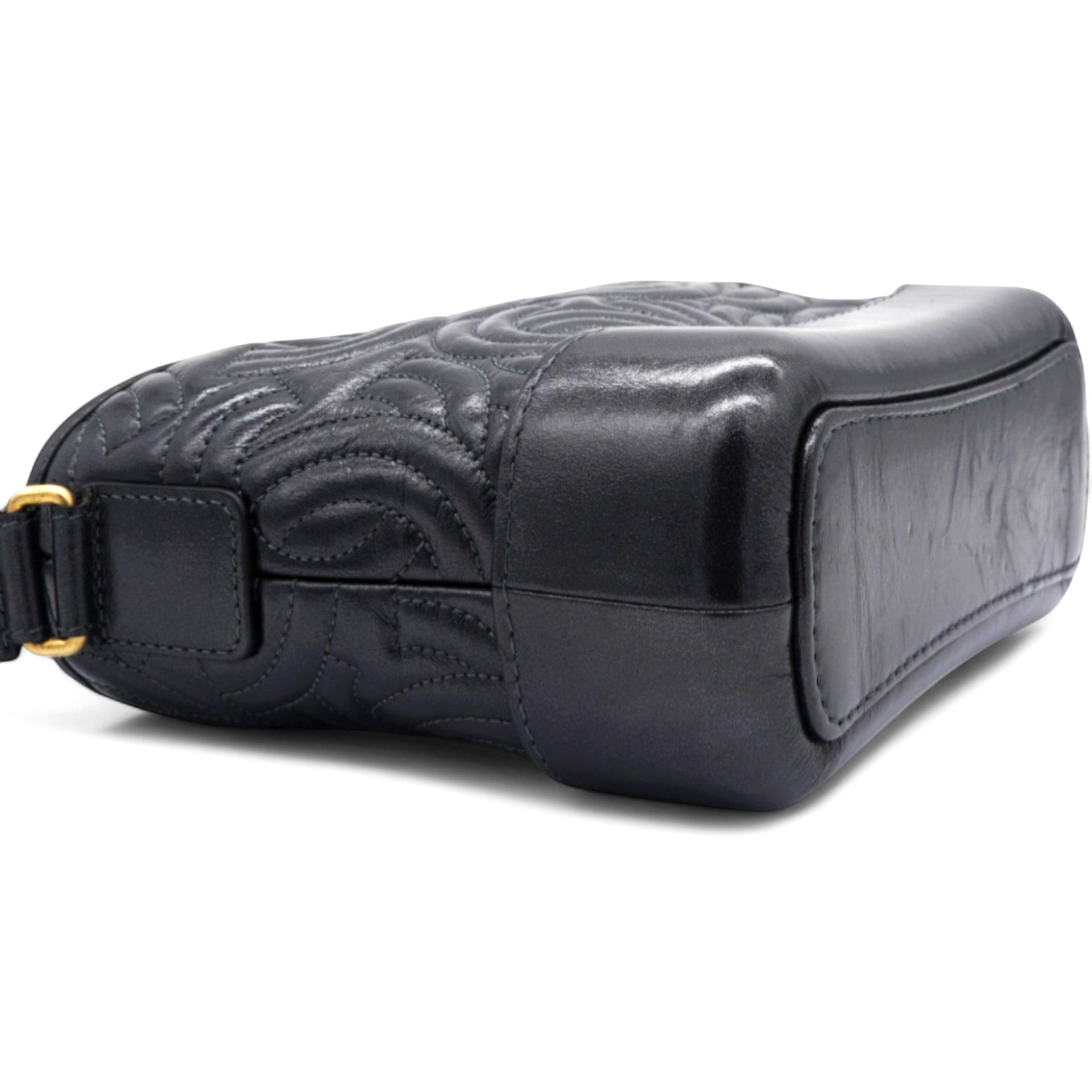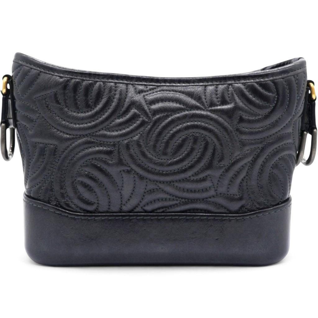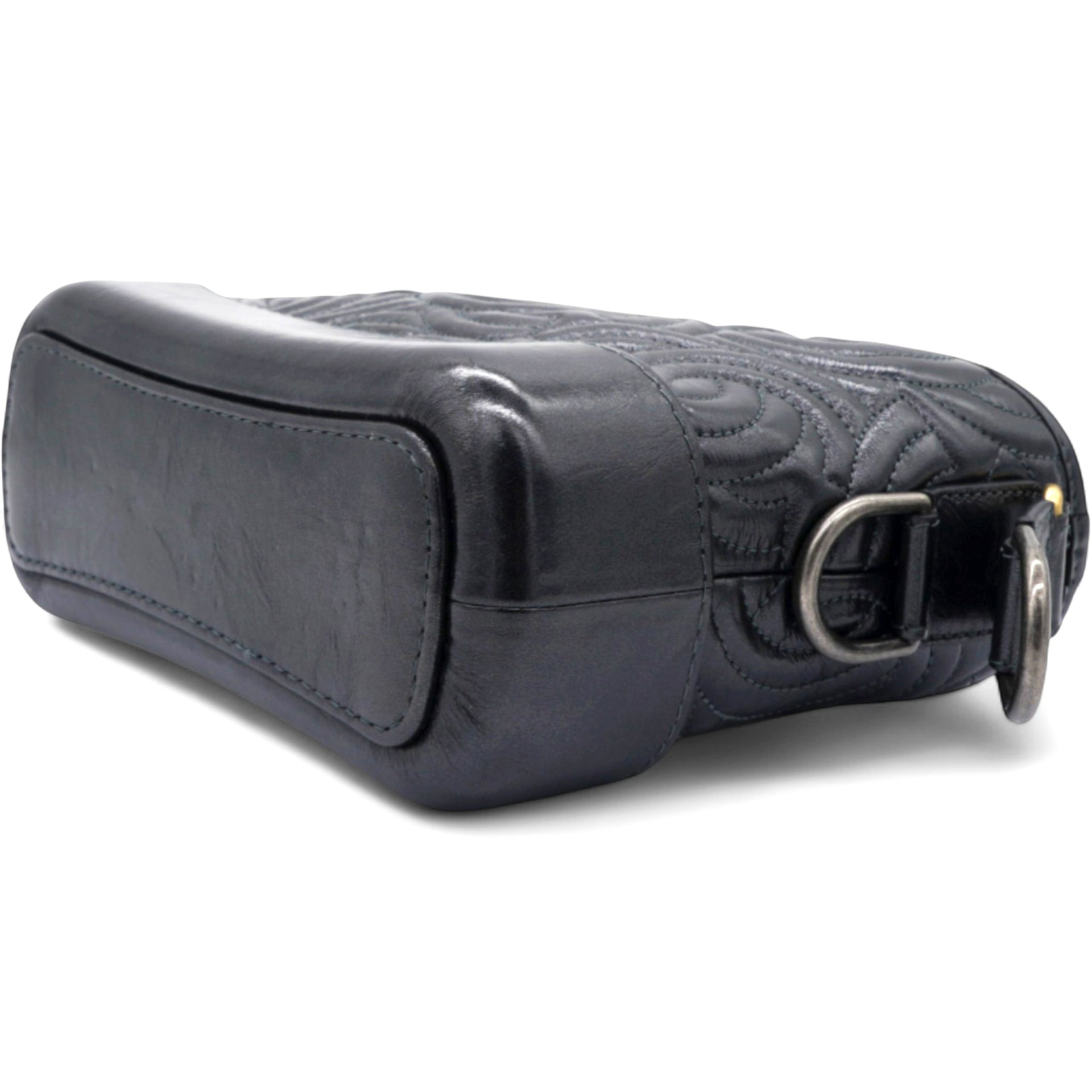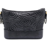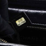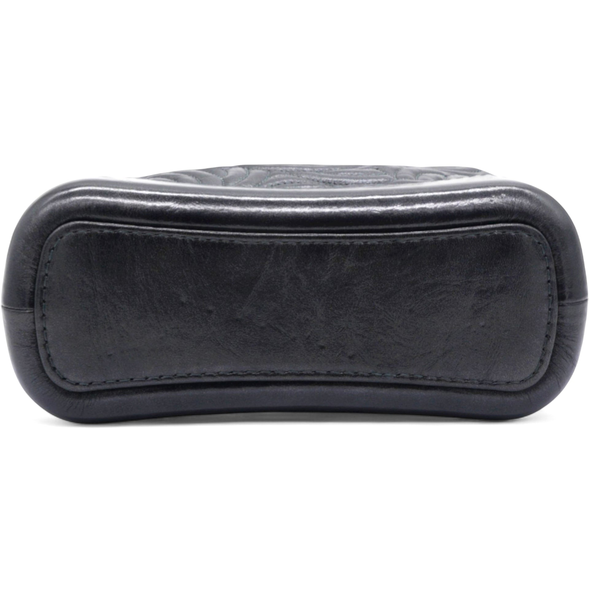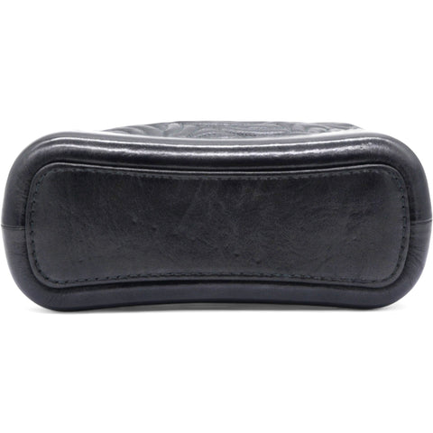 | The bag is crafted of a C-stitched aged calfskin leather in dark gray with a matching smooth leather base. The bag features a gradient gold to ruthenium chain-link leather threaded shoulder strap with a shoulder pad. The top zipper opens to a black fabric interior with zipper and patch pockets. |