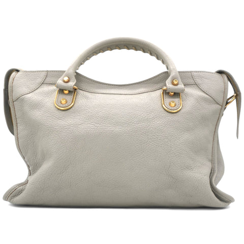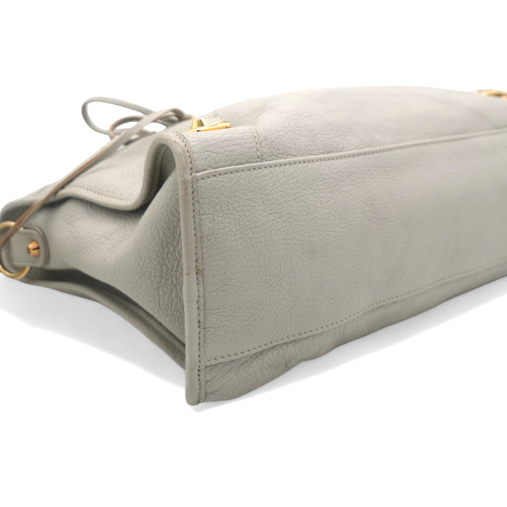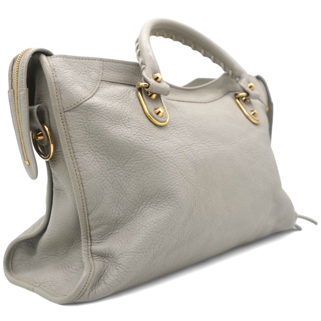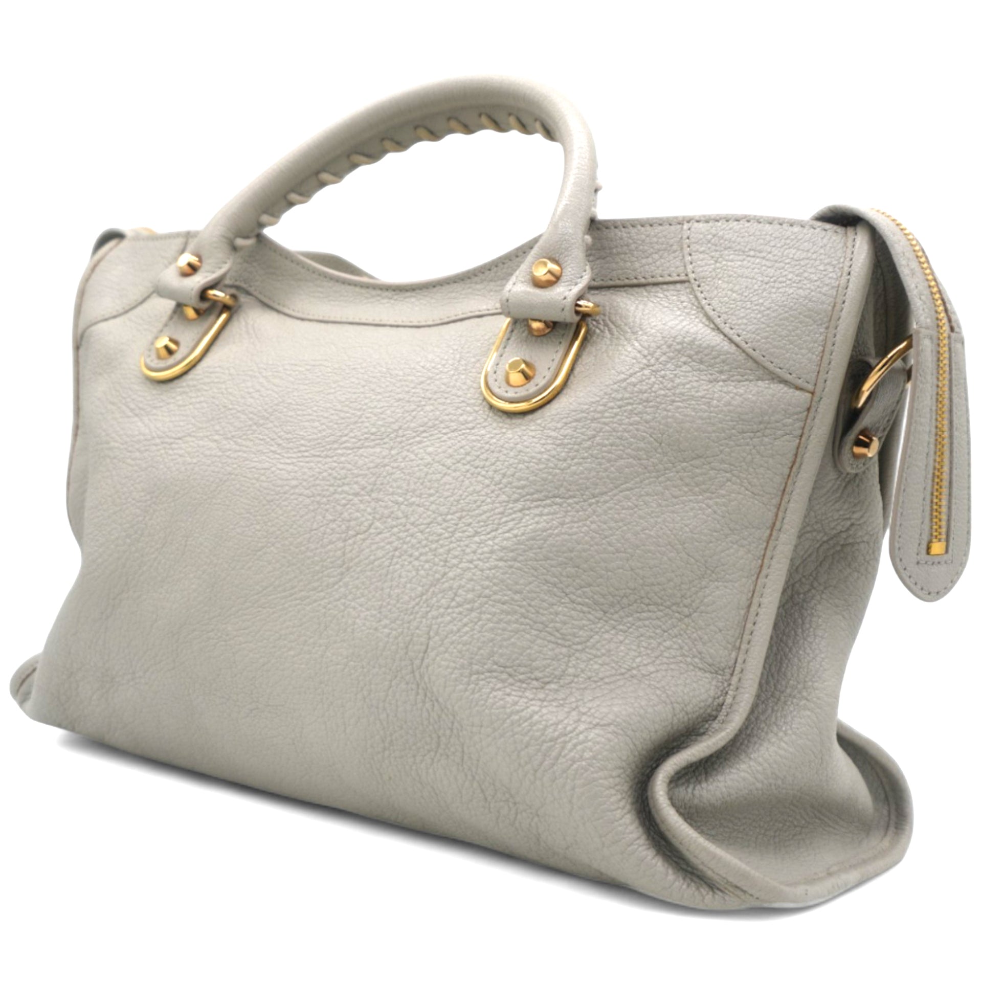 | This stylish tote is crafted of richly textured chèvre goatskin leather in gray. The bag features hand stitched rolled leather top handles, an optional cross body shoulder strap, an exterior zipper pocket for the hanging mirror, and polished gold hardware. The top zipper opens to a black fabric interior with a zipper pocket. This is a perfect everyday bag, with the distinctive style of Balenciaga |