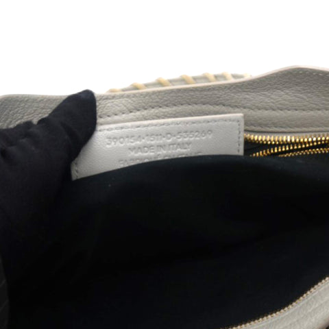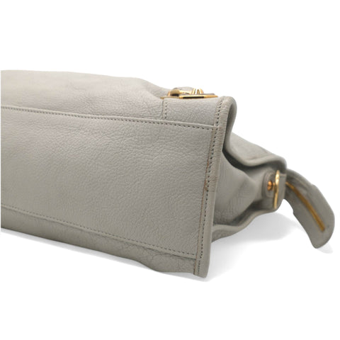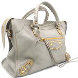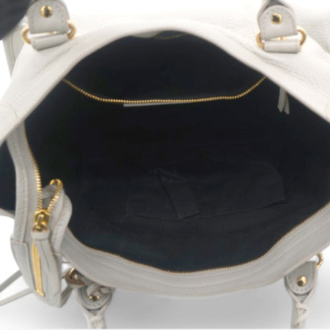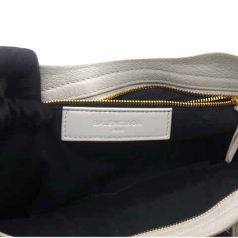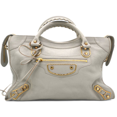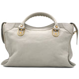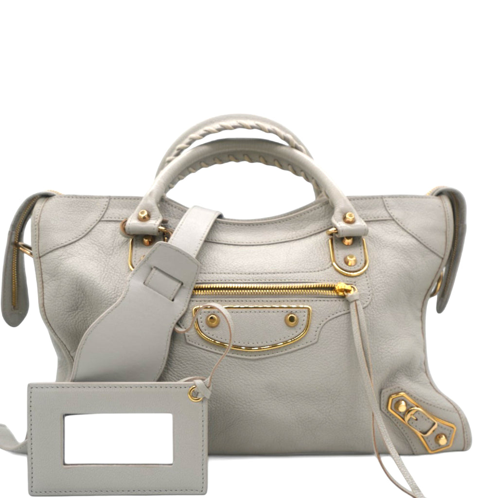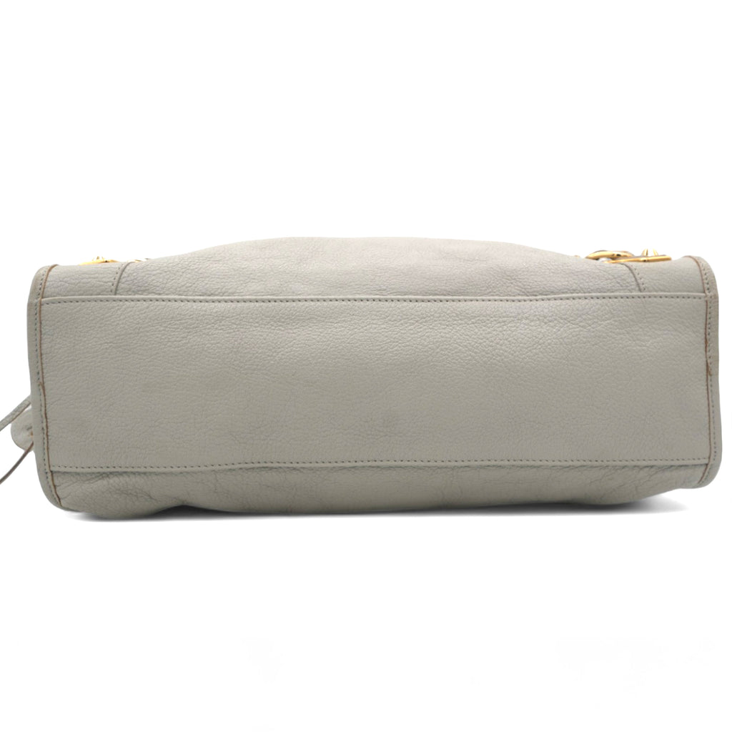 | This stylish tote is crafted of richly textured chèvre goatskin leather in gray. The bag features hand stitched rolled leather top handles, an optional cross body shoulder strap, an exterior zipper pocket for the hanging mirror, and polished gold hardware. The top zipper opens to a black fabric interior with a zipper pocket. This is a perfect everyday bag, with the distinctive style of Balenciaga |