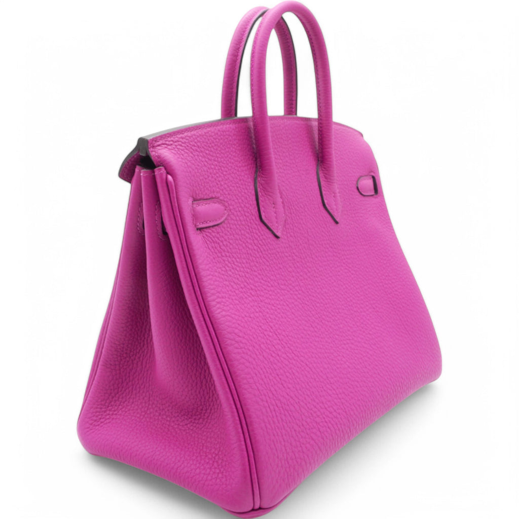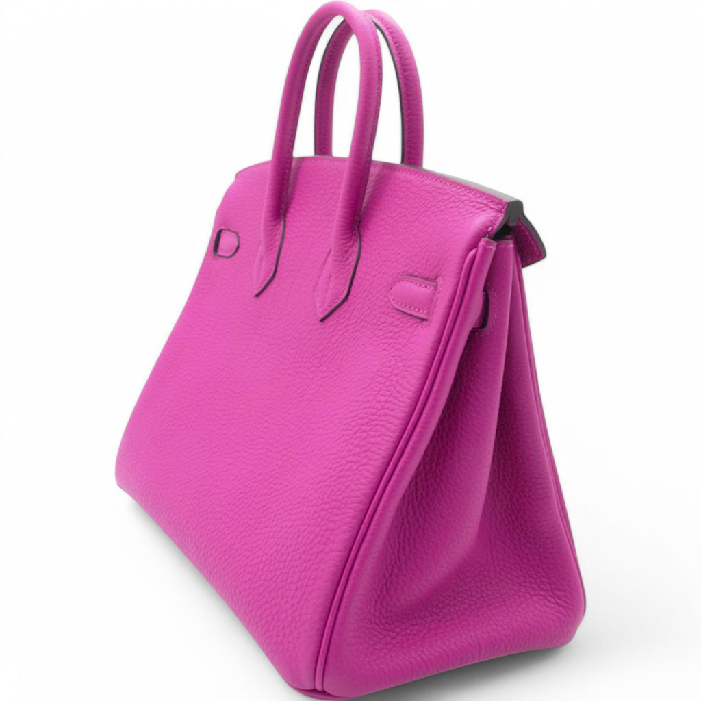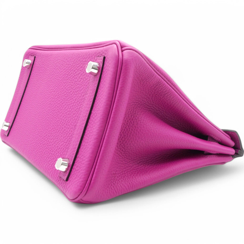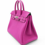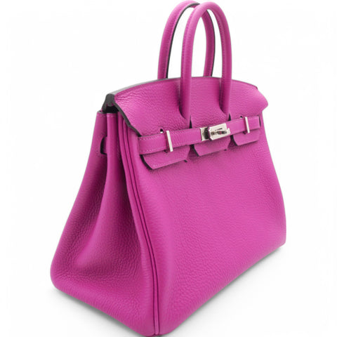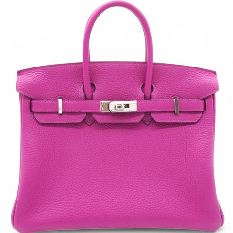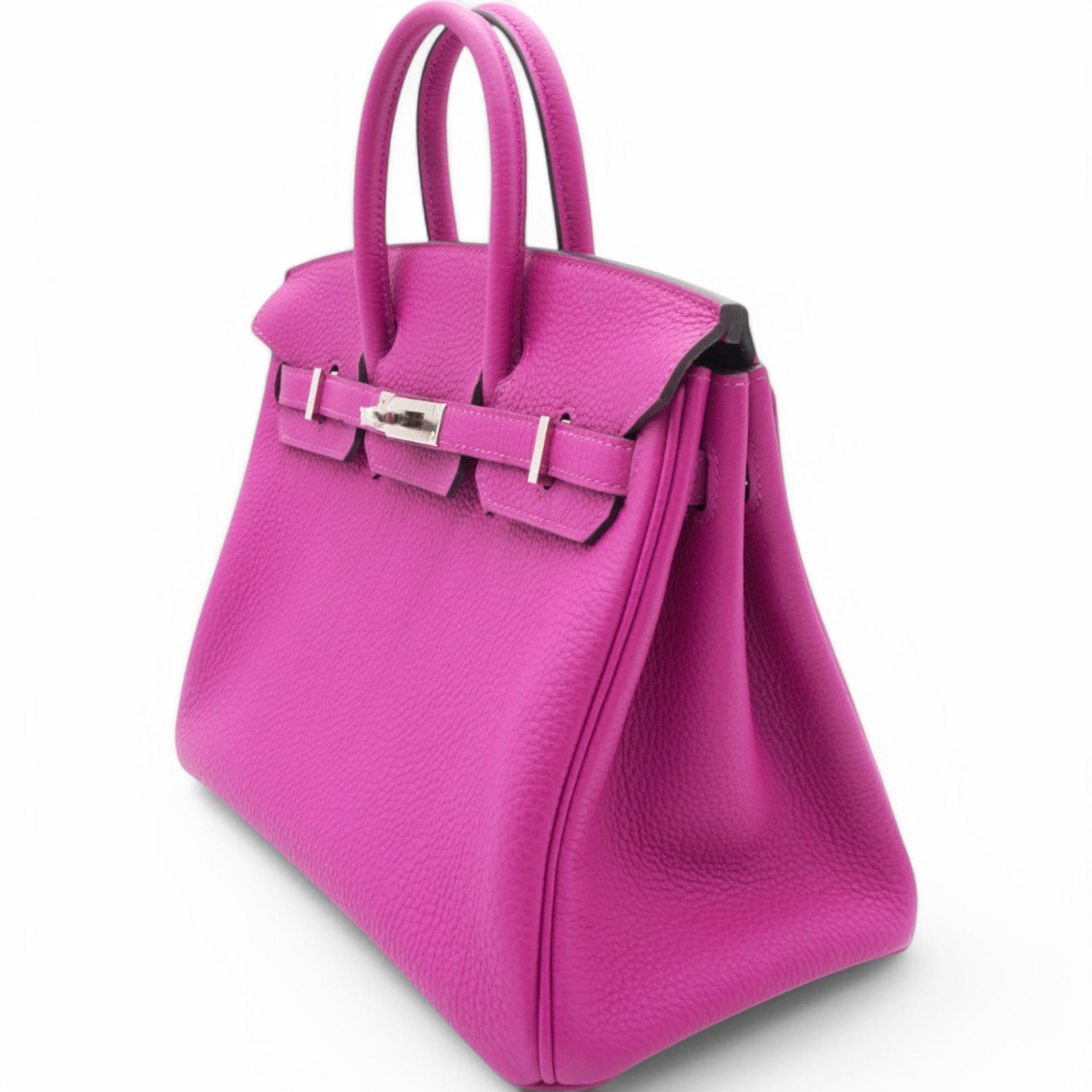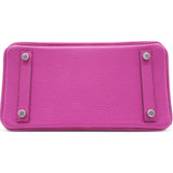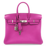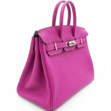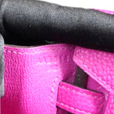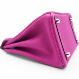 | This handbag crafted of goatskin chevre leather in two shades of purple. This handbag features purple rolled leather top handles, a frontal flap, a strap closure and silver plated hardware. This opens to a purple chevre goatskin leather interior with zipper and patch pockets. |