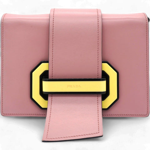 | This chic shoulder bag is crafted of leather in peach pink. The bag features a leather shoulder strap and a leather "ribbon" strap that crosses the front through a yellow plexiglass logo bar. |