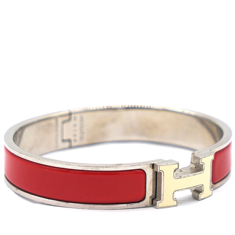 | This elegant 'Clic H' bracelet from the house of Hermes is designed in a narrow silhouette. It features a palladium-plated body with red enamel on it and the iconic 'H' logo swivel at the centre. Wear it with your favourite watch or as a solo piece. |
