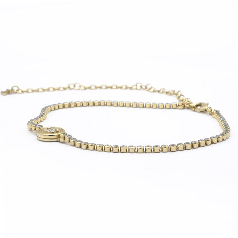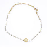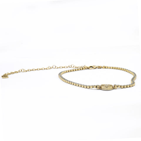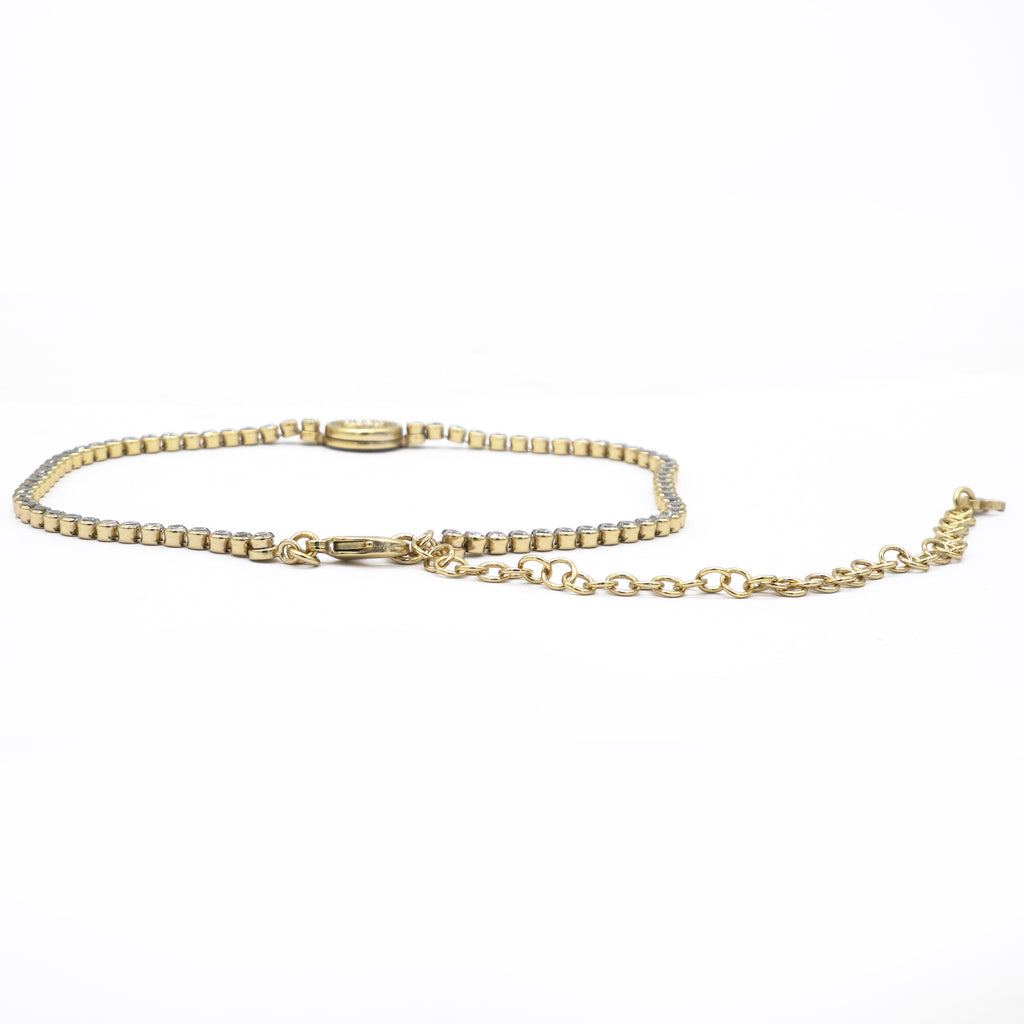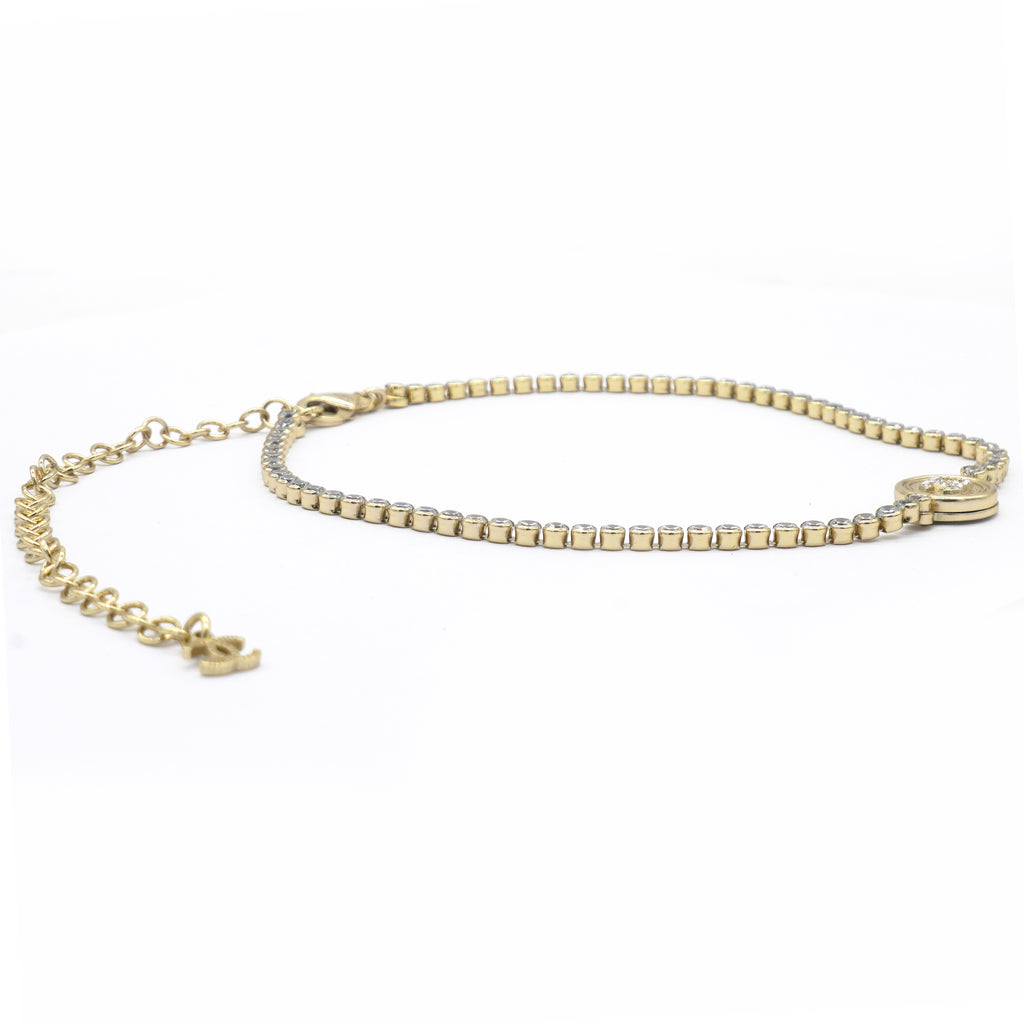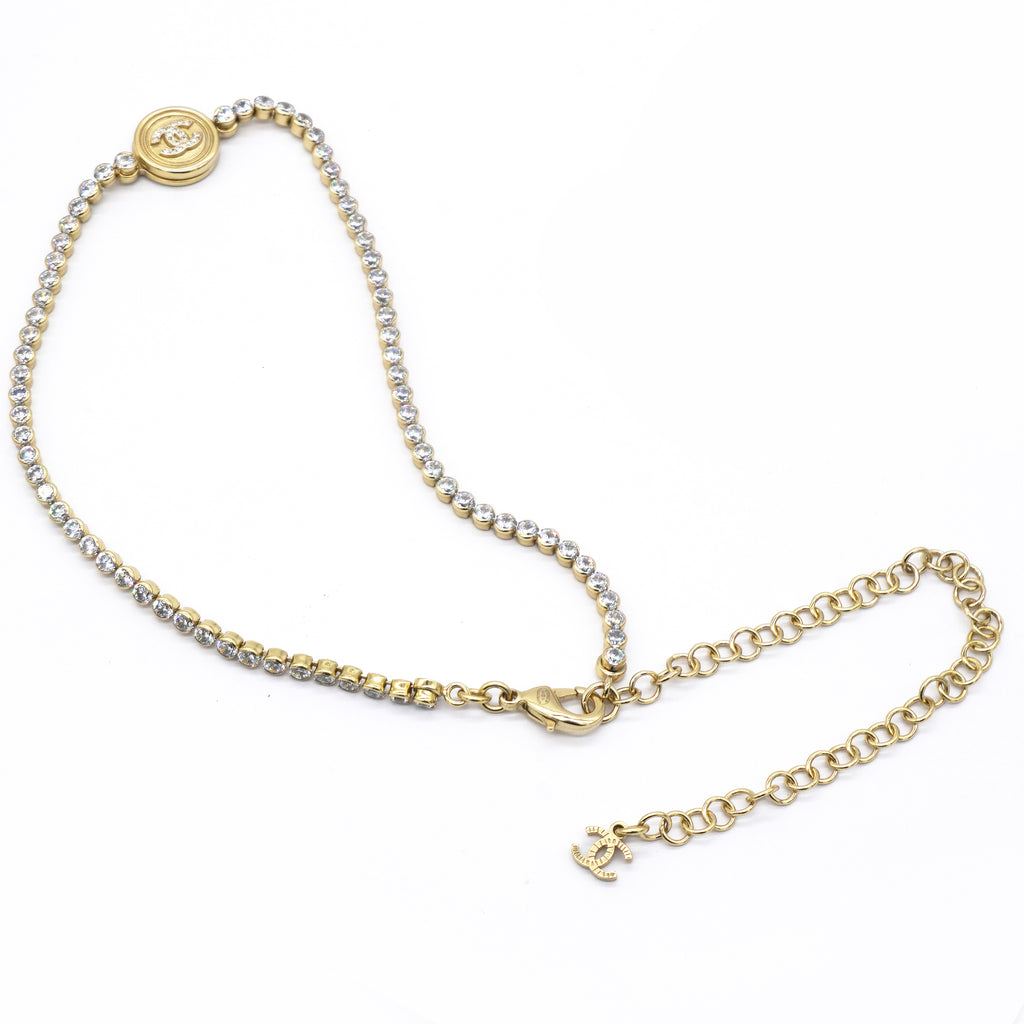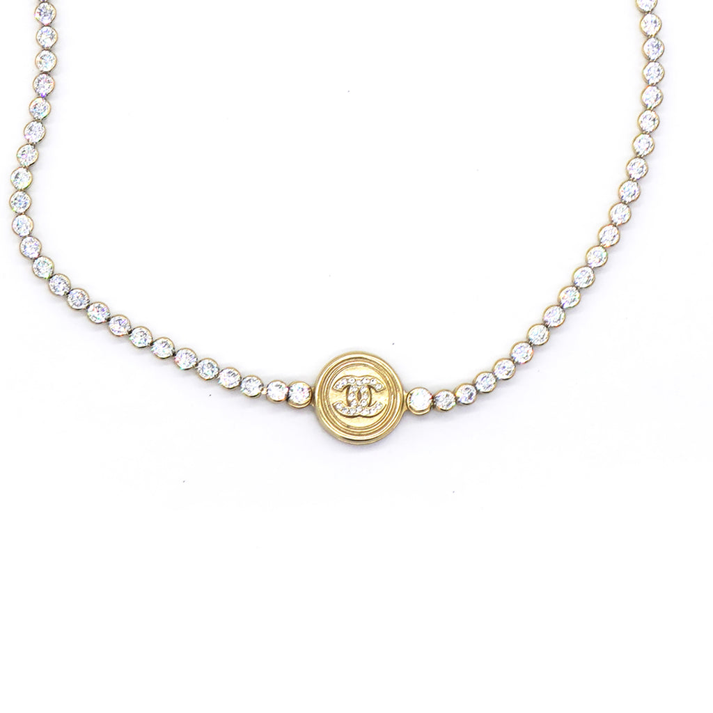 This lovely necklace is crafted with faux crystals and a crystal gold Chanel CC pendant.