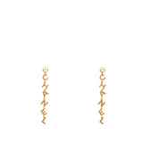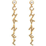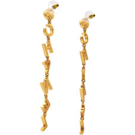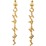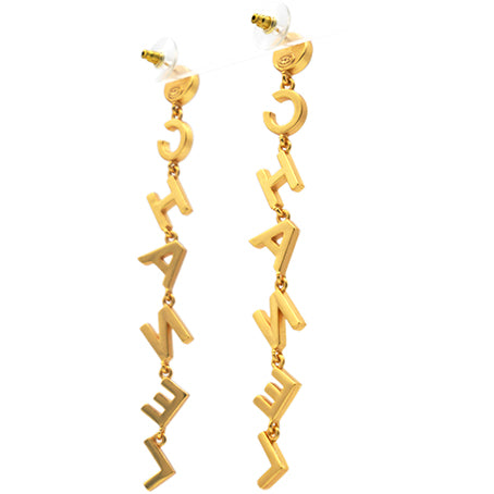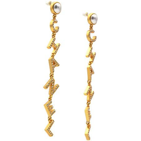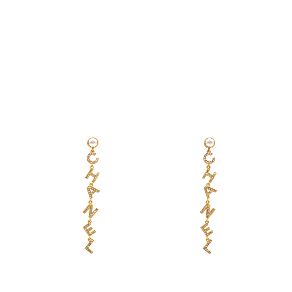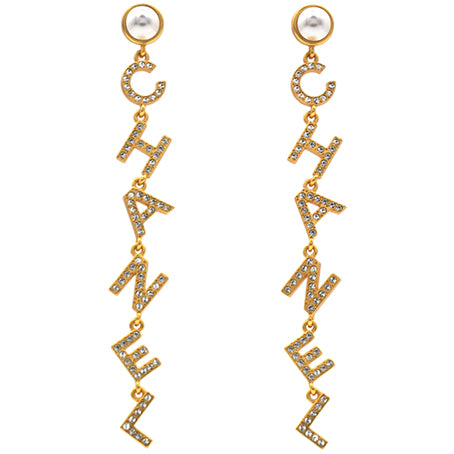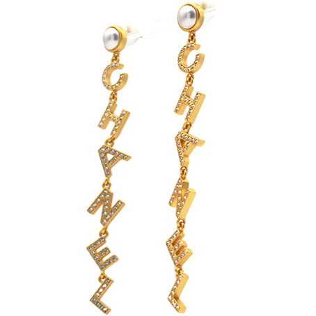 | These long earrings feature a gold Chanel logo drop pendant set with crystals, suspended from a faux pearl stud. These are fabulous earrings for special occasions from Chanel! |
