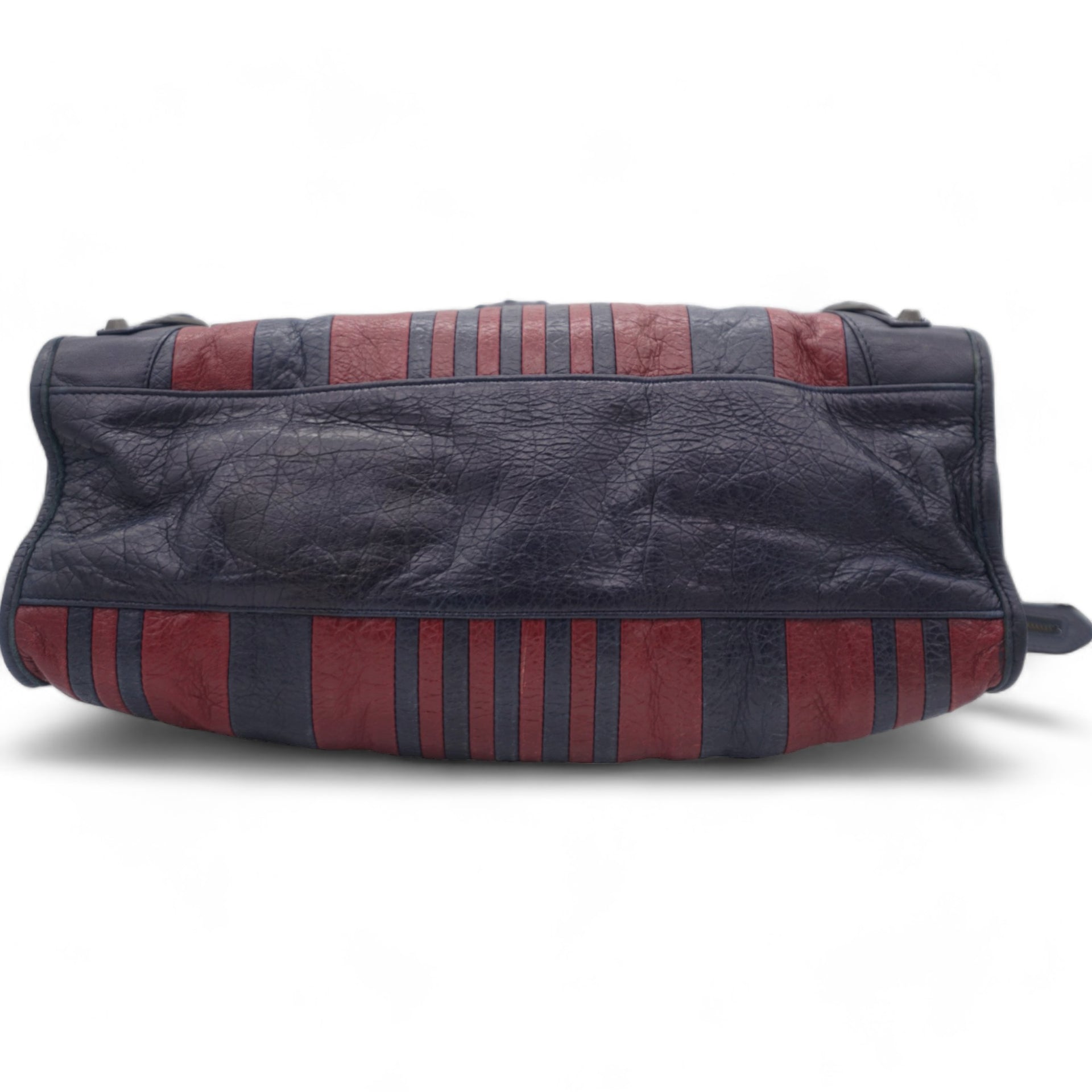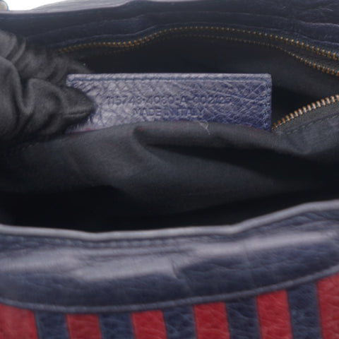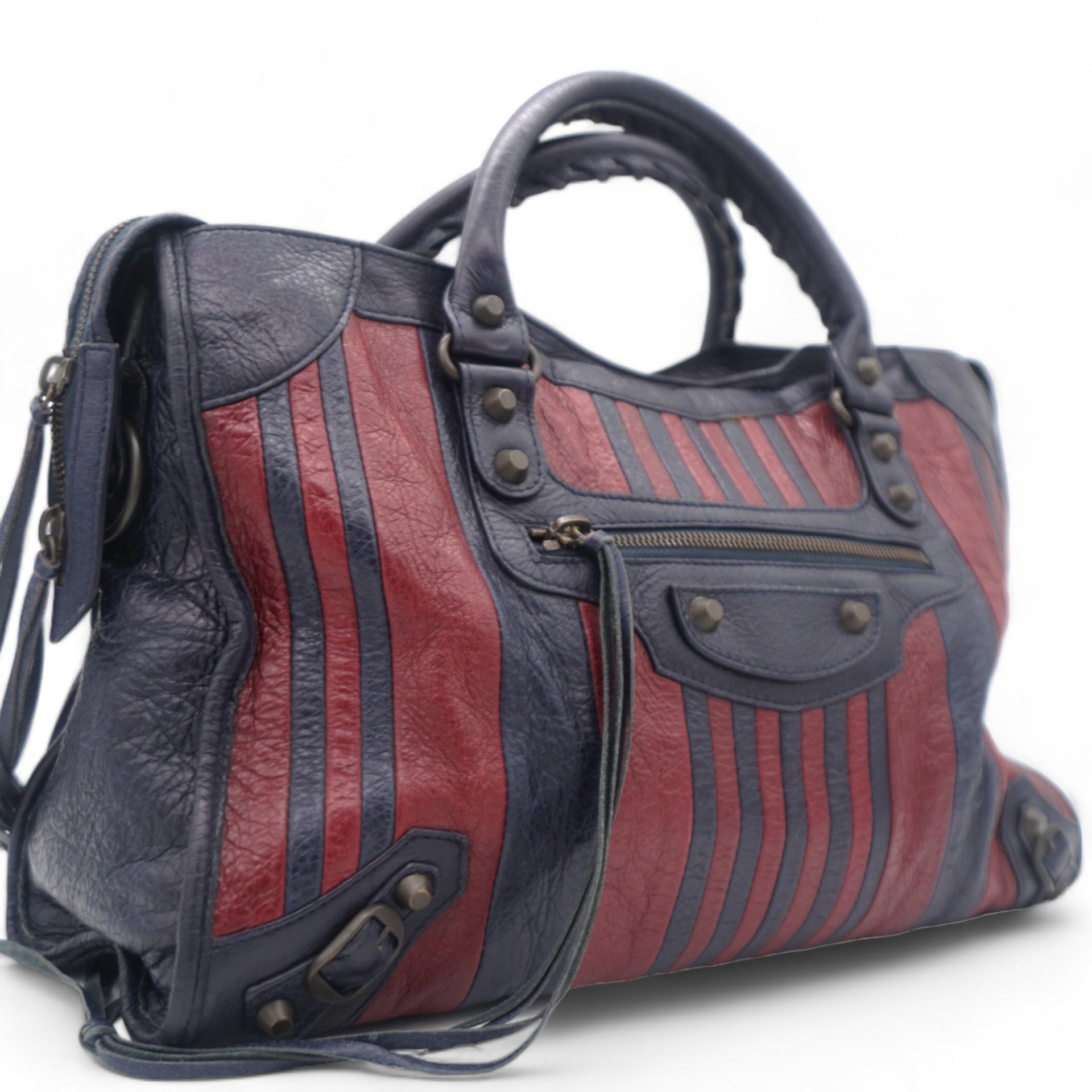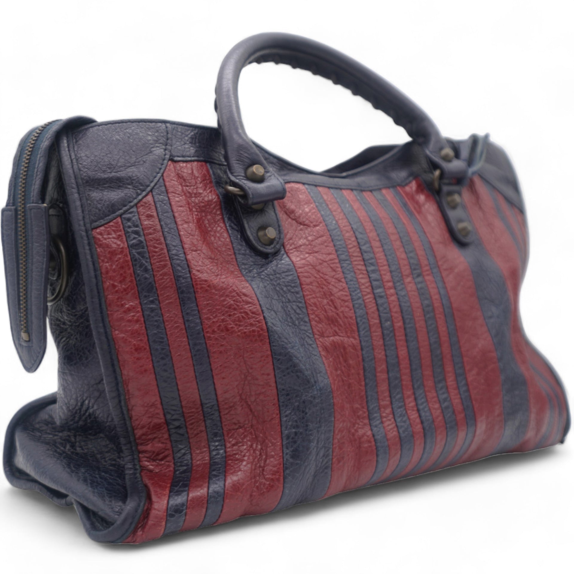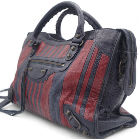 | This chic tote is crafted of distressed calfskin leather in red and navy blue, embellished with aged brass buckles and studs. The bag features a front zipper pocket with a removable mirror, rolled leather top handles with handwoven whipstitch detail, and an optional, adjustable shoulder strap with aged brass hardware. The overextended top zippers open the bag to a black fabric interior with zipper and patch pockets. |