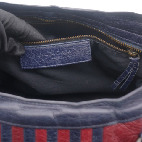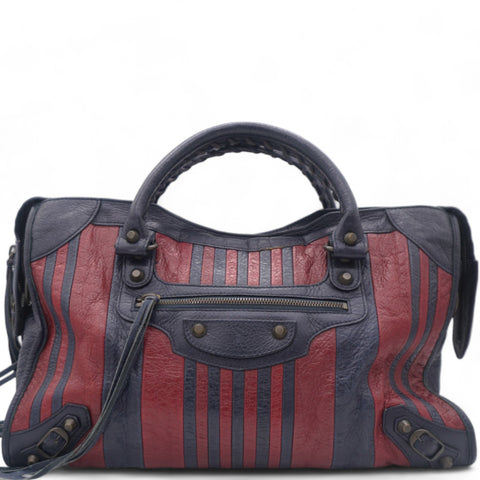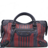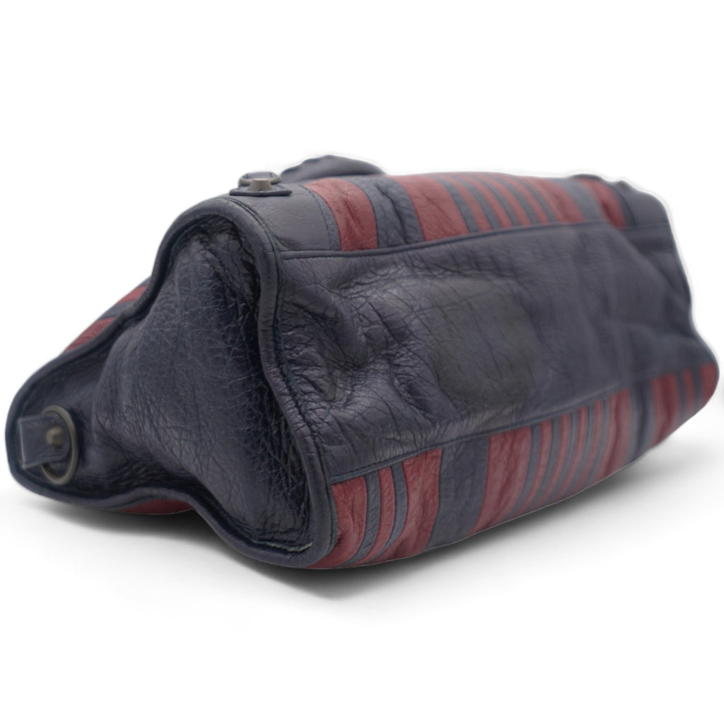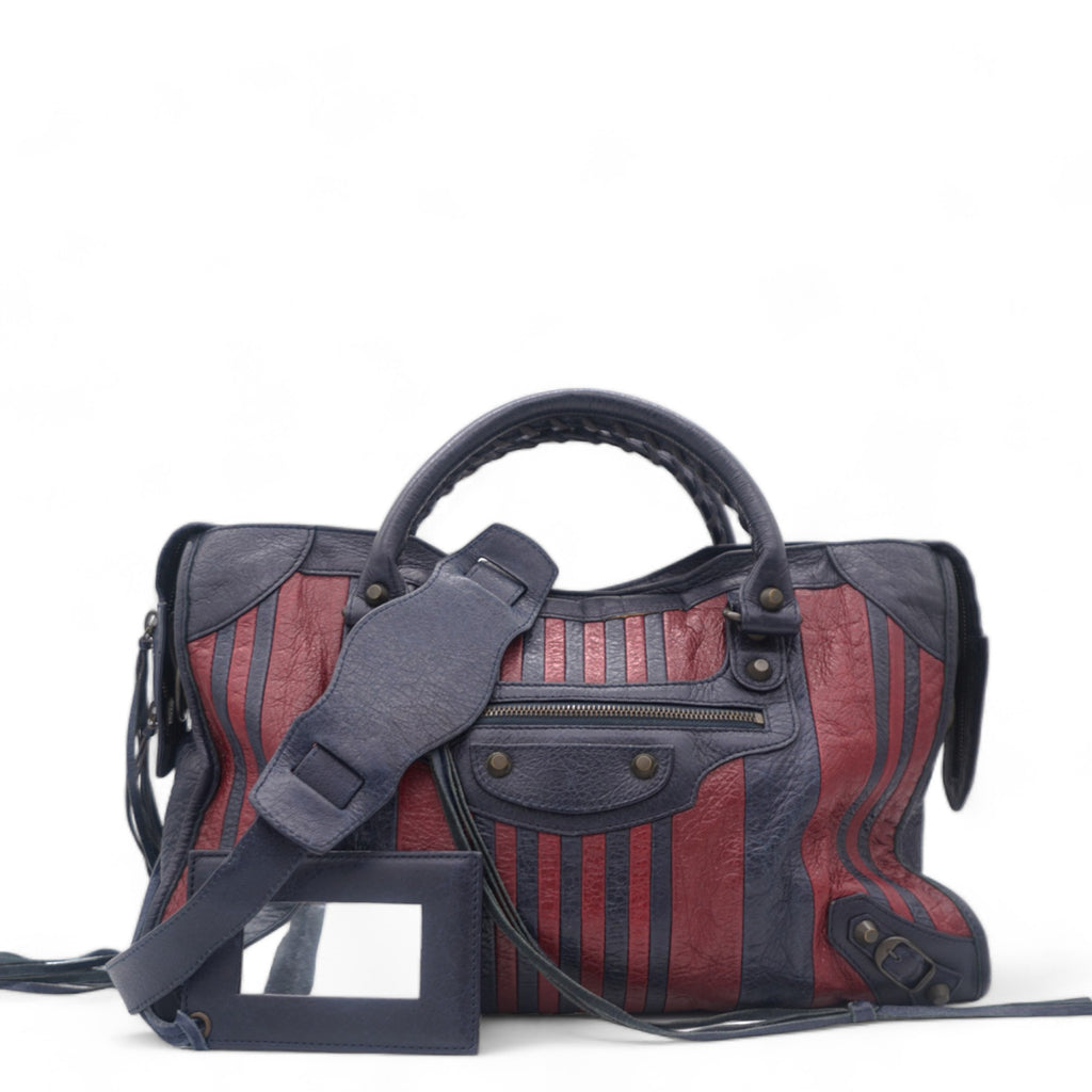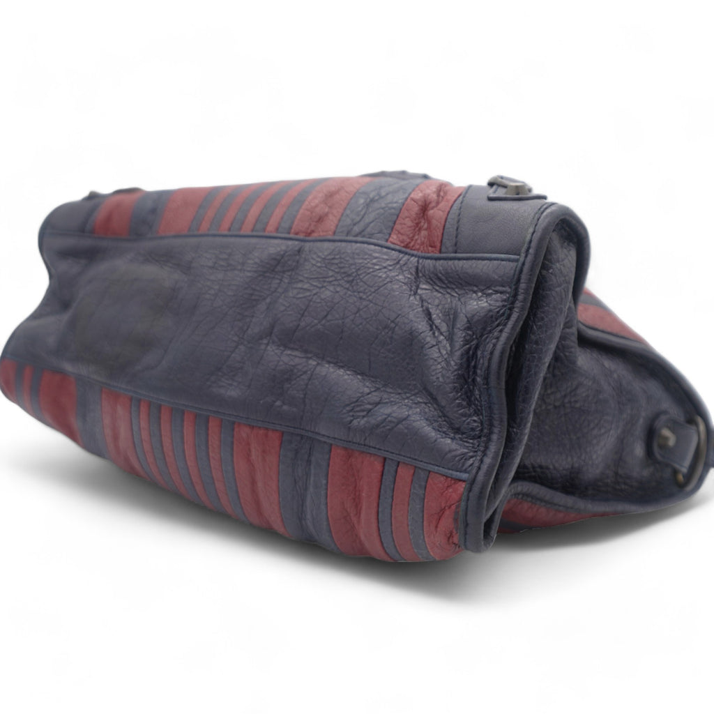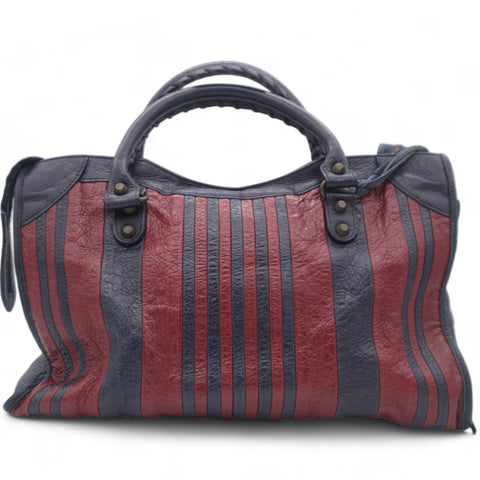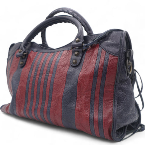 | This chic tote is crafted of distressed calfskin leather in red and navy blue, embellished with aged brass buckles and studs. The bag features a front zipper pocket with a removable mirror, rolled leather top handles with handwoven whipstitch detail, and an optional, adjustable shoulder strap with aged brass hardware. The overextended top zippers open the bag to a black fabric interior with zipper and patch pockets. |
