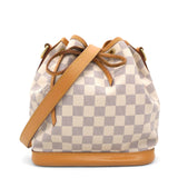 | The bag features vachetta cowhide leather at the base, a pull cinch cord, an adjustable leather shoulder strap, and polished brass hardware including eyelets and links. The pull opens to a beige fabric interior. |