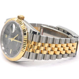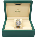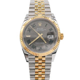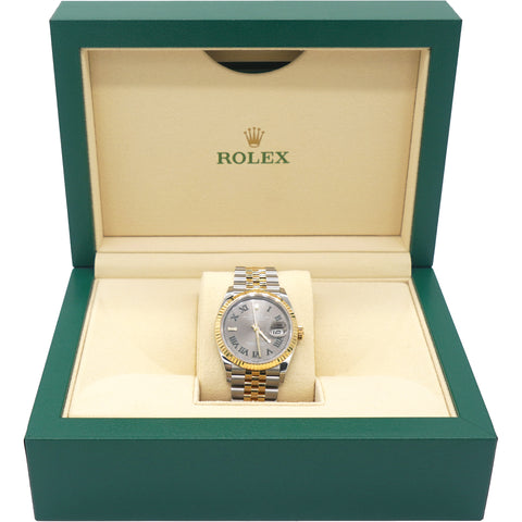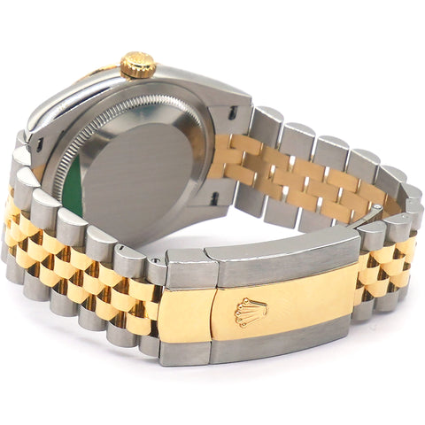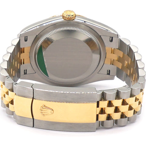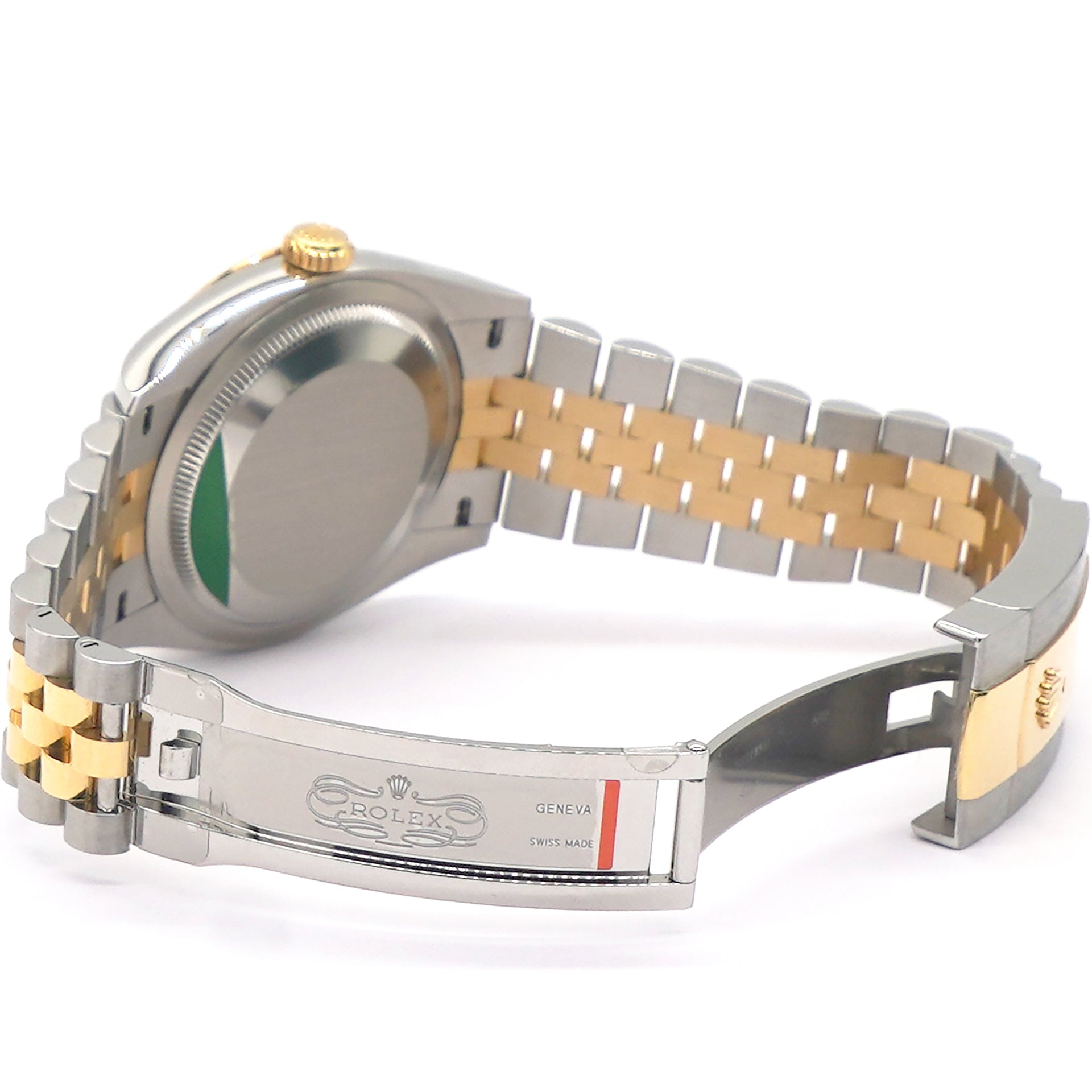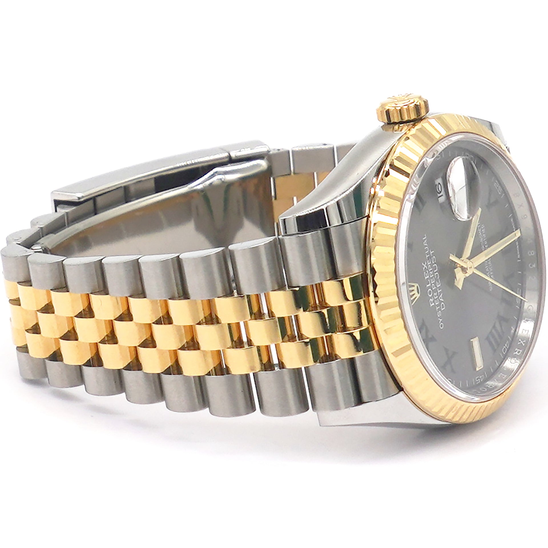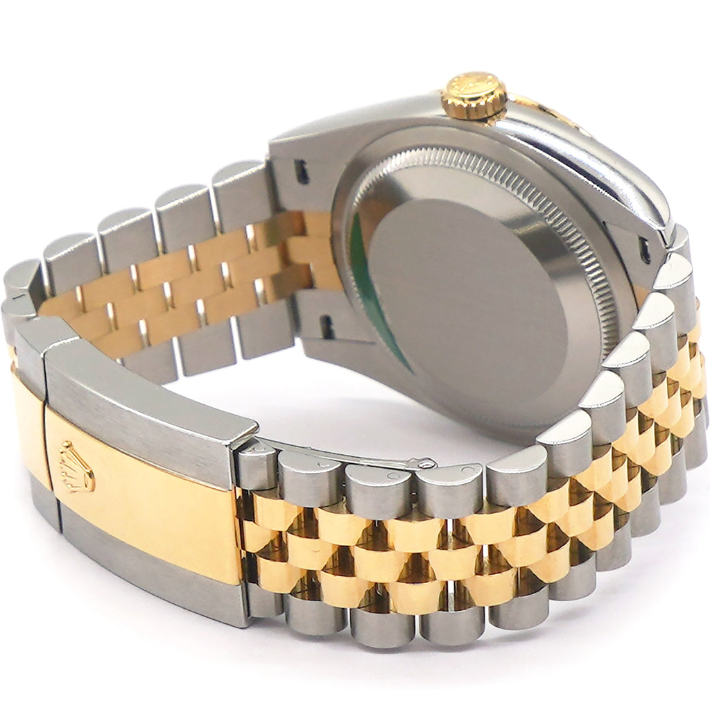 | This oyster perpetual datjust in oystersteel and yellow gold, with a rhodium dial, green roman numeral marks and a jubilee bracelet and finished with a yellow gold fluted bezel. |