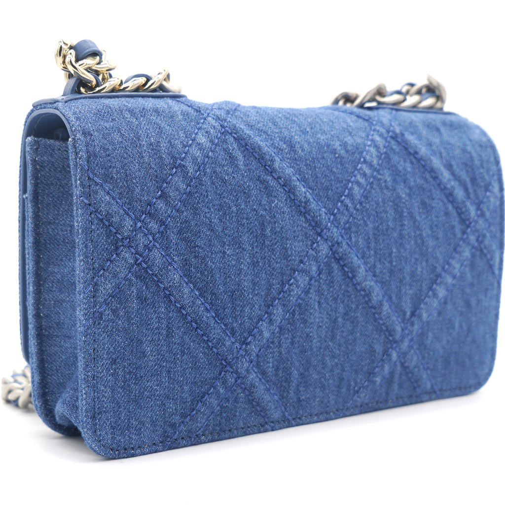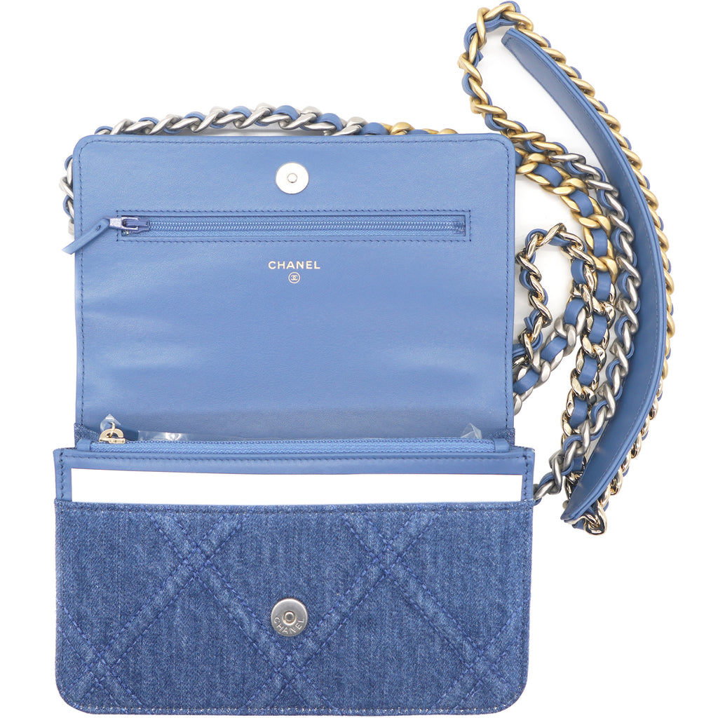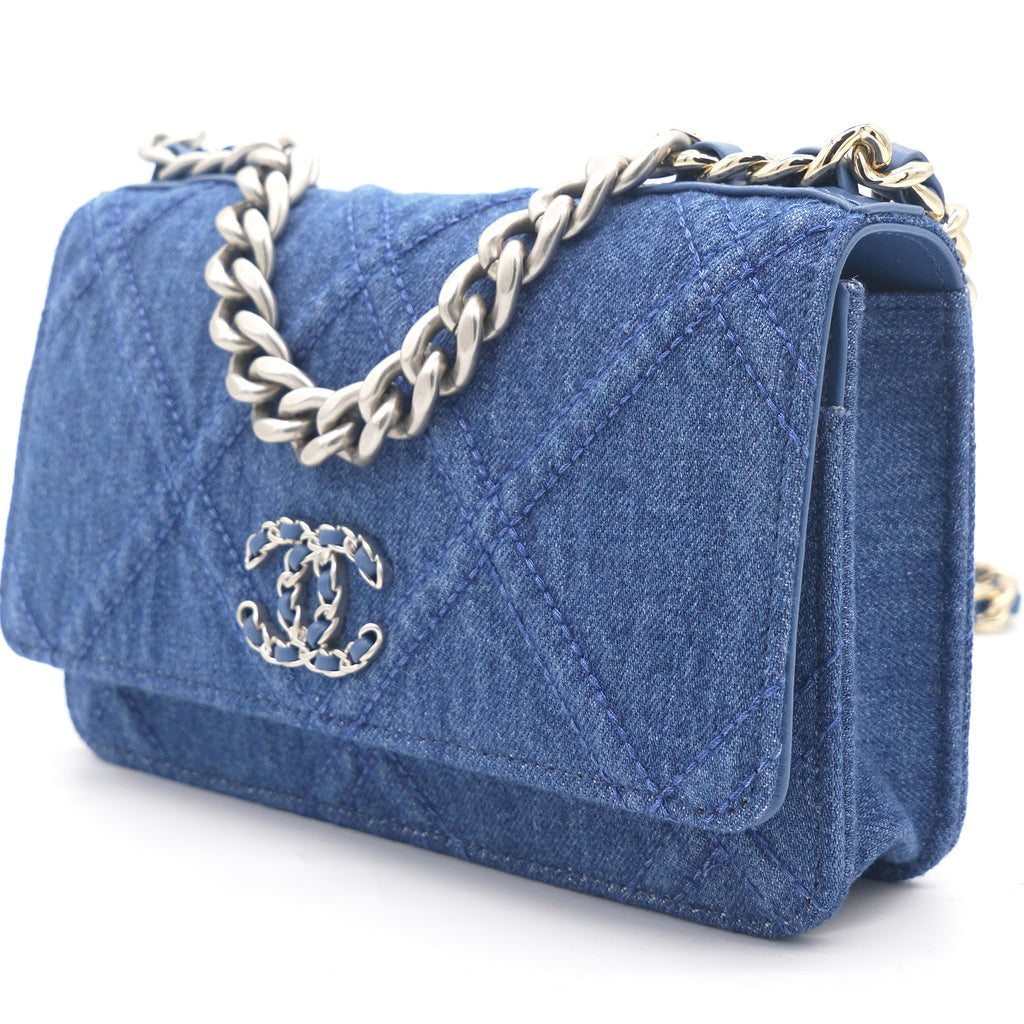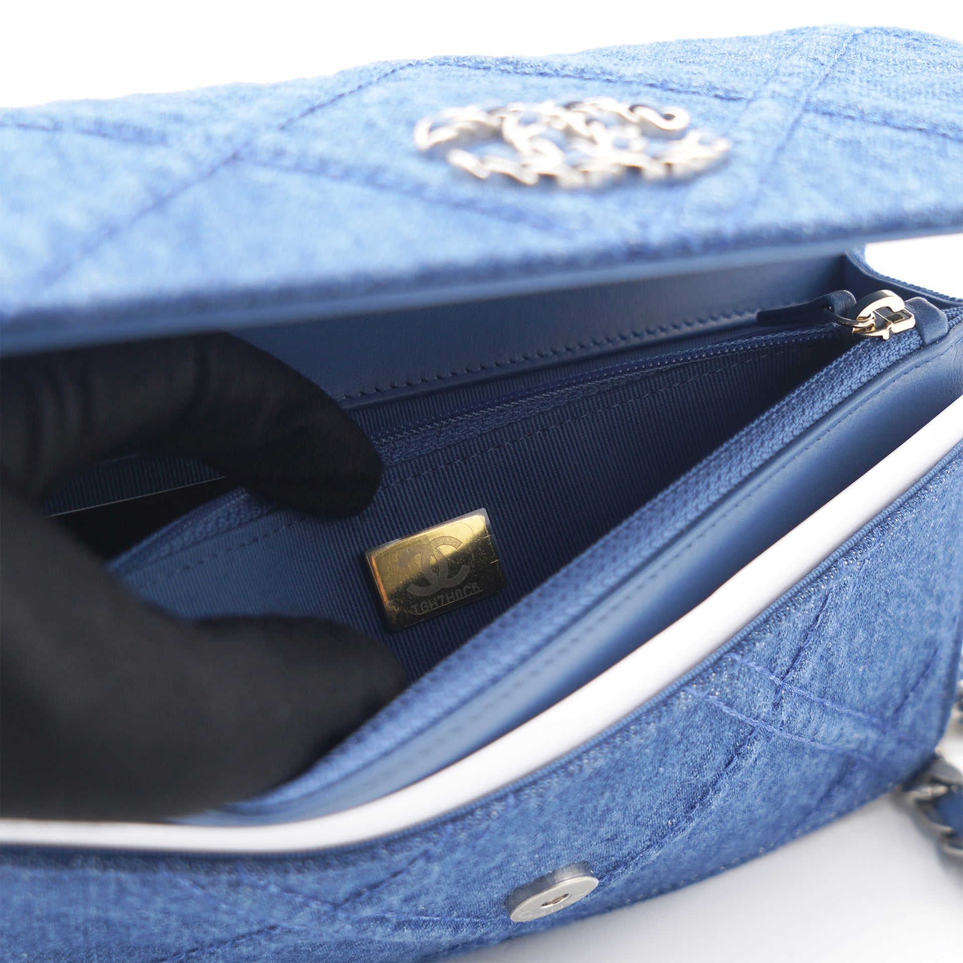 | First unveiled in the Chanel Fall 2019 collection, the Chanel 19 bag is named after the year of its release, just like the Chanel 2.55. In design, the bag has exaggerated quilting and hardware in both gold, silver and ruthenium. The bag has a CC twist-lock and a small chain handle to be carried by hand. This WOC version in Denim Blue is made from quality leather and lined with canvas. |
