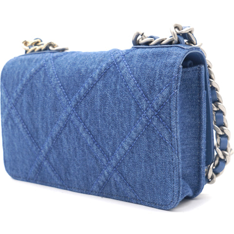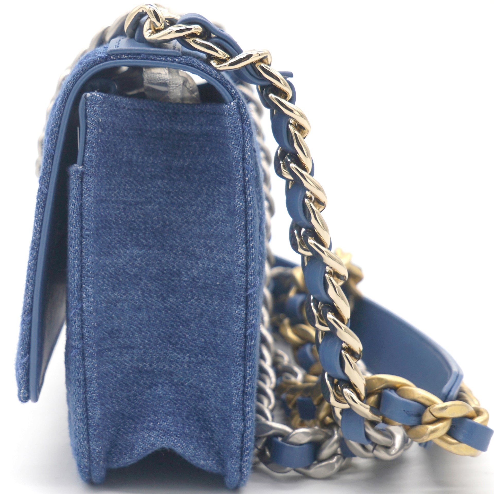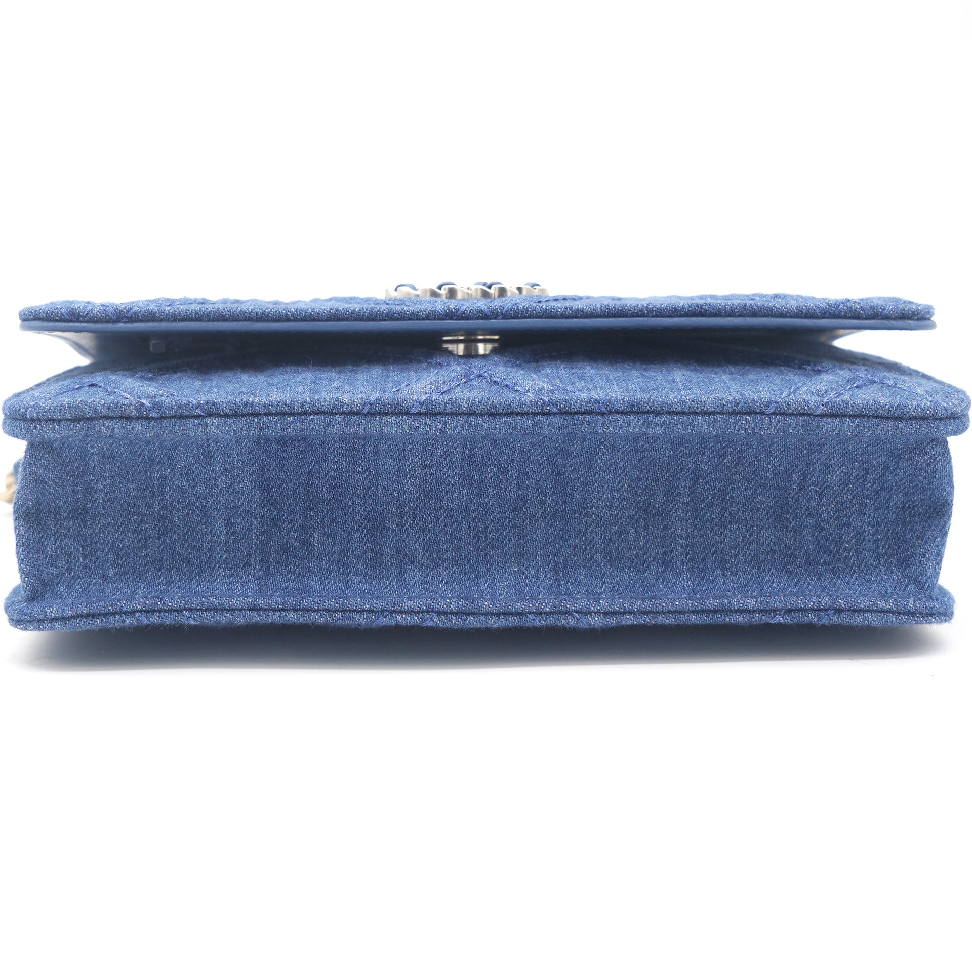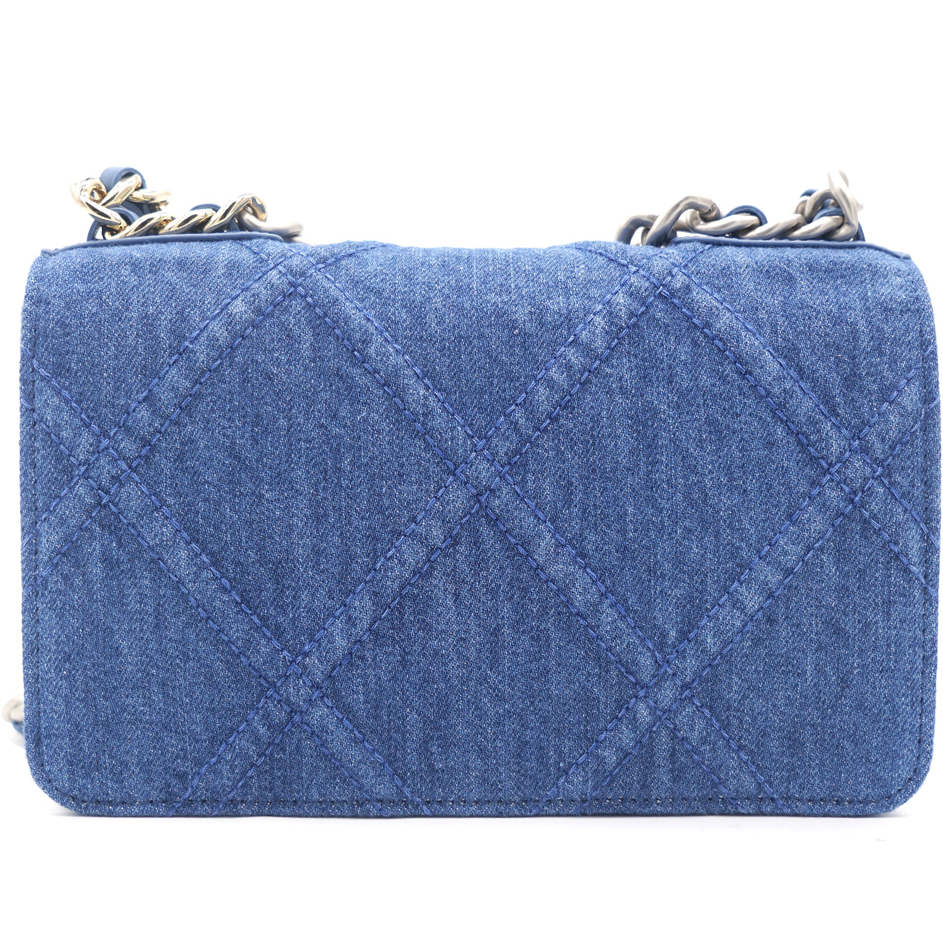 | First unveiled in the Chanel Fall 2019 collection, the Chanel 19 bag is named after the year of its release, just like the Chanel 2.55. In design, the bag has exaggerated quilting and hardware in both gold, silver and ruthenium. The bag has a CC twist-lock and a small chain handle to be carried by hand. This WOC version in Denim Blue is made from quality leather and lined with canvas. |